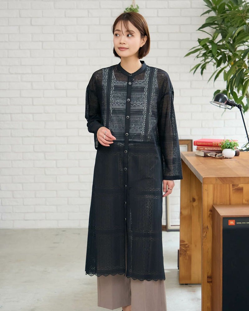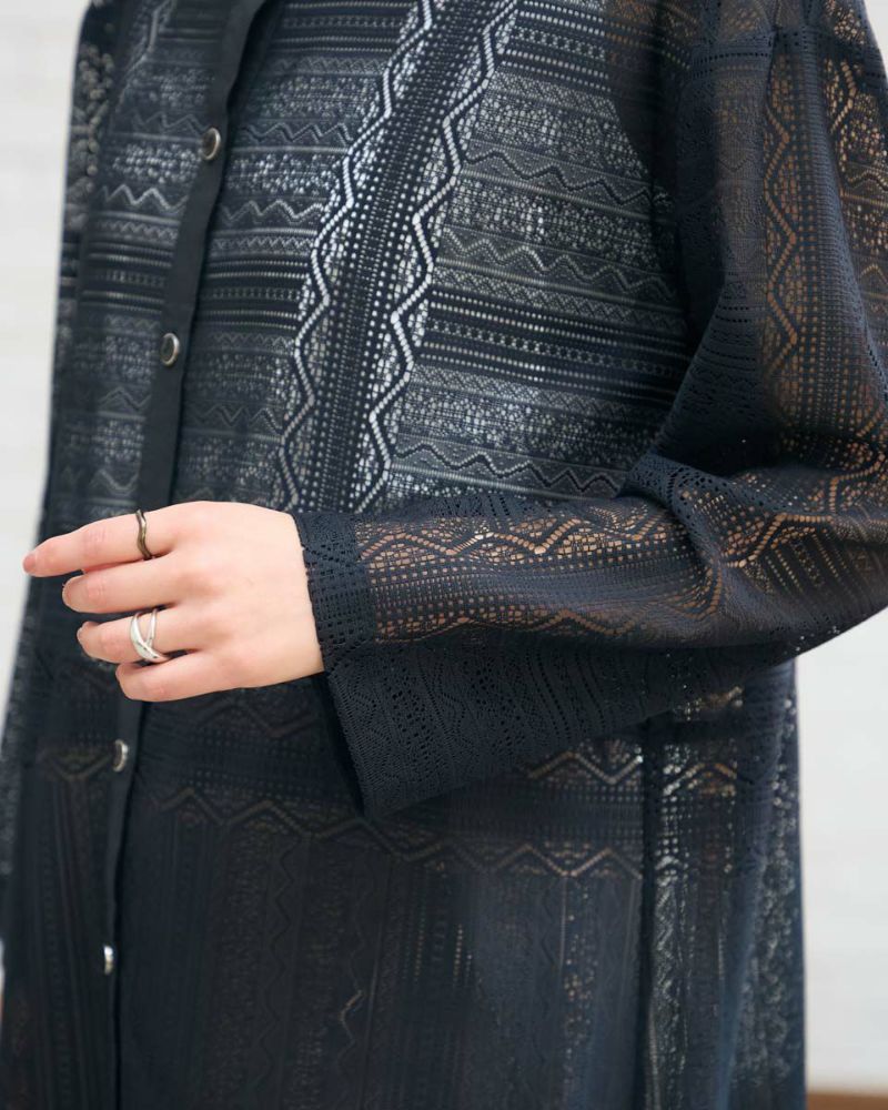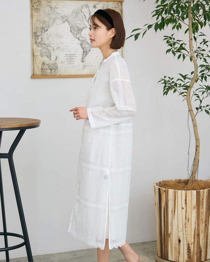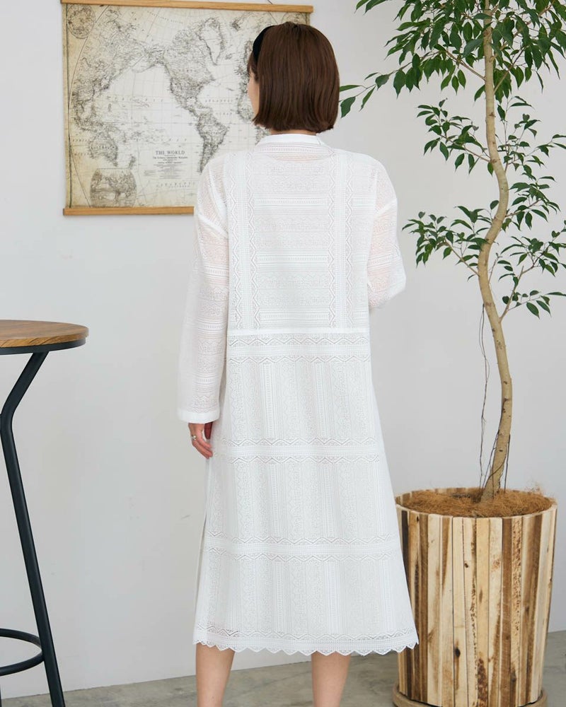 ポリエステル100%のラッセルレースを使用したワンピースです。裏地のスリップドレスを付けています。デザインは低いスタンドカラーの前開きロングシャツ型ですので、ワンピースとして又は前を開けてロングシャツ羽織としてもお召しいただけます。裾はレースの柄に合わせスカラ状にハンドカットしています。色はアイボリーとブラックの2色展開です。本体とアンダードレスは取り外し可能です。