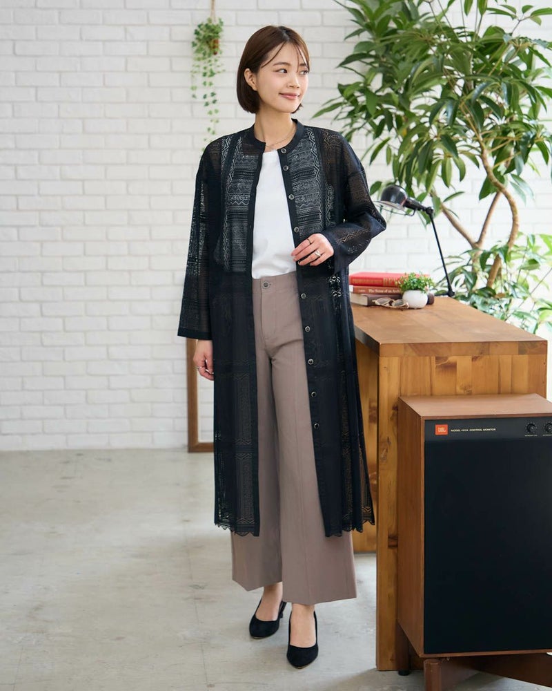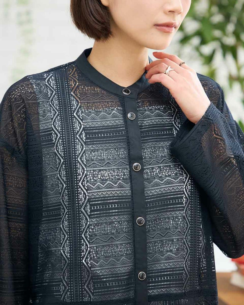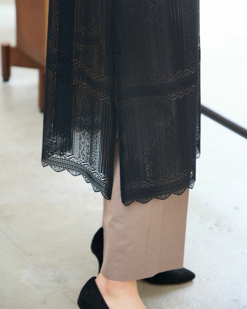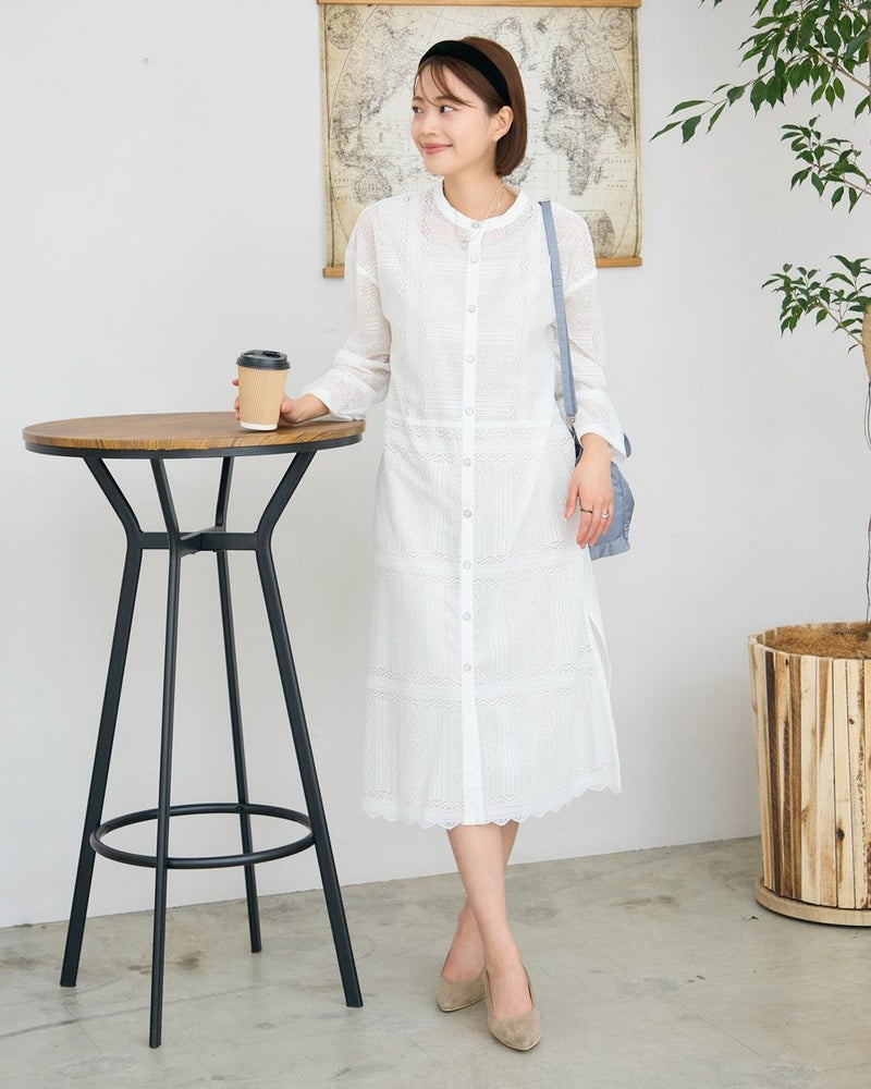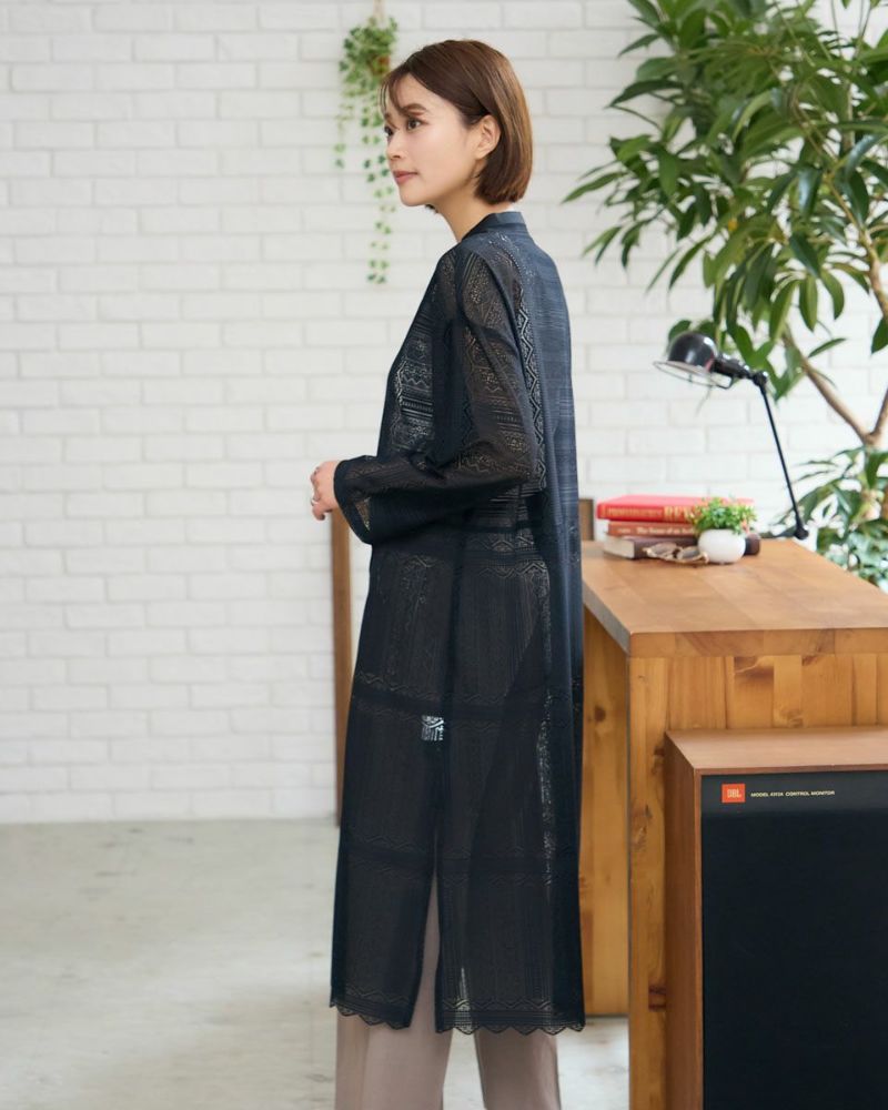 ポリエステル100%のラッセルレースを使用したワンピースです。裏地のスリップドレスを付けています。デザインは低いスタンドカラーの前開きロングシャツ型ですので、ワンピースとして又は前を開けてロングシャツ羽織としてもお召しいただけます。裾はレースの柄に合わせスカラ状にハンドカットしています。色はアイボリーとブラックの2色展開です。本体とアンダードレスは取り外し可能です。