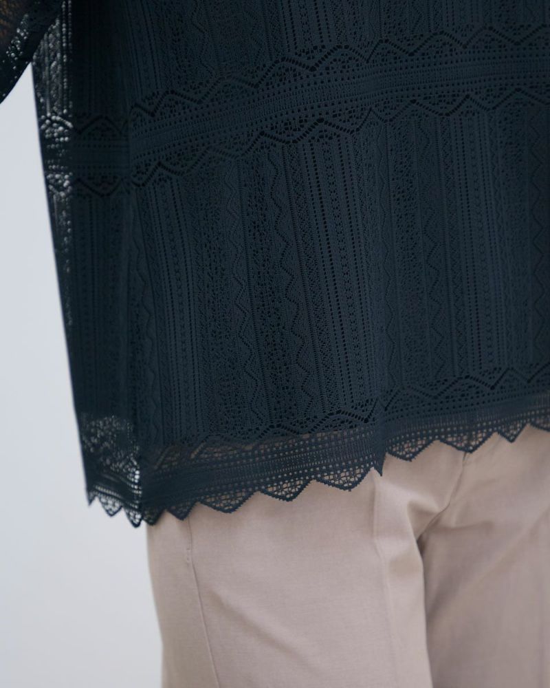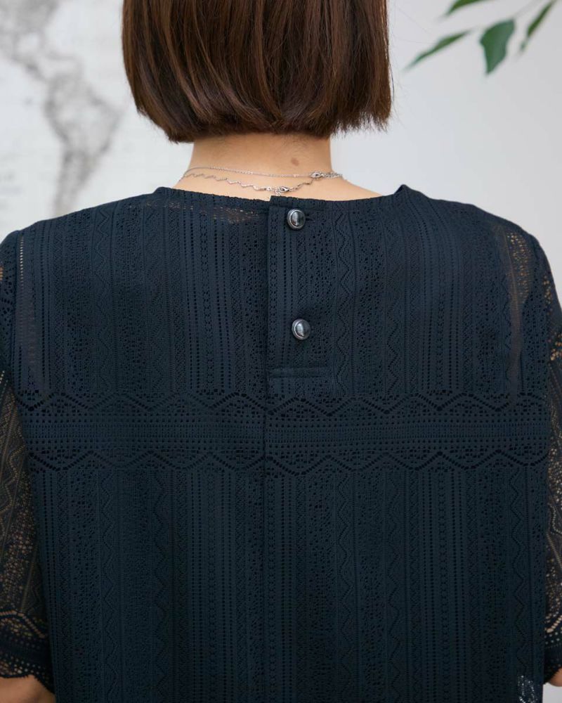 ポリエステル100%のラッセルレースを使用したブラウスです。裏地にキャミソールを付けています。デザインはノーカラーの後ろ釦開き仕様です。袖口と裾はレースの柄に合わせスカラ状にハンドカットしています。色はアイボリーとブラックの2色展開です。本体とキャミソールは取り外し可能です。