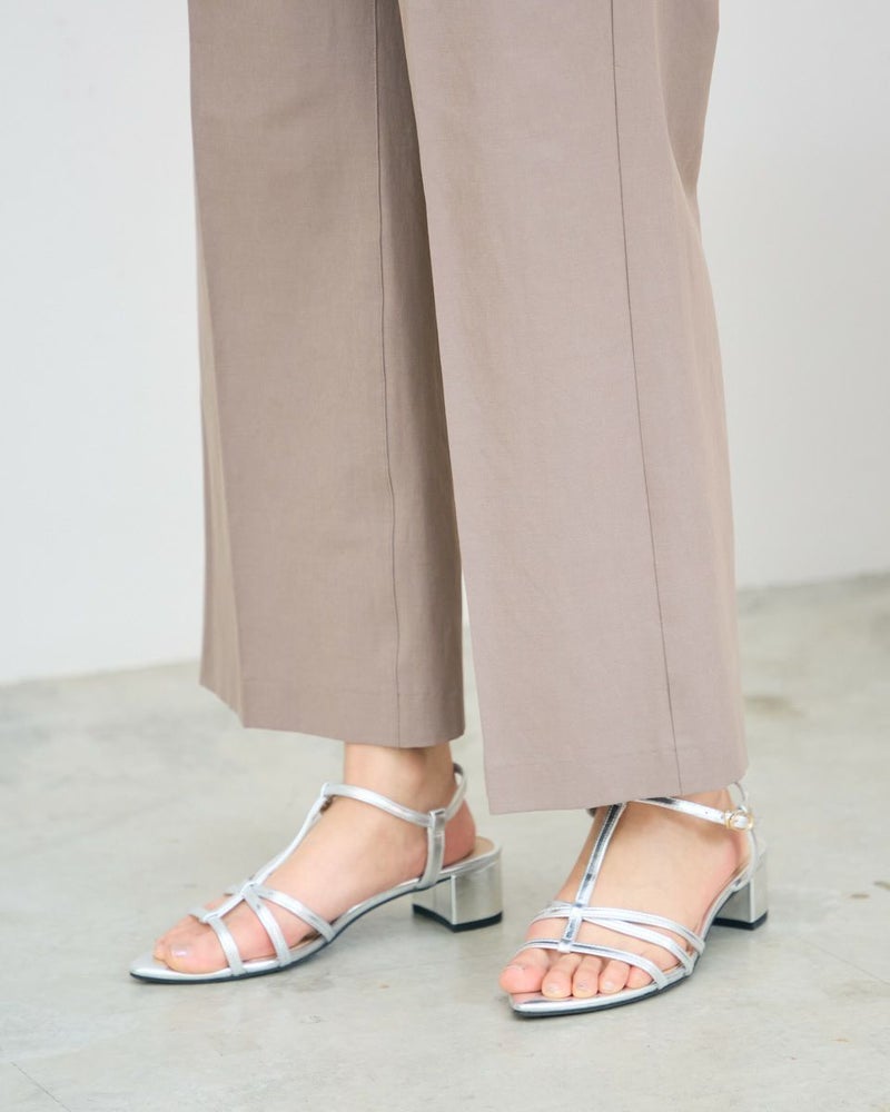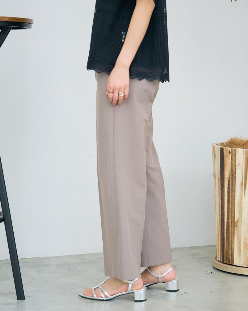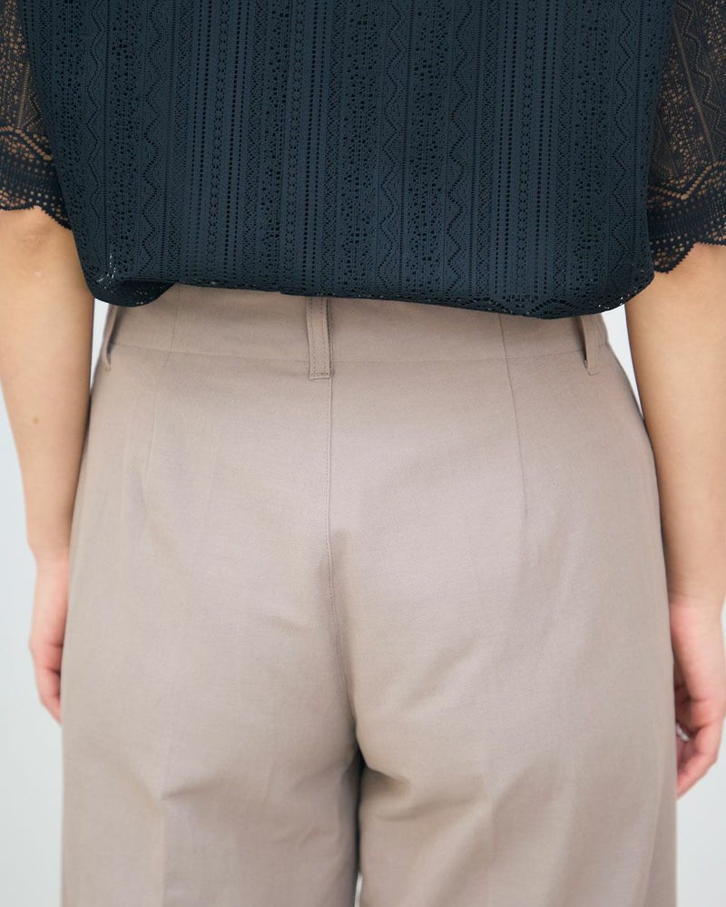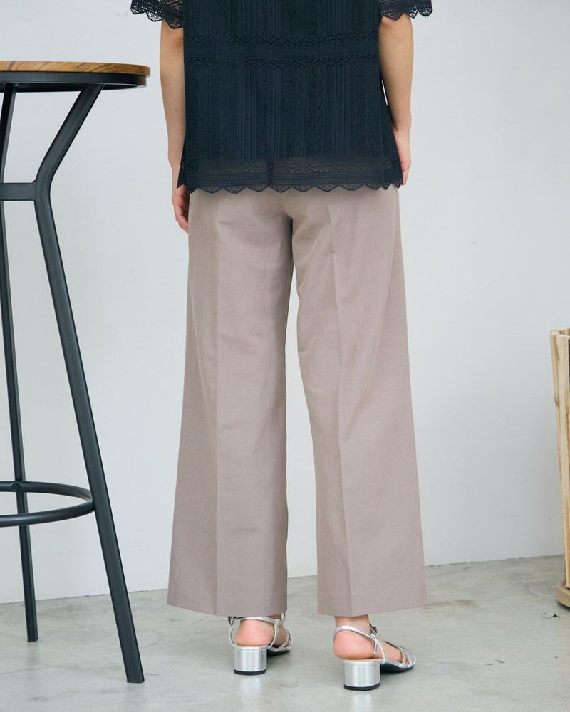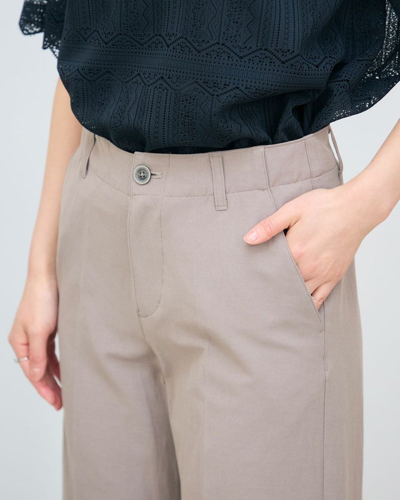 麻混の綿ポリエステル素材を使用したパンツです。生地の表面は細かい横畝のグログランタイプです。シルエットは折山プレスのセミワイドパンツです。色はベージュとブラックの2色展開です。 モデル身長: 167 cm 着用サイズ: 64 サイズ Jack Nicklaus (WOMEN) ボトムス (WOMEN) 【着用アイテム】467R3450 ポロシャツ 471R4351 ブラウス