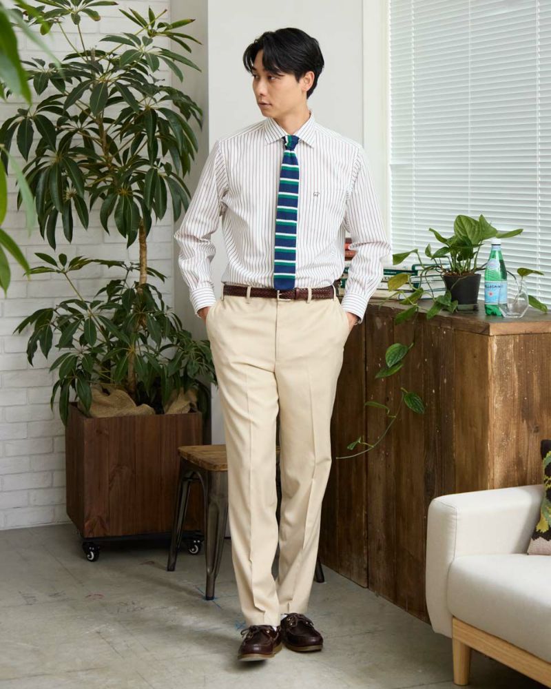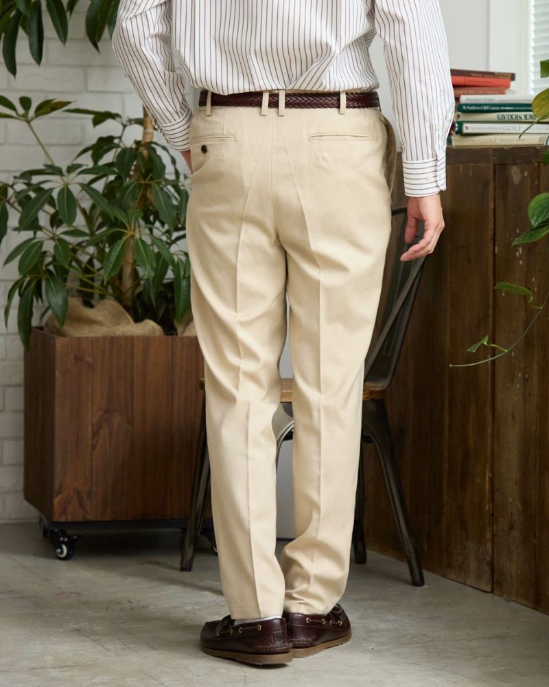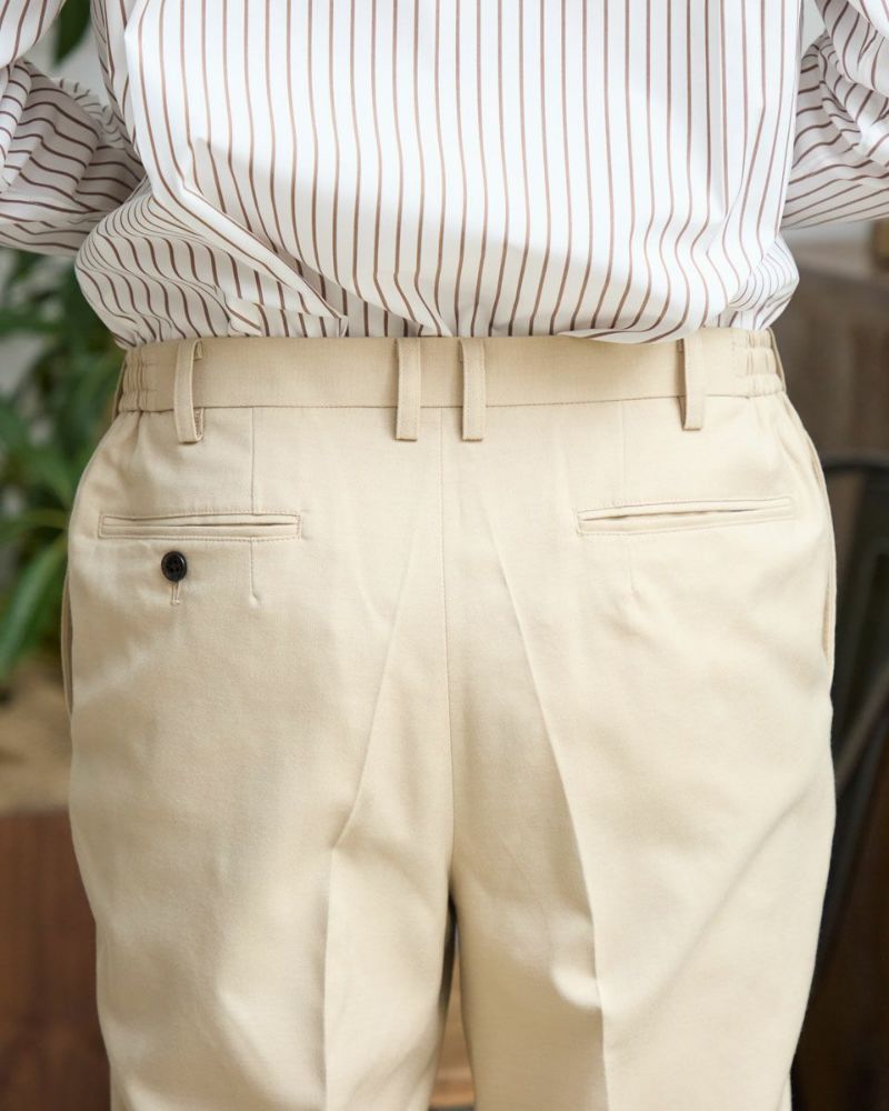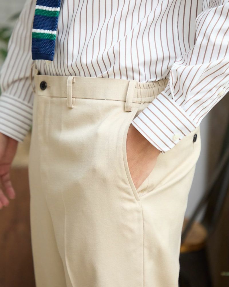 3シーズン使えるウール混のトロピカル素材を使用したスラックスです。ウエストのサイドにはゴムが入っており、ウエストは4cmほど伸縮してくれるリラックスした快適なはき心地が特徴です。ドローコードは内側に隠すことができるため、ベルトを巻くとビジネスにも対応してくれます。