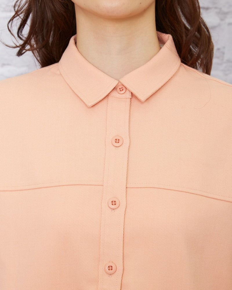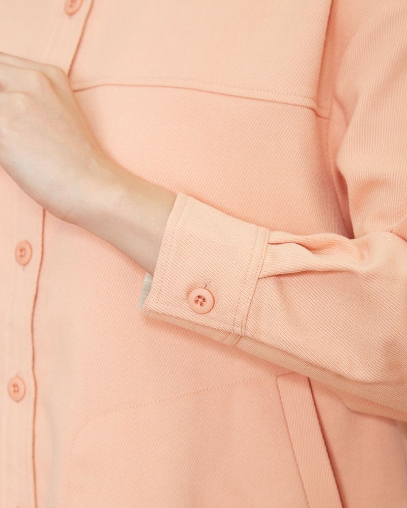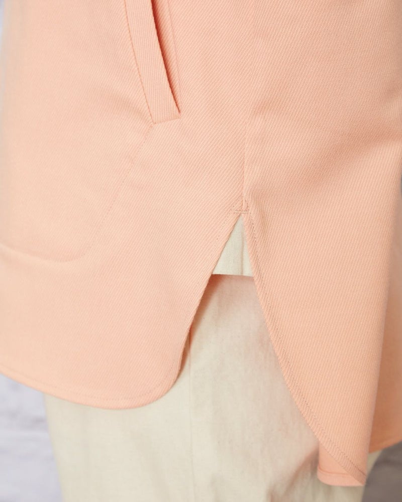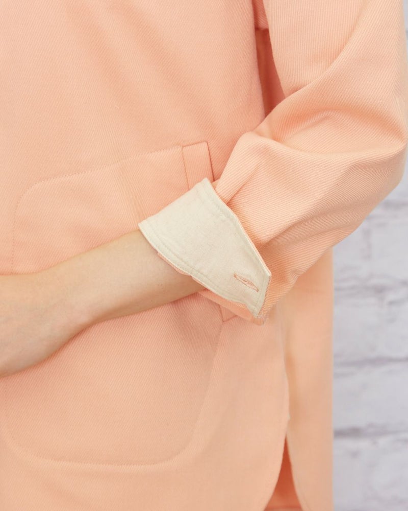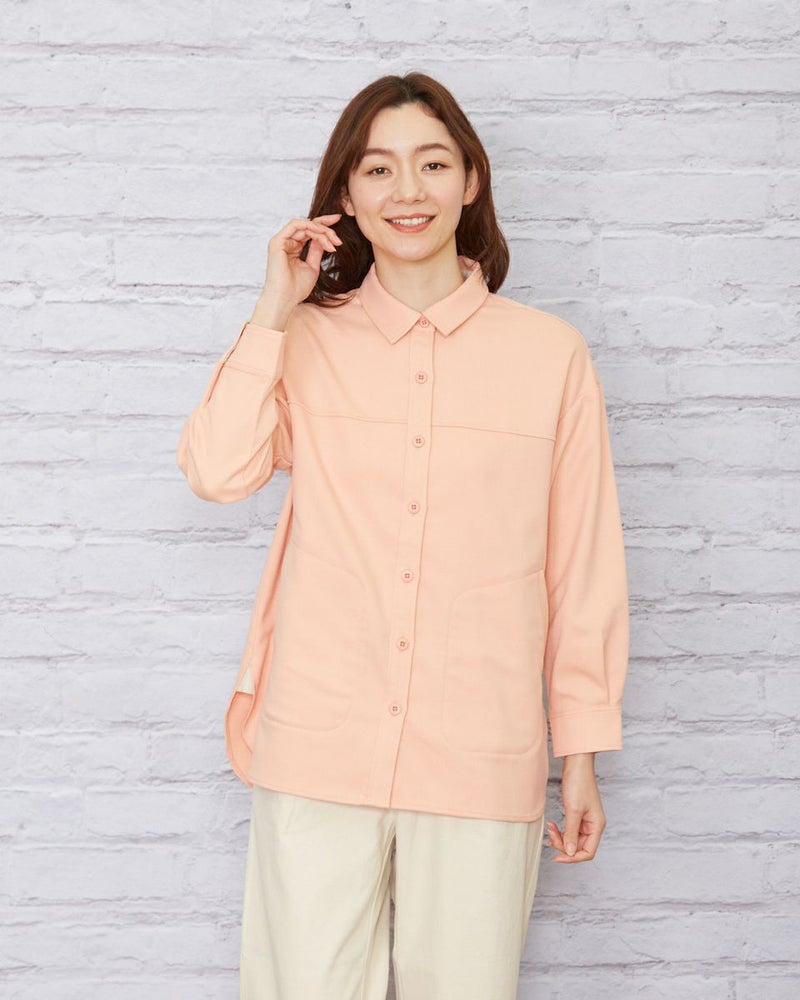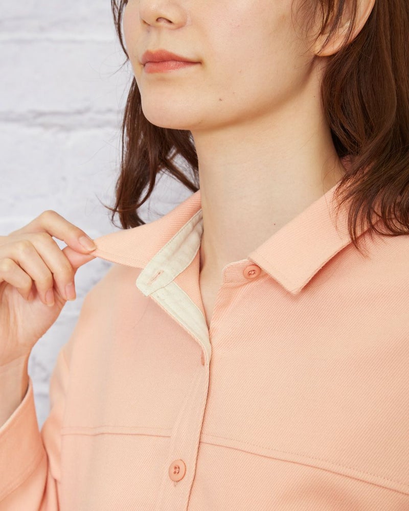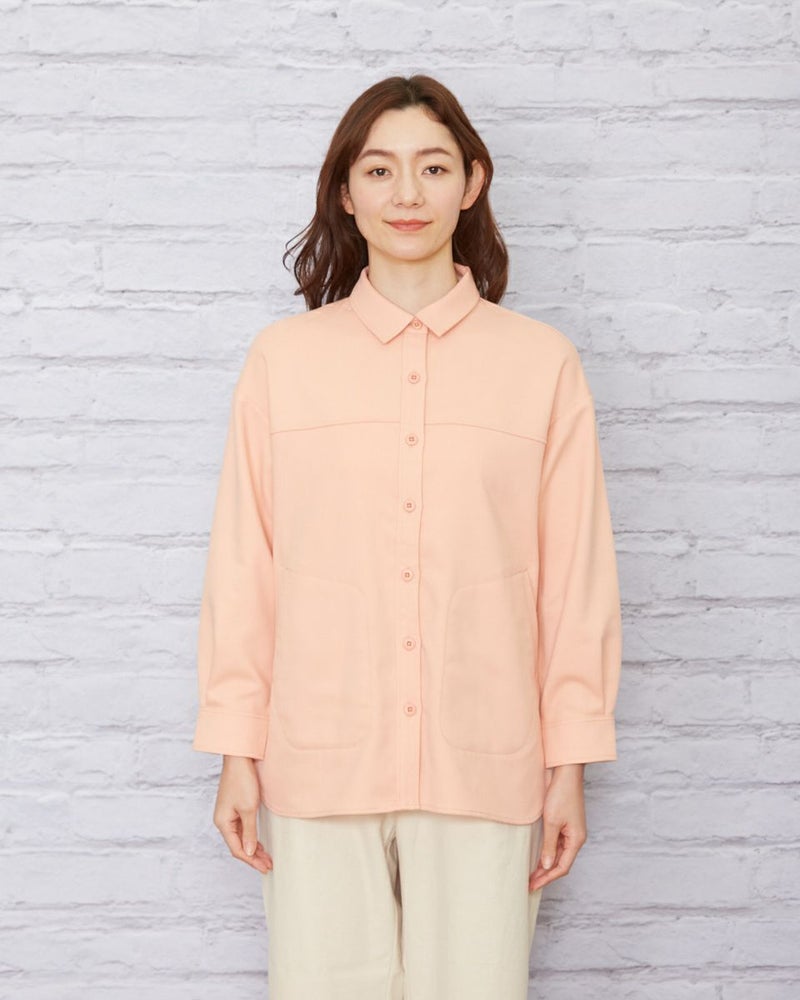 ソフトな手触りで、暖かなポリエステル混の生地を使用。肩をドロップさせた少し大きめなシルエットなので肩線を後ろに3cmほどズラし襟を抜いて着るとラフさが加わり垢抜けます。胸のヨーク切り替えやステッチの効いたポケットなどワーク調のディティールなのでカジュアルなアイテムはもちろん、綺麗めなアイテムとのMIXコーディネートも素敵です。程よく厚みもあるため羽織りとしても便利。春らしいオレンジボディはインナーをオフカラーにしたりボーダーTシャツを合わせるとコーディネートも簡単にまとまります。