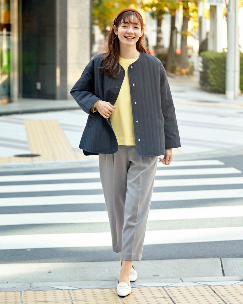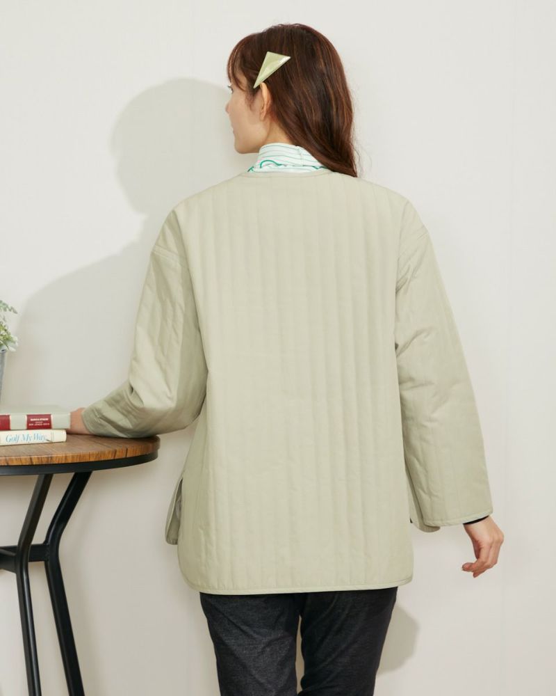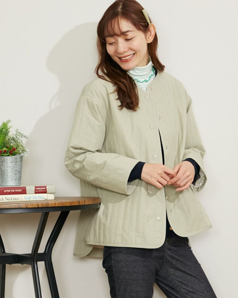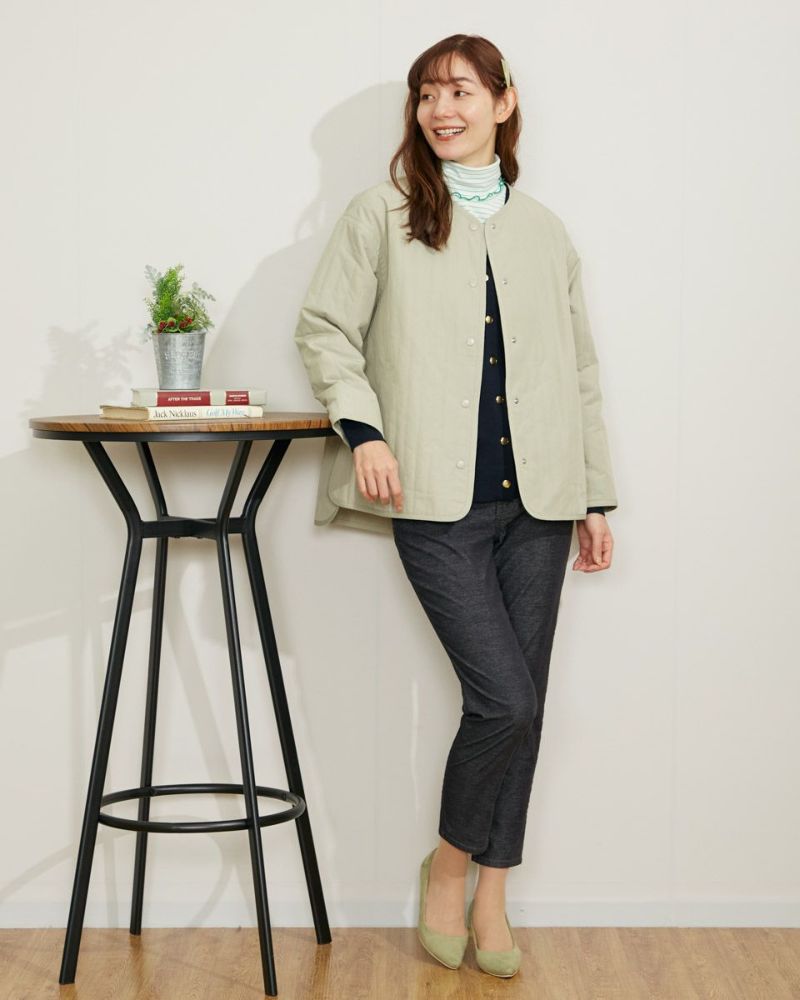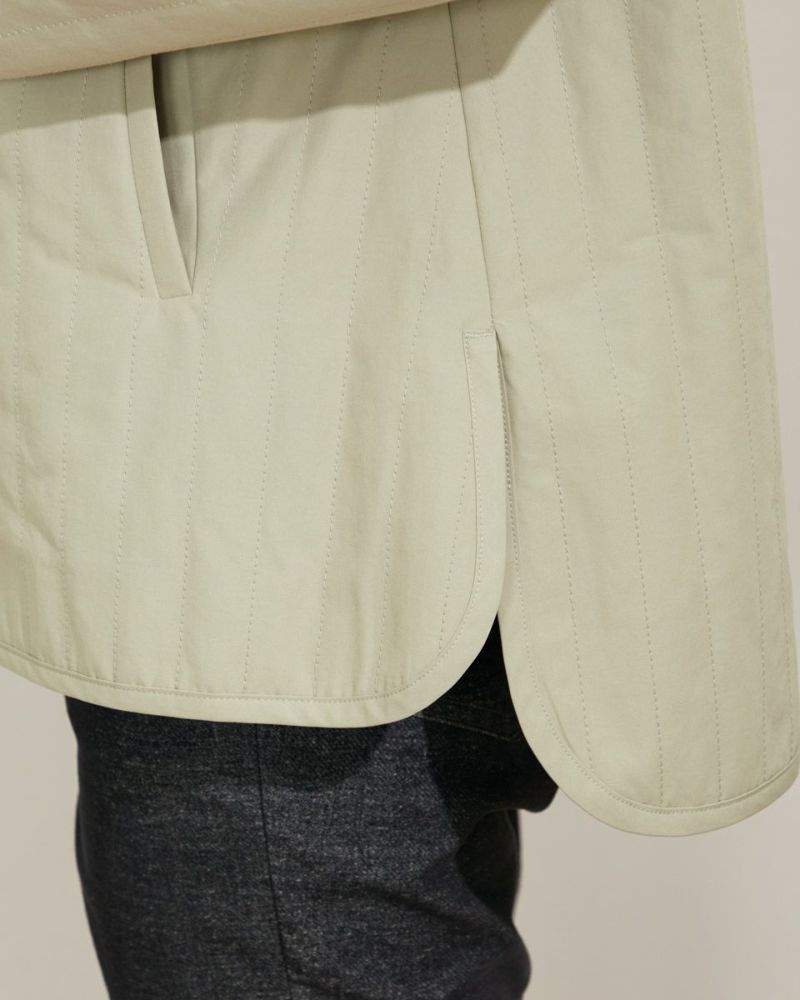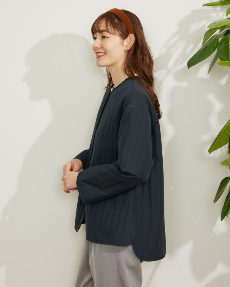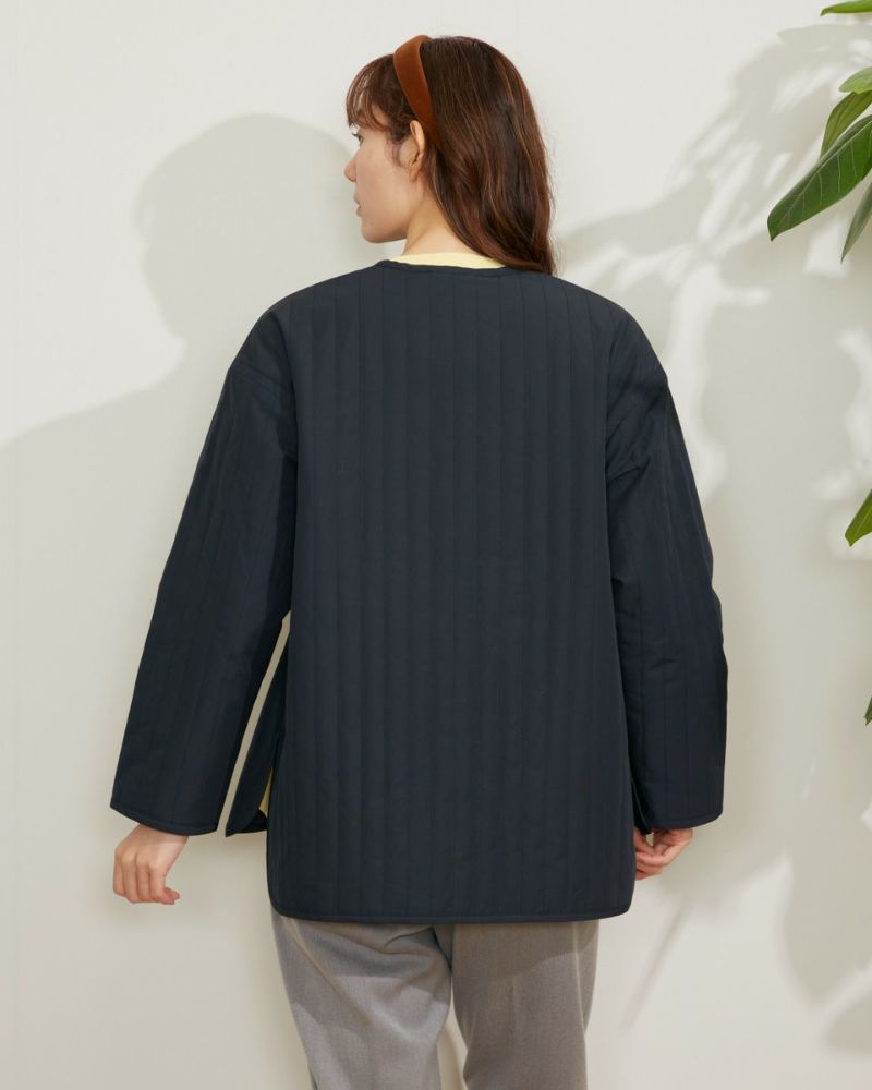 春先まで使える軽くて薄い中綿キルトのご紹介です。今年はマットでコットンタッチの生地をセレクト。中綿を薄く40g挟み2.5cm間隔のストライプ状にキルトステッチをかけました。光沢が少ないためスポーティーさが消え、よりデイリーにお召しいただける1着になっています。トレンド感のあるオーバーシルエットですが、縦に流れるステッチと、前後差のある裾のラインで着膨れせずスッキリとお召しいただけます。袖付け位置を下げ肩や腕にゆとりを出しているため地厚なインナーとの重ね着もスムーズ。ボトムスを選ばず、通勤の他、お子様の送迎時の着用もおすすめです。 モデル身長: 171 cm 着用サイズ: M サイズ Golden Bear White Label (WOMEN) アウター (WOMEN) 【着用アイテム】468Q1450 タートルネックカットソー 468Q1650 Vネックカーディガン 468Q1750 ツータックテーパードパンツ