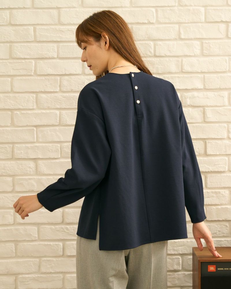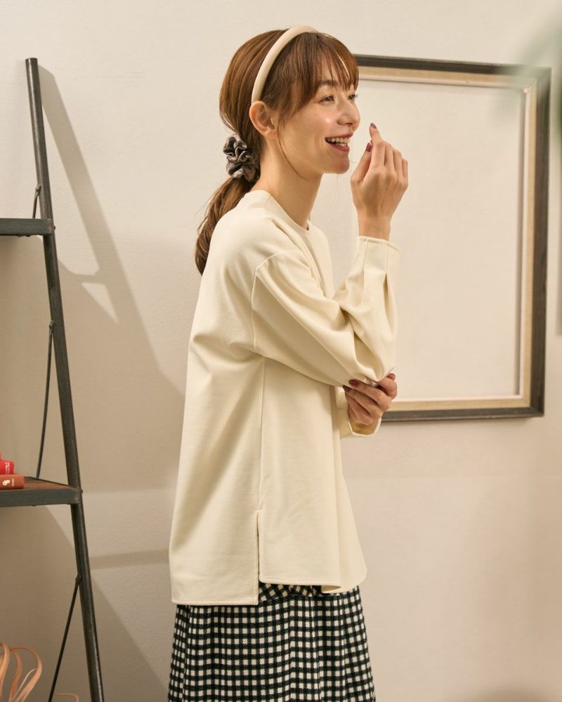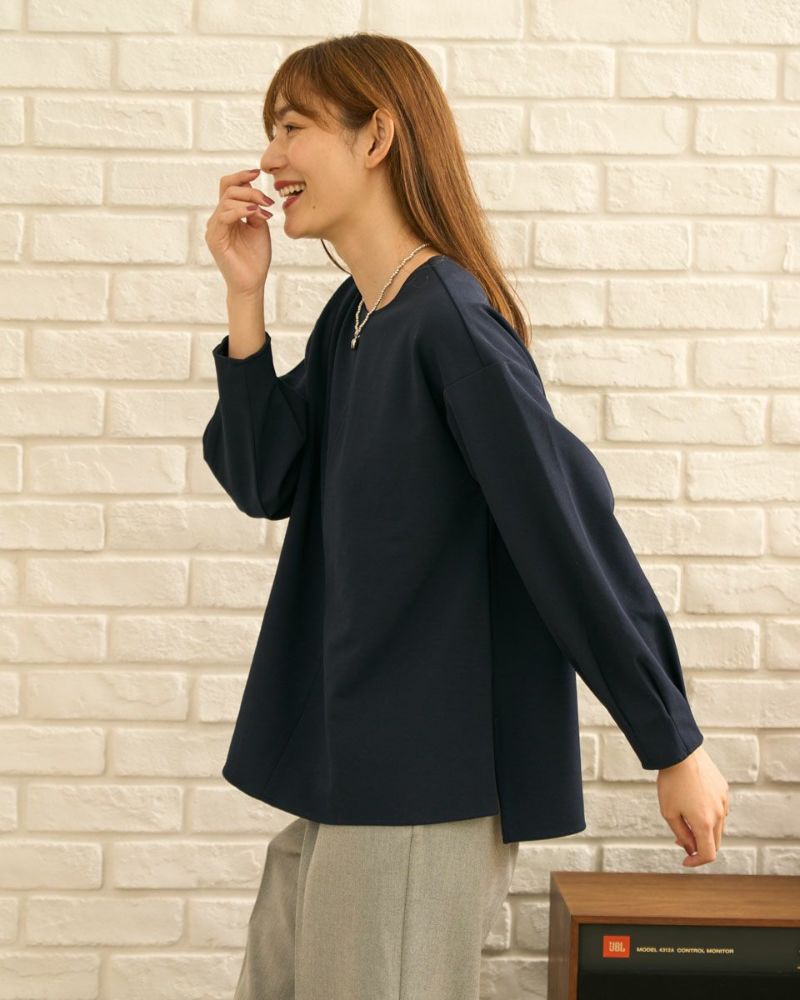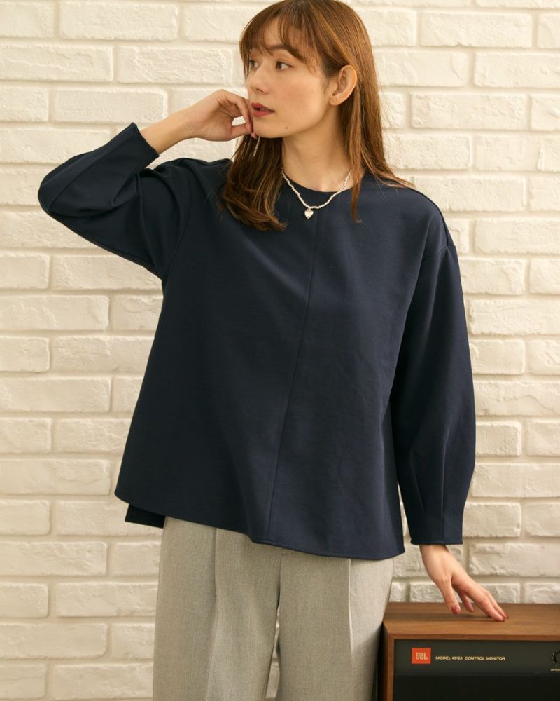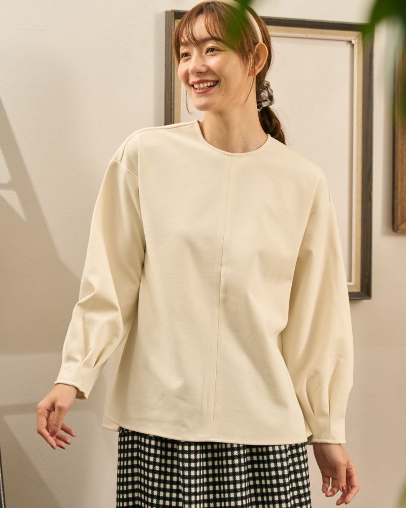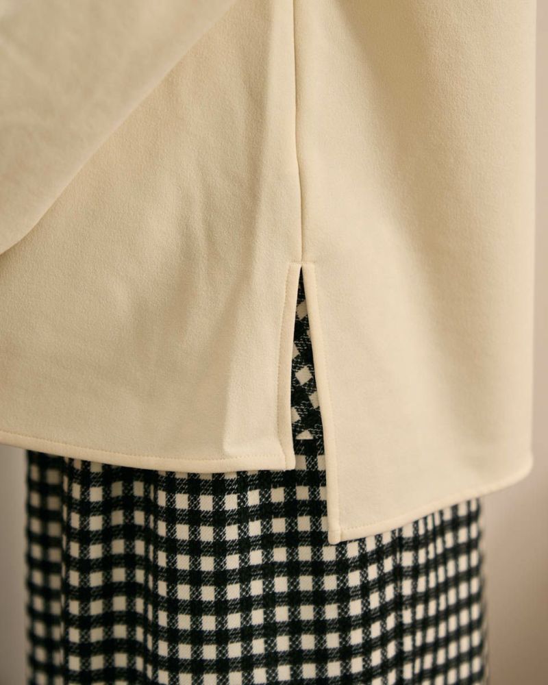 生地表面に細かいシボが有り、品の良さが感じられるカットソージョーゼットをセレクト。裏面に薄く起毛をかいているため肌当たりもソフトで気温の下がる季節におすすめのアイテム。小さめに設定したネックラインは肌露出を抑え腹部にかかる着丈で気になる部分をしっかりカバー。ヨコ方向のテンションに優れ肘や肩の強張りを気にせず着用でき、同素材468QD761 のパンツとセットアップで着用が可能。その時、裾をウエストにタックインすると動きが足され間延び感を軽減。ネックレスとの相性も良いため光を添えてオフィスや学校行事でお召しになっても素敵です モデル身長: 171 cm 着用サイズ: M サイズ Golden Bear White Label (Ladies') ブラウス (Ladies') 【着用アイテム】467QE702 ストレートパンツ 468QD751 スカート 468QD761 ジョガーパンツ 468QE050 チェックマフラー