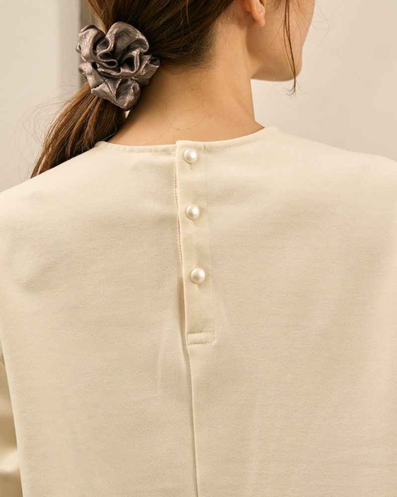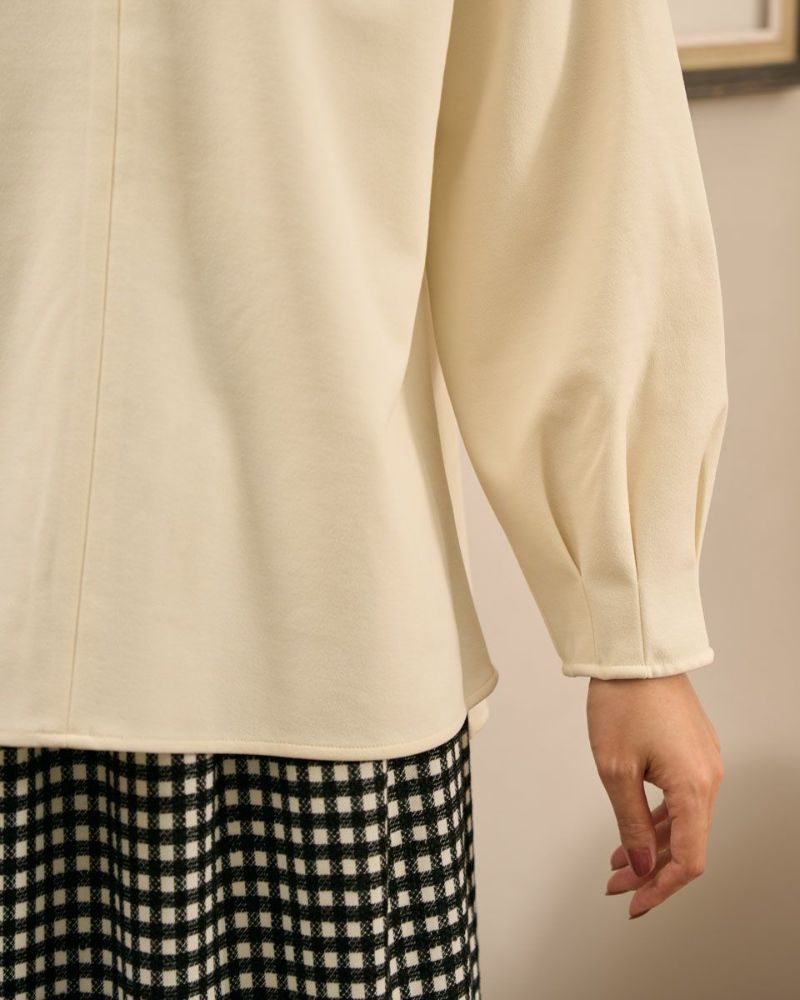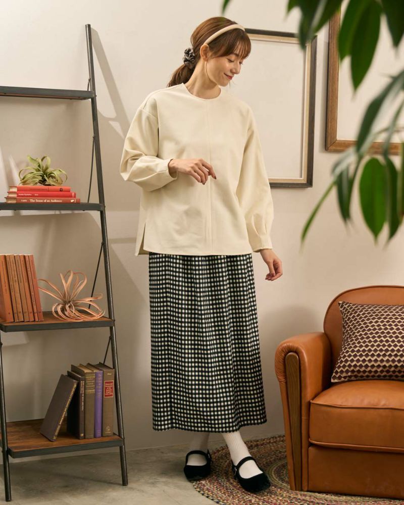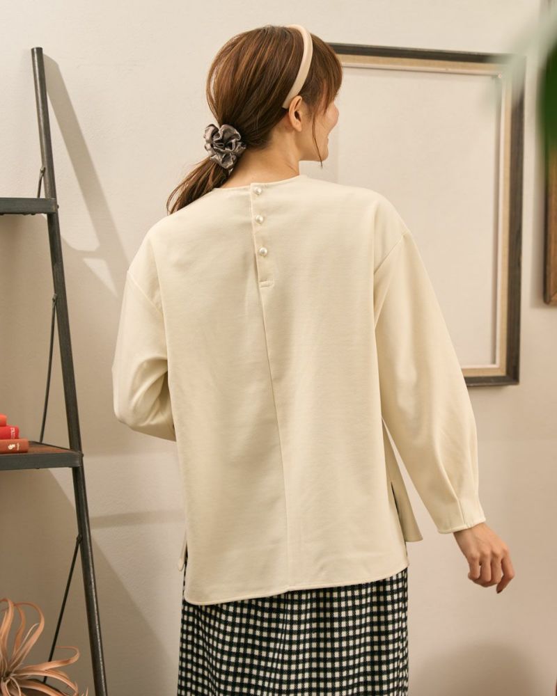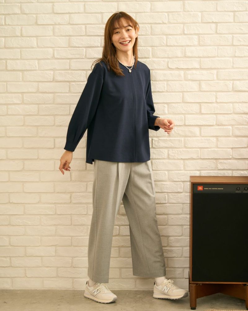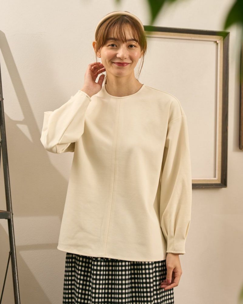 生地表面に細かいシボが有り、品の良さが感じられるカットソージョーゼットをセレクト。裏面に薄く起毛をかいているため肌当たりもソフトで気温の下がる季節におすすめのアイテム。小さめに設定したネックラインは肌露出を抑え腹部にかかる着丈で気になる部分をしっかりカバー。ヨコ方向のテンションに優れ肘や肩の強張りを気にせず着用でき、同素材468QD761 のパンツとセットアップで着用が可能。その時、裾をウエストにタックインすると動きが足され間延び感を軽減。ネックレスとの相性も良いため光を添えてオフィスや学校行事でお召しになっても素敵です モデル身長: 171 cm 着用サイズ: M サイズ Golden Bear White Label (Ladies') ブラウス (Ladies') 【着用アイテム】467QE702 ストレートパンツ 468QD751 スカート 468QD761 ジョガーパンツ 468QE050 チェックマフラー
