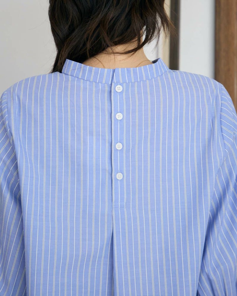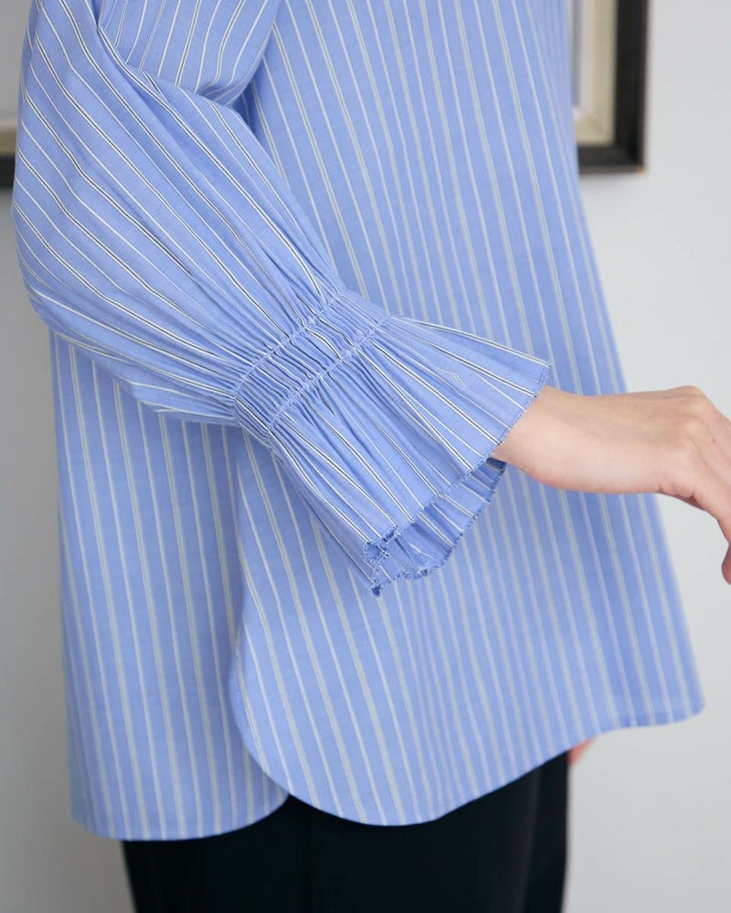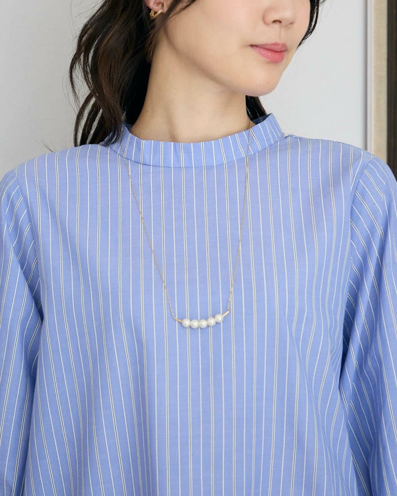 キメの整った綿ポリエステルのストライプ生地は、ほのかなツヤ感もあり上品さが魅力です。袖口に施した細かいプリーツが華やかに手元を飾り1枚着も楽しめるアイテム。低めに設定したハイネックは肌露出を減らし、ロングネックレスを添えた着こなしもOK。春らしい爽やかな配色でジャケットやカーデと合わせたオフィススタイルの他、ジャンパースカートのインナー使いとしてもお薦めです。 モデル身長: 166 cm 着用サイズ: M サイズ Golden Bear White Label (WOMEN) ブラウス (WOMEN) 【着用アイテム】468R4351 ジャンパースカート 468R4750 ストレートパンツ