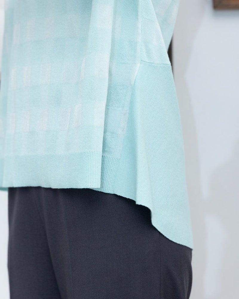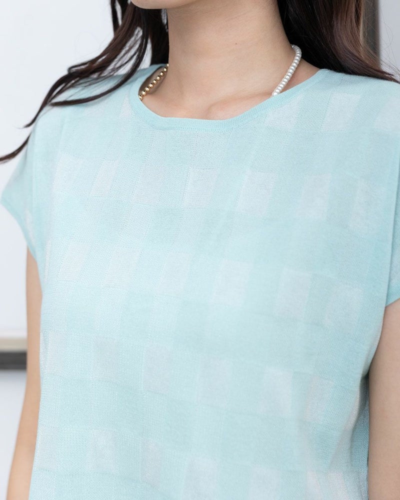 シャリみとシアー感で見た目にも涼しいジャカードのニットプルオーバーです。プレーンな糸と透ける糸を使い2.5cmほどのギンガムチェックを表現した身頃がチャーミングな1着。フレンチスリーブで肩を優しく包み後裾のラッフルで華やかさもプラス。裾をアウトにしパンツ合わせがバランス良くお召しいただけます。きちんと感もあるためオフィスや学校行事での着用もお薦め。手元を飾って二の腕から視線を外す着方もお薦めです。 モデル身長: 168 cm 着用サイズ: M サイズ Golden Bear White Label (WOMEN) ニット (WOMEN) 【着用アイテム】468R3760 ストレートパンツ 468R4760 サスペンダーパンツ