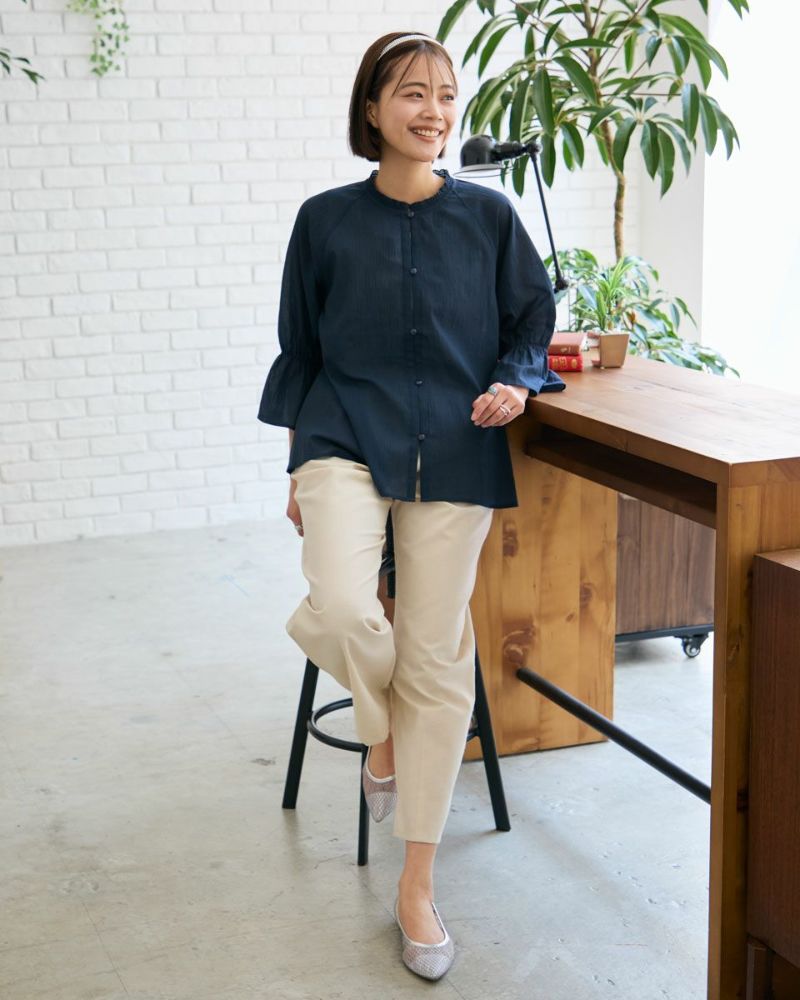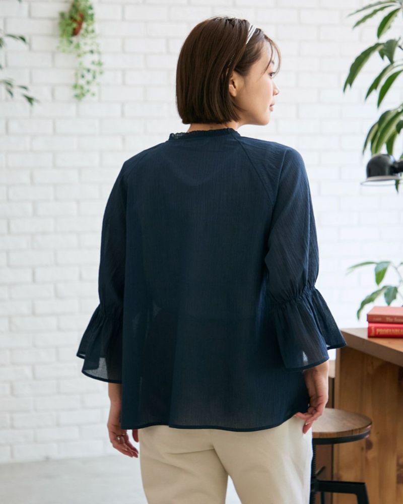 ちりめんのような細かいシボが広がるポリエステル素材を使ったブラウスです。生地の表裏がほのかにゆらぎ、肌との接点が少ないためサラッと涼しくお召しいただけます。フレアの入ったボディと袖口が風になびく様子もフェミニンで全体的にシアー感があるためインナーの着用がおすすめ。シャーリングを寄せた襟がポイントになり1枚着を楽しむ他、冷房や日除け対策の羽織りとしても便利です。 モデル身長: 167 cm 着用サイズ: M サイズ Golden Bear White Label (Ladies') ブラウス (Ladies') 【着用アイテム】468R4760 サスペンダーパンツ