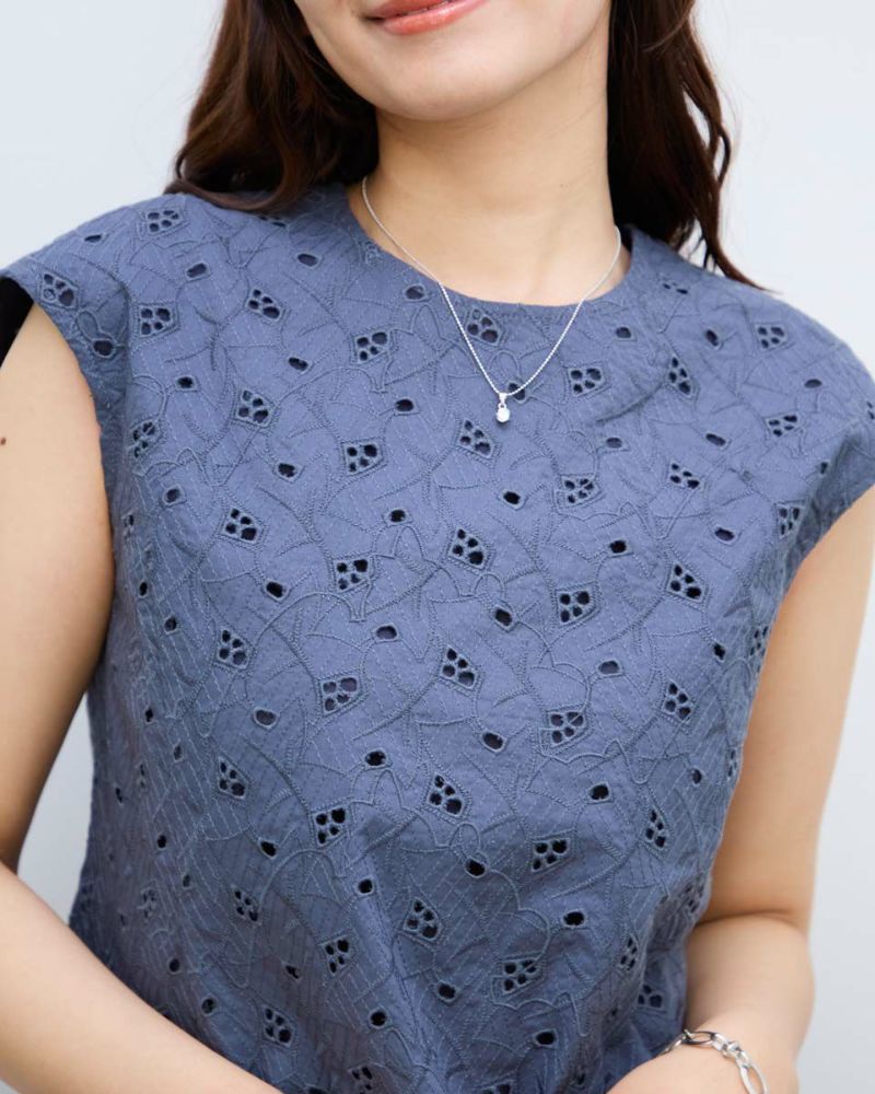 生地全体に刺しゅうや穴の開いたアイレットの連続模様が施されているオーバーレースを使った華やかなブラウス。裏面に別地を付け肌が透けることなく着用が可能。タイトなネックとは反対に腕を出し肌の露出に強弱を付け品の良さや大人っぽさを演出しています。肩先を少し覆った袖口のディティールもポイント。バングルを添えた辛口なコーデやデニムを合わせて甘さを軽減した着こなしもレースが活きて素敵です。 モデル身長: 168 cm 着用サイズ: M サイズ Golden Bear White Label (Ladies') ブラウス (Ladies') 同素材スカートはこちら 【着用アイテム】468R5760 レーススカート 468R4051 トートバッグ