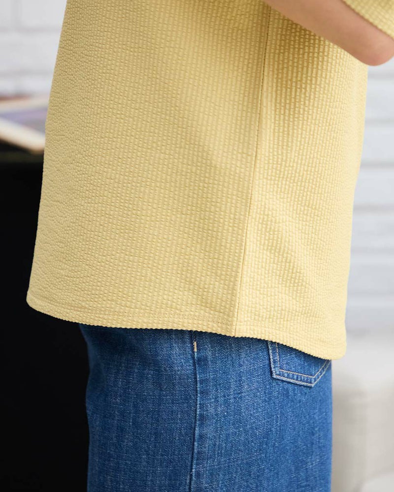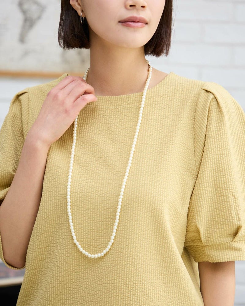 汗ばむ季節に家庭洗濯でき乾きも早いポリエステルのカットソーサッカーを使ったデザインTシャツ。ポコポコとした凹凸で肌との密着が少なくタテヨコに伸びる素材感にファンの多いアイテムです。今期は袖山線に丸みを付けたシルエットで立体感が増し、よりモードな1着に。5分袖で気になる肘周りもしっかりカバーします。フラットに仕上げた襟ぐりにネックレスを添えた着こなしも素敵です。