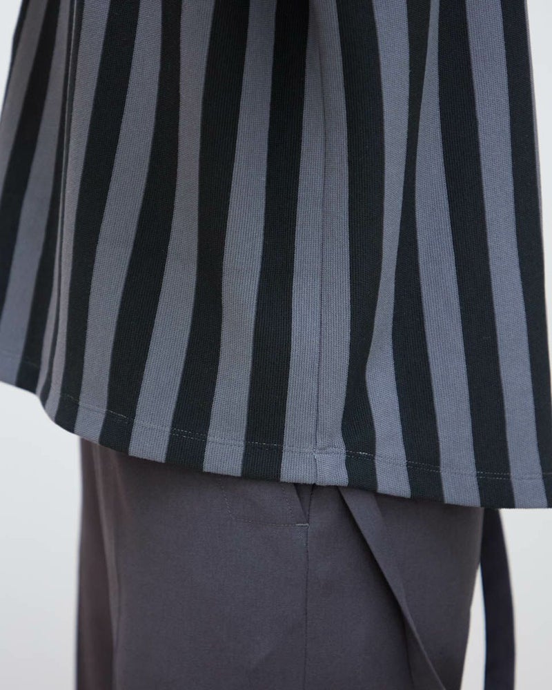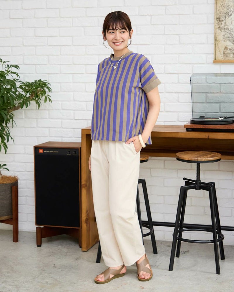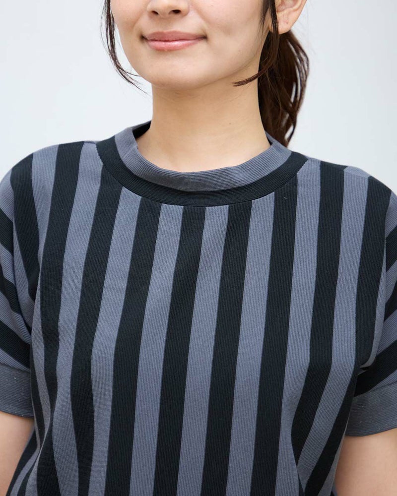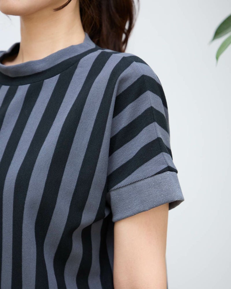 表面に細かいヨコ畝が見え整った編地が上品なミラノリブ調のカットソーを使用。2㎝幅で繰り返される2色のストライプがモダンなトップスです。ほどよいタテヨコのテンションがダレ感を防ぎ少し高さを付けたネックで肌を覆う様子が上品なアイテム。フレンチスリーブで腕の露出が多いためバングルを添えた辛口のスタイリングも素敵です。パンツやタイトスカートと相性が良くオフィス使いにも便利な1着。