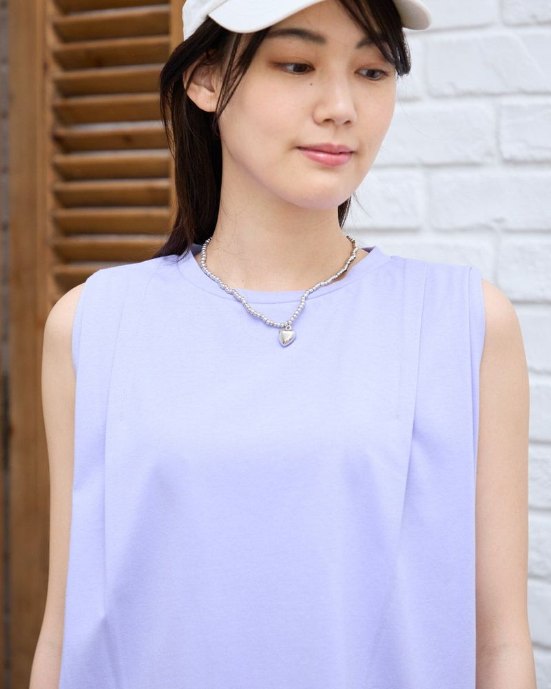 コンパクトヤーンを使って編んだ生地は表面に毛羽が無くサラッとした手触りでキレイな表情が魅力。ほのかなツヤ感でカジュアル感が消され大人世代におすすめのノースリーブです。しっかりとキープされた肩に施したタックで腕の両サイドに身頃生地が被さり肌露出が少なく見えるところも嬉しいポイント。タイトなネックとボクシー型で下着感ゼロの洒落感アイテム。使いやすいアイテムで色違いの購入もおすすめな1着。