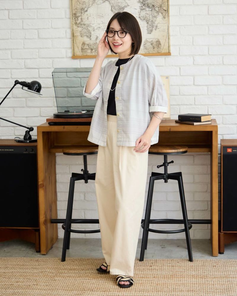 親しみのある折り紙のやっこさんのような形のアイテム。ドルマンスリーブでアームホールに切り替えがなく袖下で生地のたわむ様子にこなれた雰囲気がある所も素敵なポイント。薄く、ほのかに透け感のあるベースに馴染むように織られたチェック柄がモダンで大人世代におすすめ。生地に表情があるのでサッと羽織るスタイルもサマになります。大ぶりのネックレスでパンチを効かせた着こなしも受け止めてくれる1着です。