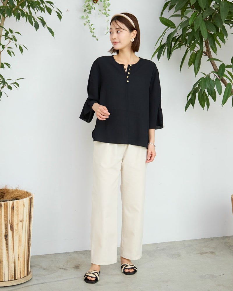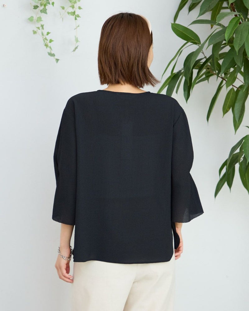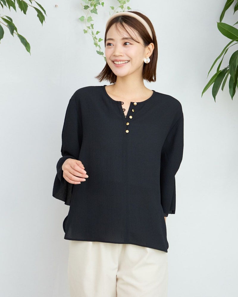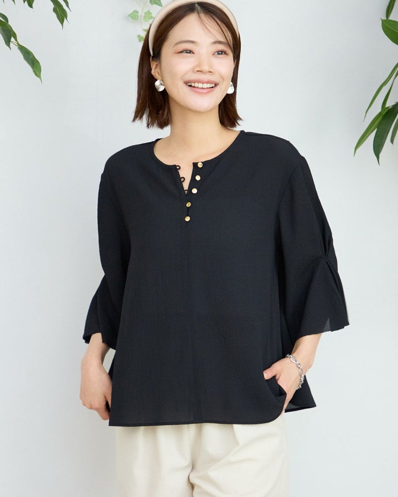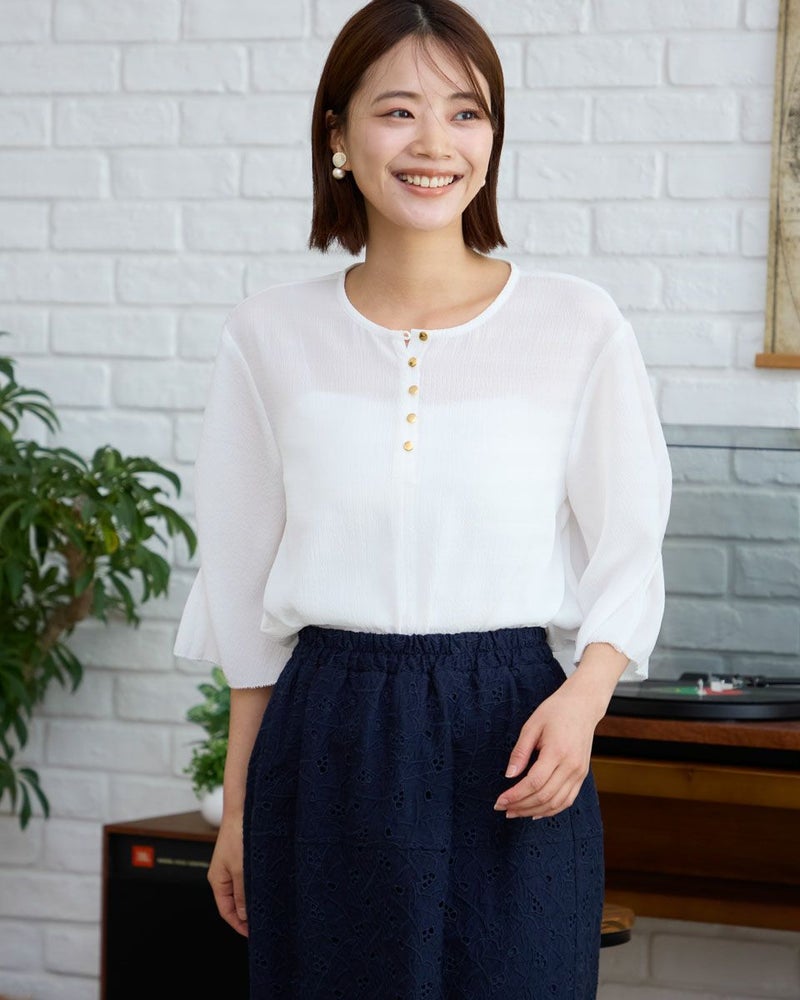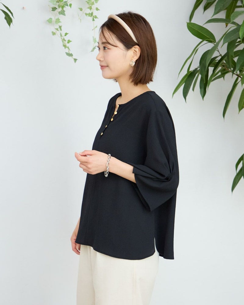細かい凹凸が広がる生地は柔らかく儚げな表情が魅力。ボクシー型のシルエットで少し身体が泳ぐゆとりがあります。ほどよく落ちる生地の質感でボディをソフトに包むフェミニンなブラウスです。肘にかかる5分丈の袖口に施したタックがふんわりと揺れる様子も上品で手元を綺麗に映してくれます。キーネックのフロントに並んだ小さなメタルの釦に光が集まり顔周りが華やかに見える点もポイントです。1枚着はもちろん、ジレやカーディガンを羽織ってオフィスや学校行事での着用もおすすめ。ボトムスにはピリッと辛さのあるロングタイトやダメージ加工のデニムを合わせても素敵です。