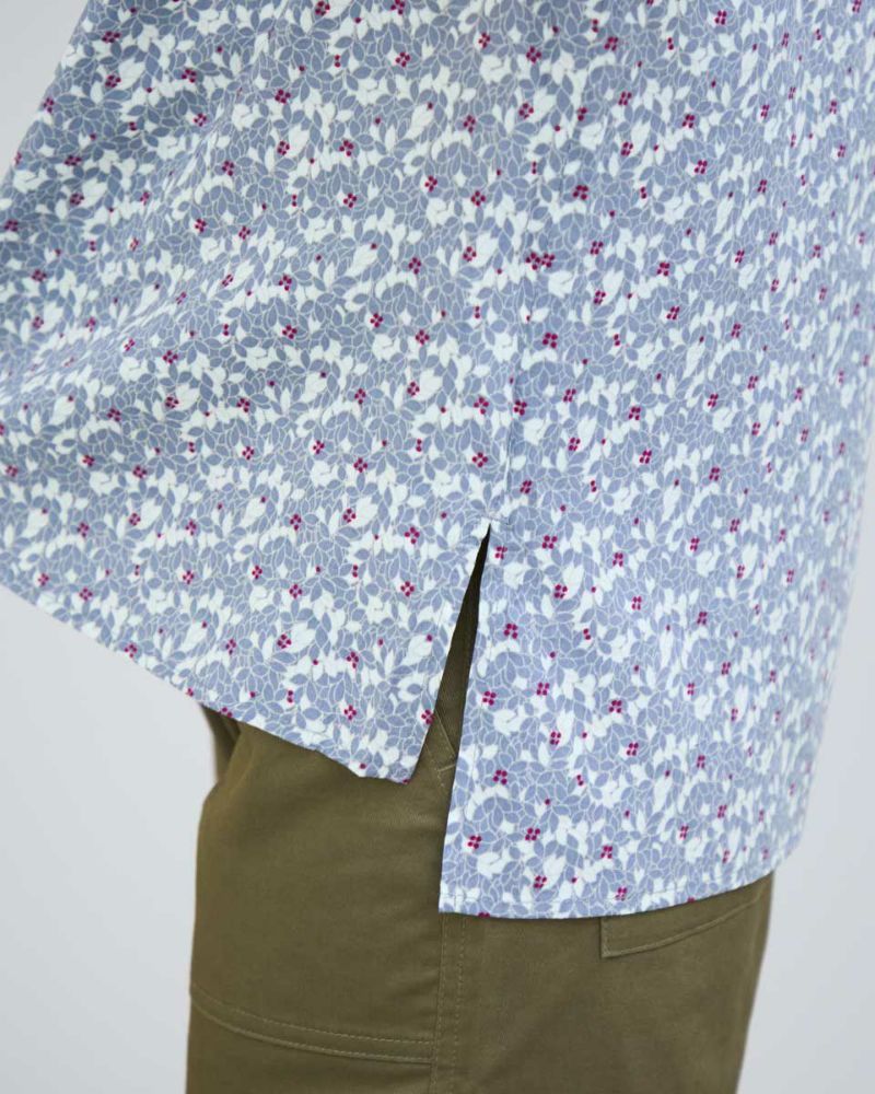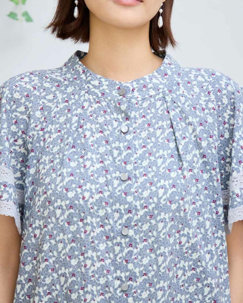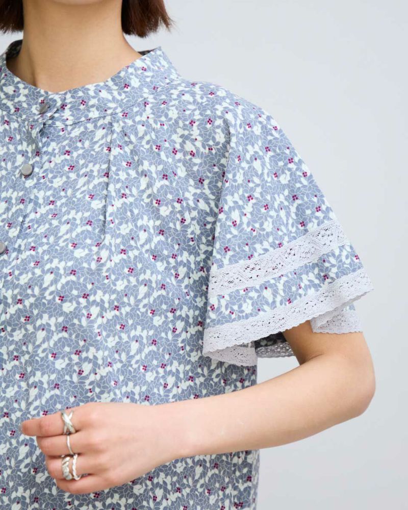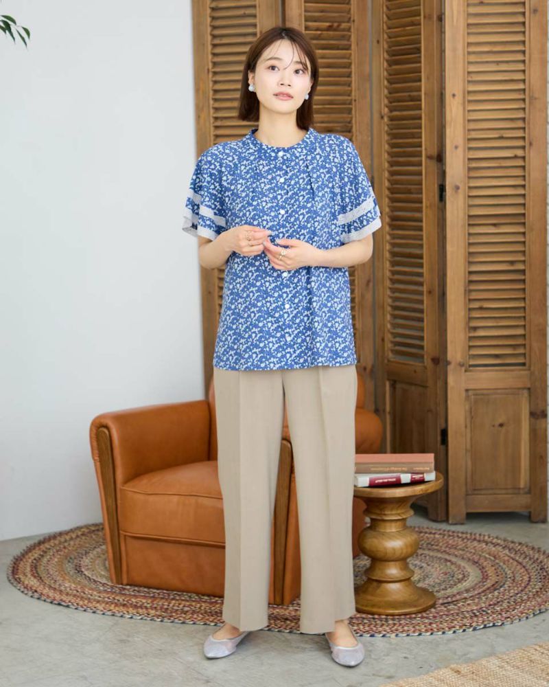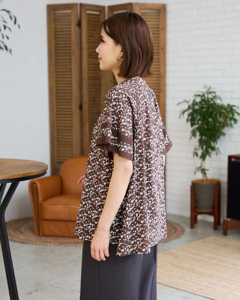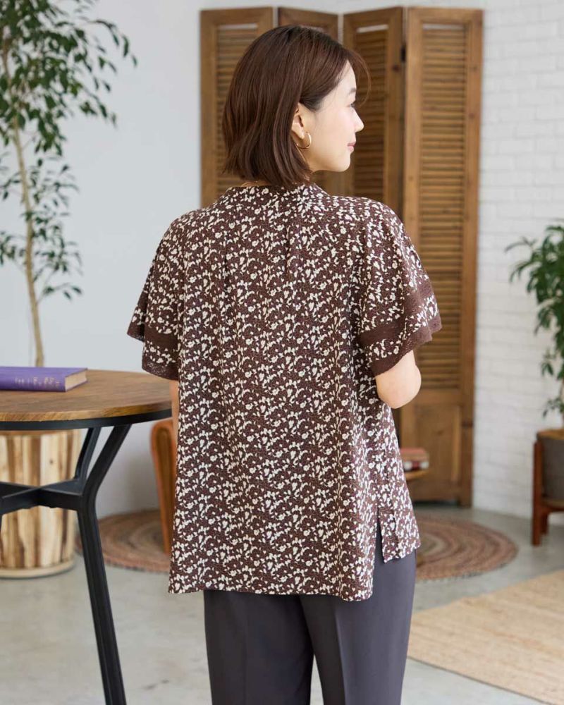 秋の収穫に向けて小さな実を付け始めたオリーブをイメージしたプリントブラウス。肩を優しく包むラグランスリーブは袖口のフレアが揺れ優雅で涼しげ。袖下の内側にマチを付けているため脇や下着が見えにくく1枚着もしっかり担います。素材がしなやかに落ちるため上品な佇まいが魅力です。蒼く茂る葉を落ち着いたトーンで表現し、全体的にシックなため初秋まで着用が可能。綺麗めなボトムスと合わせてオフィスや学校行事でお召しになっても素敵です。デニムやカゴバックとのカジュアルコーデも◎パールやスキンジュエリーで光を添えたコーデも梅雨どきの曇天に映えおすすめです。