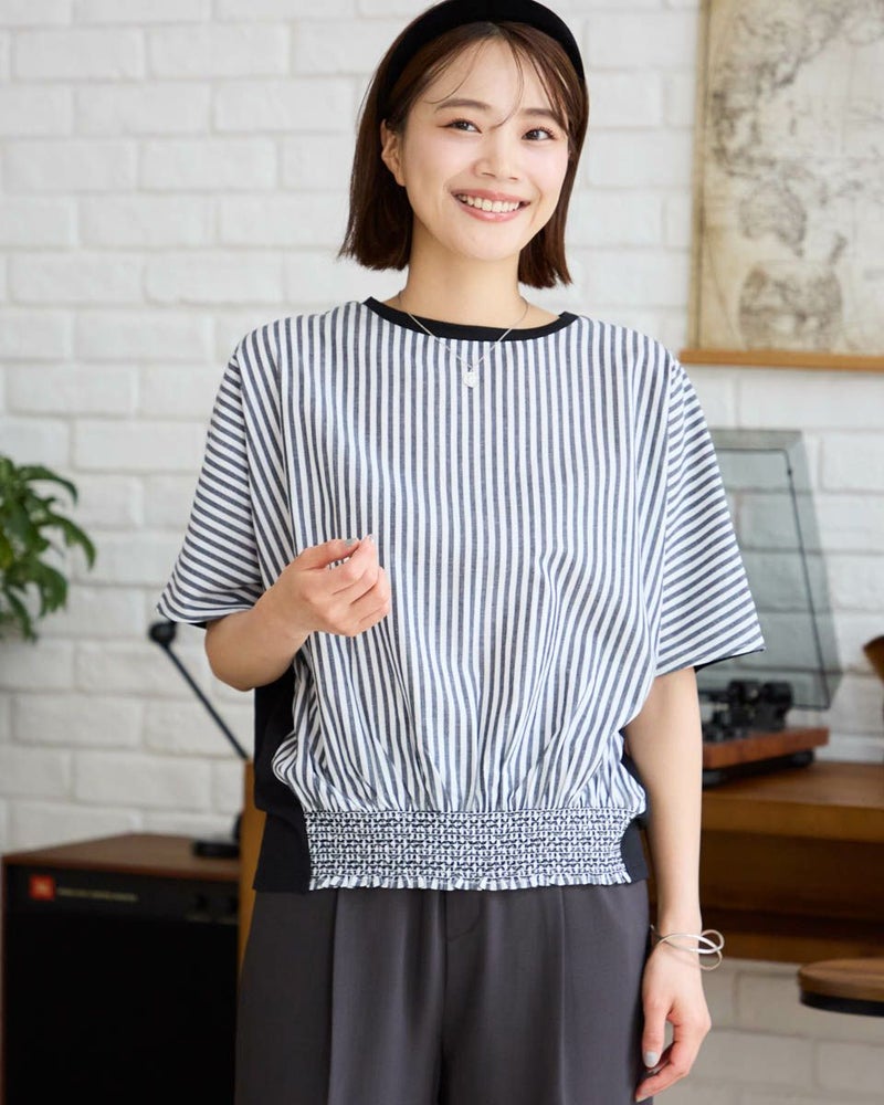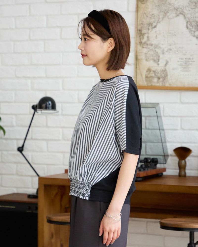 前身頃にストライプの布帛をドッキングしたデザインプルオーバーです。肩から袖口までなだらかに繋がるドルマンスリーブは、袖下で生地がたわむ様子もラフで素敵です。前身頃の裾に施した5㎝ほどのシャーリングは作り込んだような手しごと感がありフロントの良いアクセントになっています。全体的に配色の色みを抑えているため幼さが消えシックな雰囲気が魅力の1着。背中のカットソーに少し透け感があるためインナーを着用すると清潔感も保ててGOOD。ボトムスを選ばずカラーストーンや地金のジュエリーで色みを添える着こなしも大人っぽくて素敵です。楽しさも纏えるパワーアイテムです。