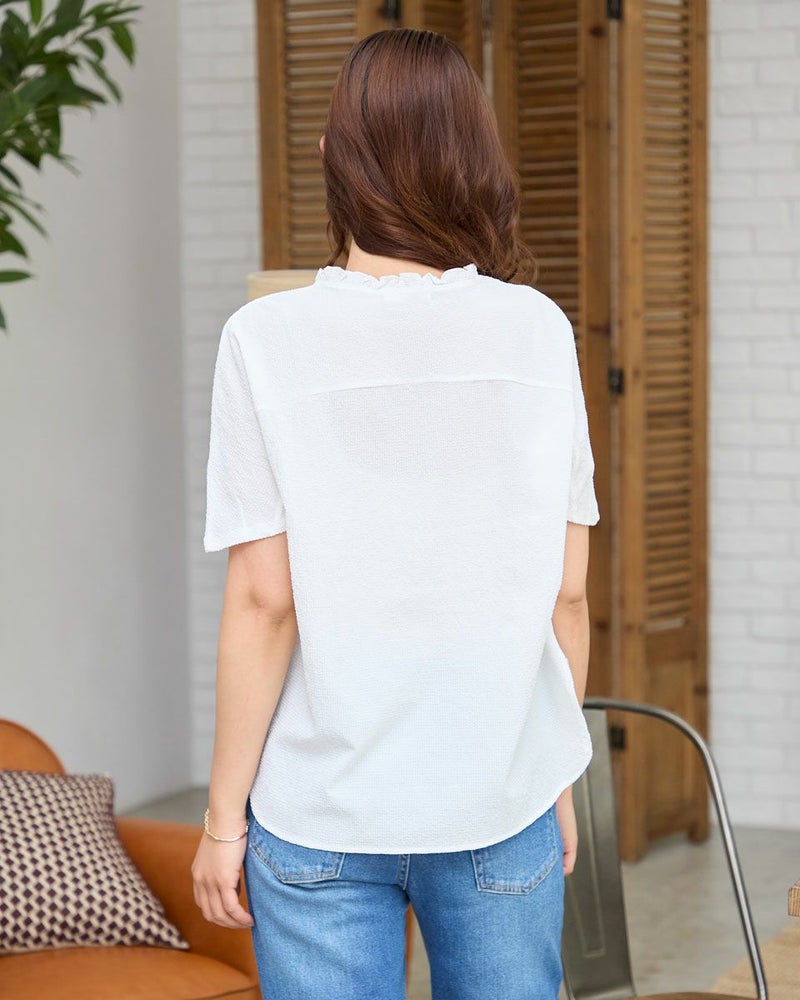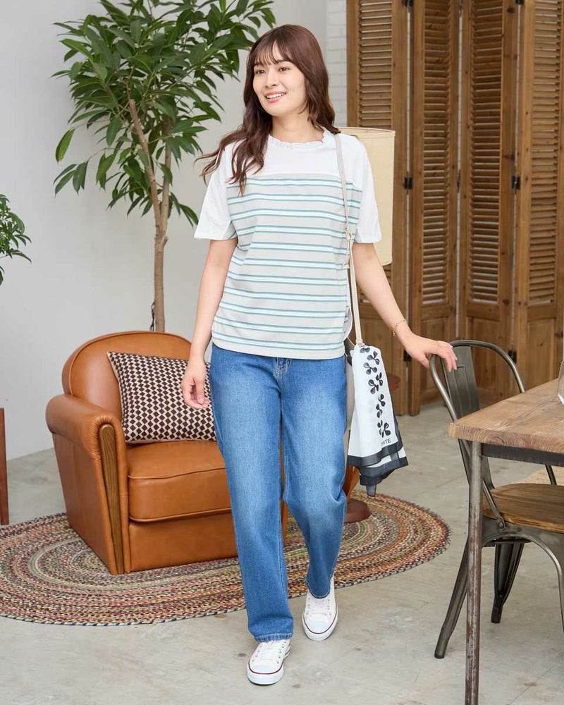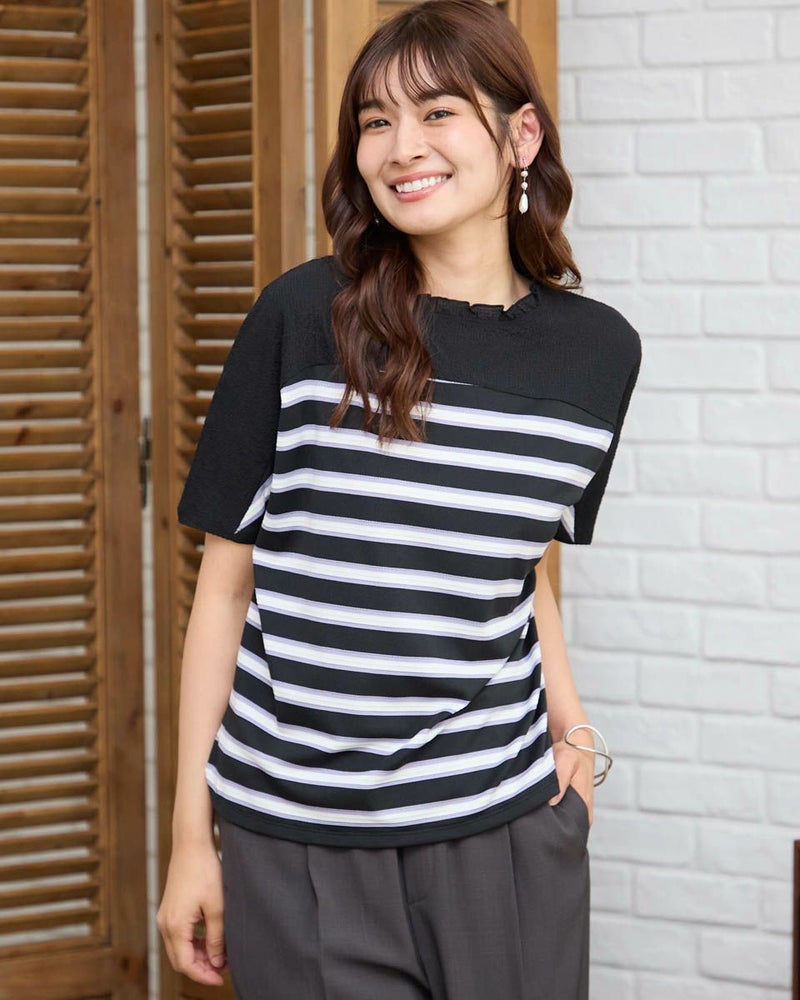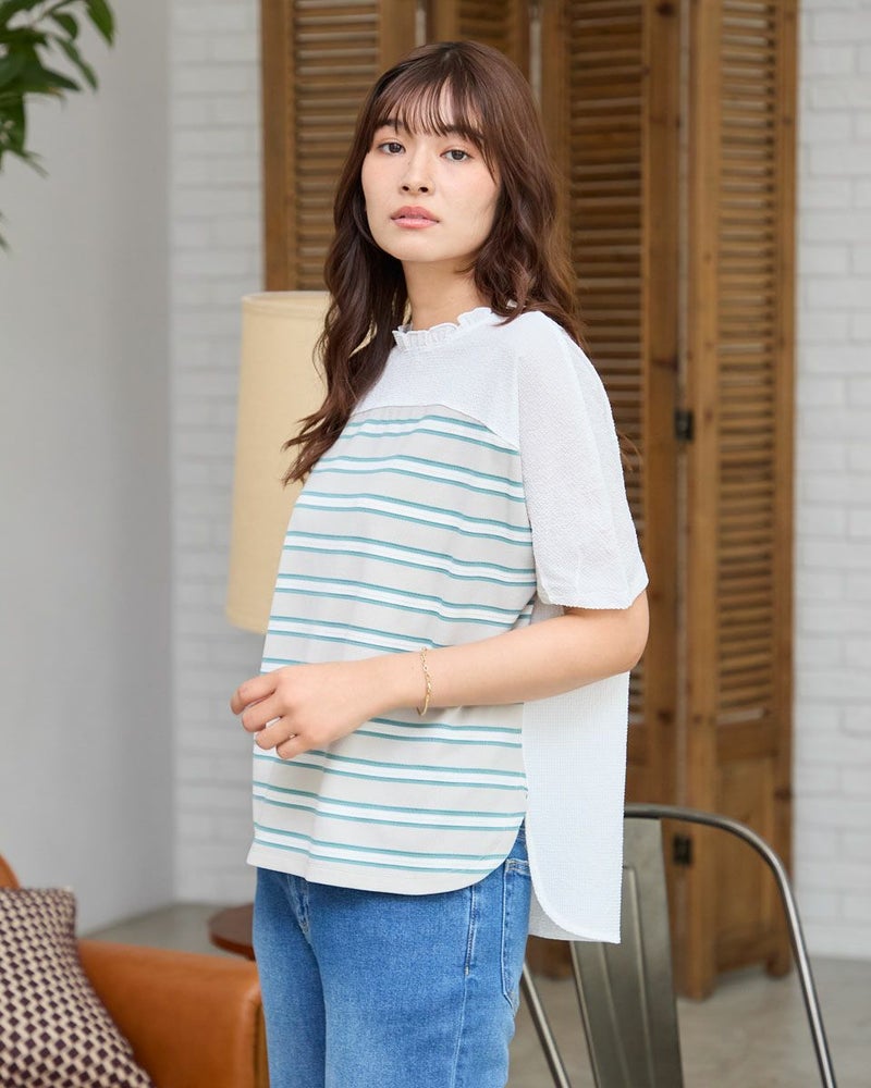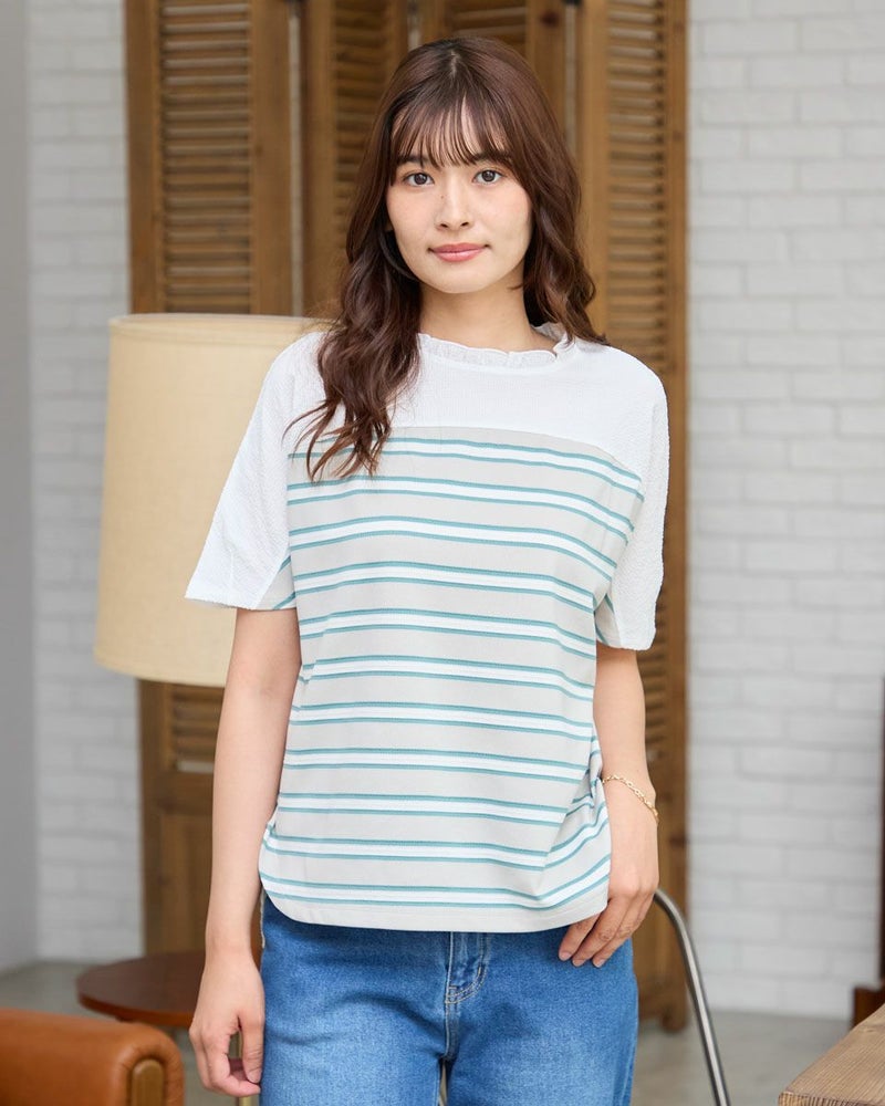 背中と前ヨークにも凹凸が可愛いサッカーの布帛をドッキングしたデザイントップス。ポツポツとした小さな凹凸が特徴的な鹿の子と、同じく凹凸を繰り返しながらヨコ方向に配色でラインを施したボーダーの生地をセレクト。ほのかなシアー感と軽いタッチが魅力です。全体的に肌離れも良くドルマンのシルエットで風が通り抜けるため涼しく、華やかにお召しいただけます。腹部やヒップを覆う着丈でパンツとのバランスが取りやすく襟元のフリルに甘さがあるためデニムやキャップなどカジュアルなアイテムとのコーデがおすすめ。乾きやすく汗をかく季節に便利な1着です。