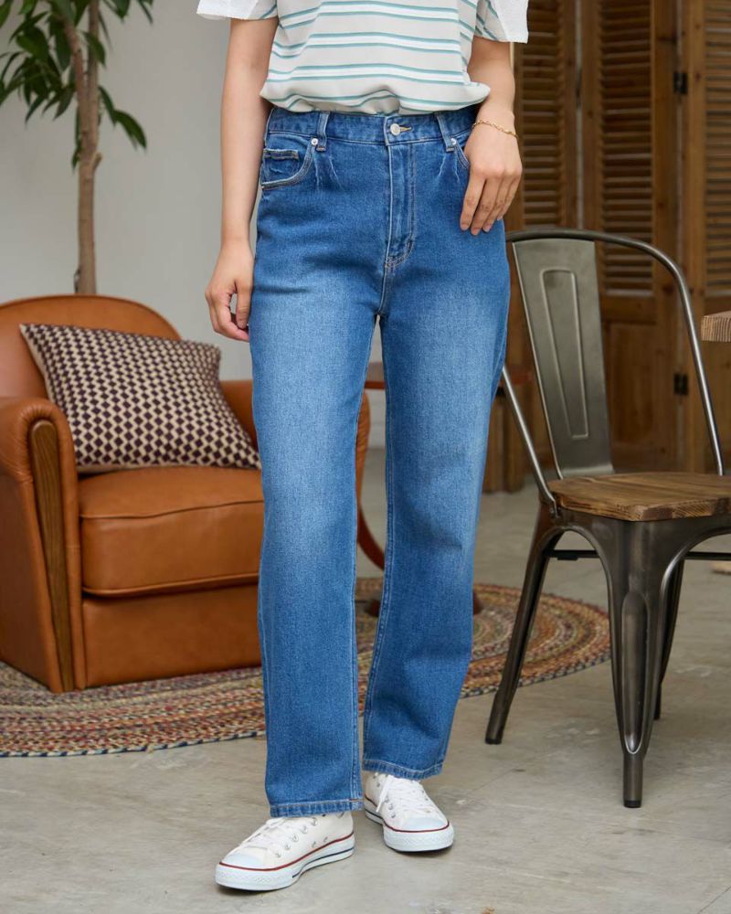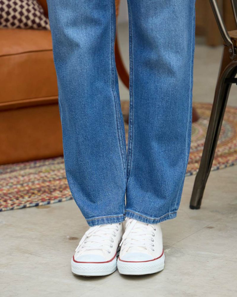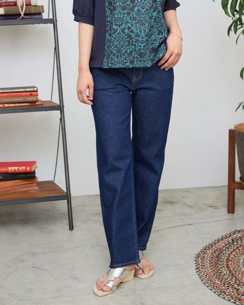 今期は程よく厚みを感じる11.5オンスのデニム地をセレクト。厚みが増した事で今の気分にフィットする1本に仕上がりました。ウエストからヒップはすっきり、少し細みなストレートの筒部分が足を真っすぐに見せ女性らしくヘルシーにお召しいただけます。ポリウレタンの効果でヨコ方向に伸縮するため強張り無く、立つ、座るの動作もスムーズ。ワンウォッシュで仕上げたネイビーカラーは砕け過ぎず清潔感もしっかりキープ。ももやヒップの色落ち、擦れなどダメージ加工を施したブルーカラーも洒落た雰囲気が出ます。仕上げにリップやジュエリーで光をプラスすると、洗練されるのでおすすめです。