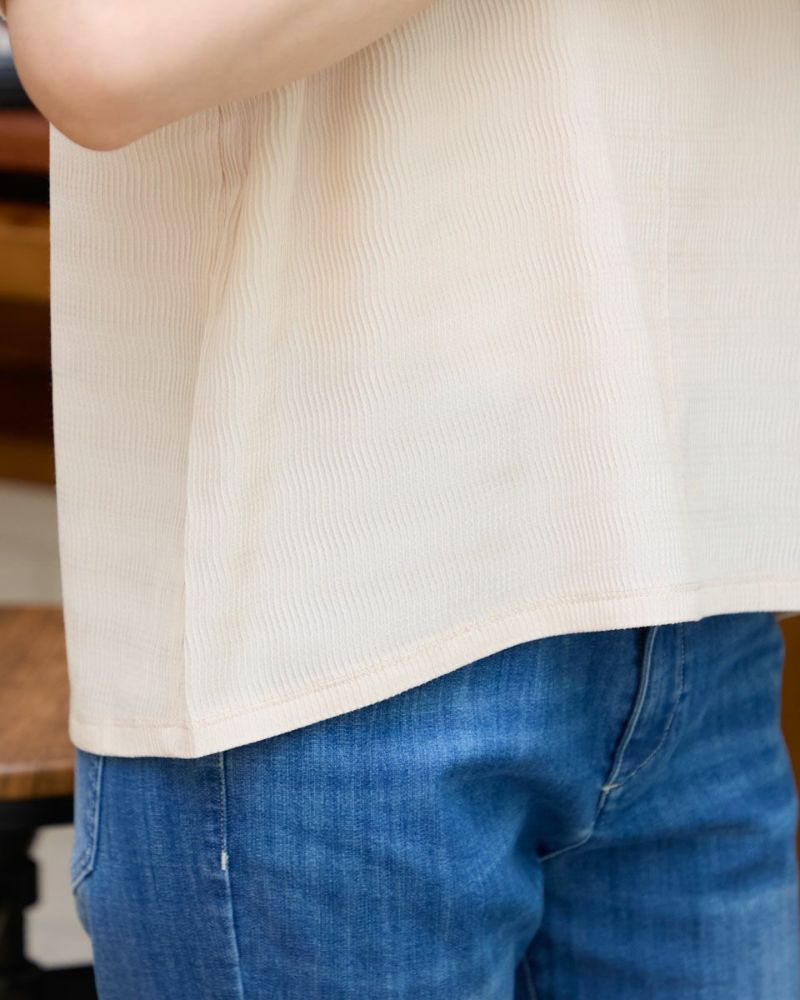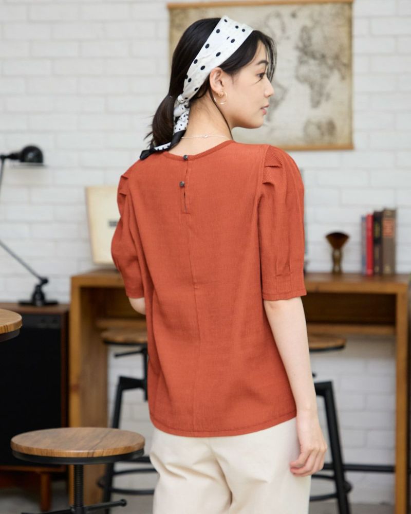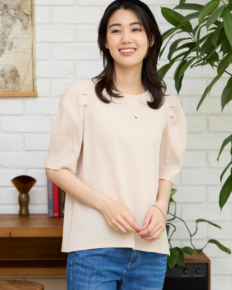 無数に並ぶ細いウネをジャカード織りで表現した布帛生地をセレクト。かすかに立ち上がるウネは一定のリズムでゆらゆらと蛇行が繰り返され表情豊か。袖山にタックで立体感を出したデザインプルオーバー。ウネ柄の膨らみが生み出す光沢と弾力が伸縮性の良さと程よいボリュームを作り、リブのカットソーには無い高級感も魅力です。肌の露出を極力抑えたネックラインと袖口をタックで絞った5分袖で、よりモードに仕上げています。パンツやロングタイトのボトムス合わせがおすすめ。トレンドのシルバーのアクセやレザーベルトを添えて辛口なスタイルにまとめても素敵です。
