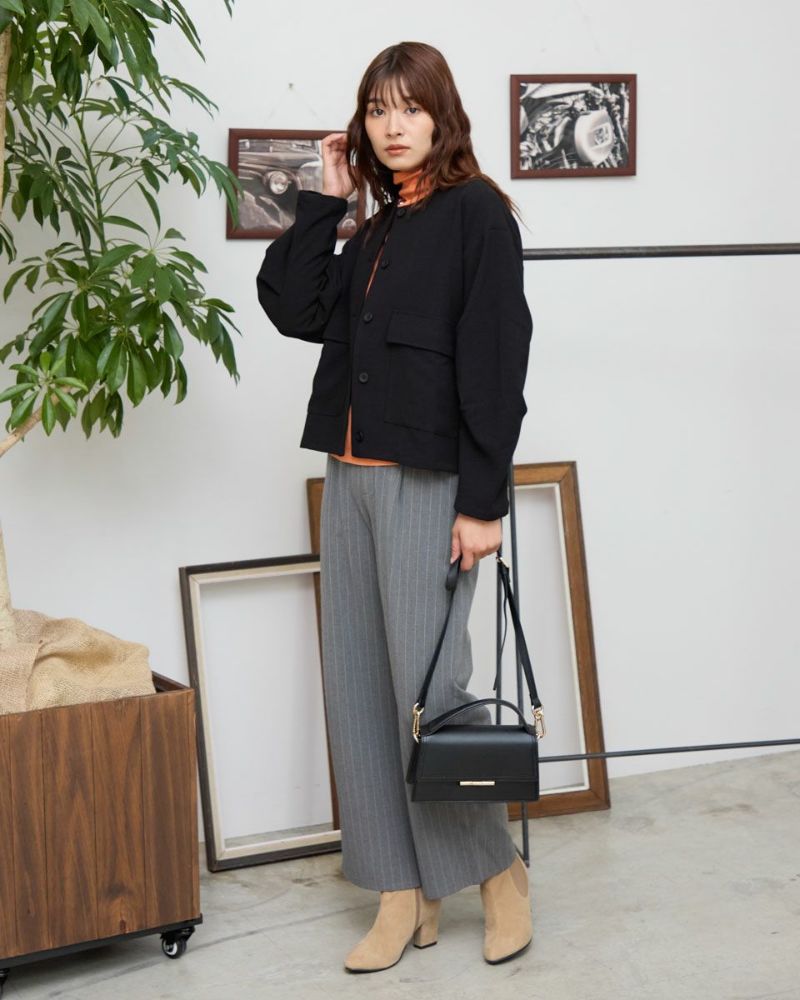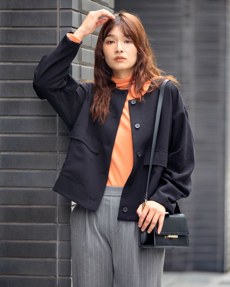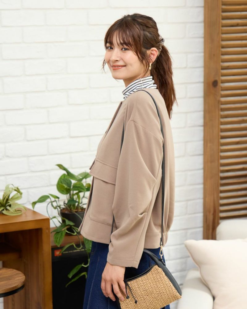 ほどよい肉厚感で保温性のある二重織りの生地を使ったブルゾン。短めの着丈でアクティブ感があり時流の着こなしをお楽しみいただけます。肘に施したタックがアクセントになり羽織るだけでサマになるアイテムです。コンパクトなネックラインがカジュアルさを抑えてくれるので釦をすべて閉じた着方も品がありおすすめです。キメの整った織り目の表面には毛羽感がないため、気温差のあるスイッチシーズンからお使いいただけます。他のアイテムと合わせやすいブラックとモカのカラー展開でオフィスやお子様の送迎での着用にもピッタリです。 モデル身長: 168 cm 着用サイズ: M サイズ Golden Bear White Label (Ladies') アウター (Ladies') 【着用アイテム】468RC460 タートルネック 468RC750 ストライプパンツ 468RC751 デニムスカート