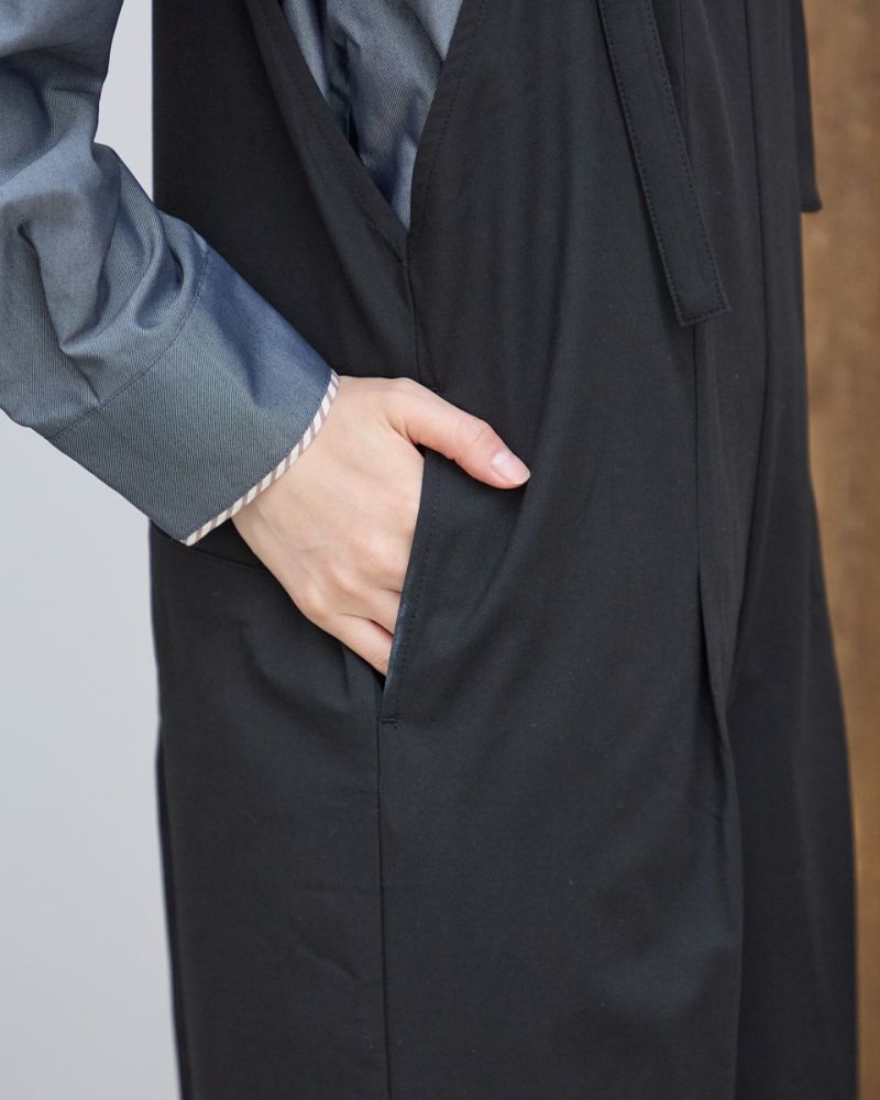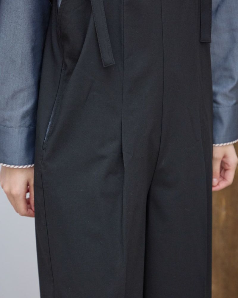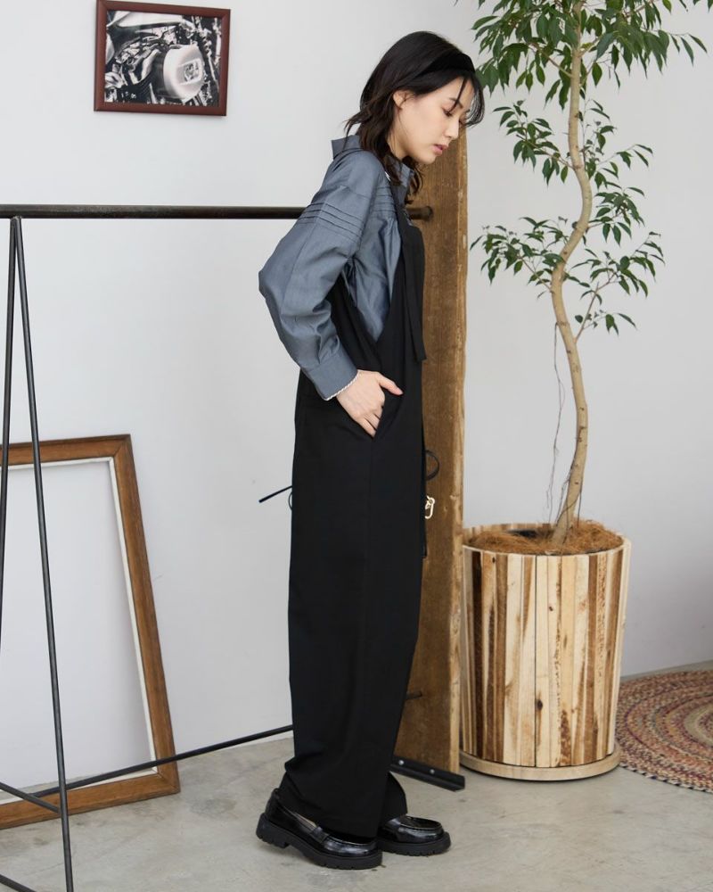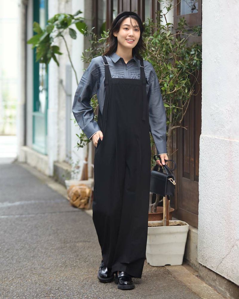 ほのかな光沢と整った織り目が上品な生地で仕上げたサロペット。トップの身頃幅をコンパクトにし、バストや背中が広く見えない工夫をしています。光を抑えたショルダーのメタルアジャスターには落ち着きがあり大人世代におすすめの1着。パンツ部分はほどよく揺れるストレートシルエットで、足のラインを拾わずスラックスのようなきちんと感があるため、オフィスや推し活での着用も素敵です。ブラウスやタートルカットソーなどインナーを選ばない優秀アイテム。ハンサムな雰囲気があるので一粒パールのピアスや指先のネイルで艶を足す着こなしもおすすめです。 モデル身長: 166 cm 着用サイズ: M サイズ Golden Bear White Label (Ladies') ブラウス (Ladies') 【着用アイテム】468RC360 シアーブラウス 468RC361 ピンタックブラウス 468RC450 クルーネックプルオーバー