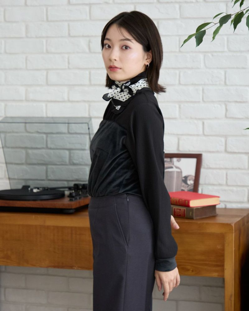 細かい毛羽で覆われ滑らかな手触りが気持ち良いベロアを身頃に用いたドッキングアイテム。秋の訪れを感じる素材のため、暑さの残るスイッチシーズンでの着用はお洒落度が増しおすすめ。ヨークと袖にはタテ方向の細長いシボが特徴的な楊柳素材をセレクト。ほのかな透けとツヤ、落ち感が大人っぽく、熱がこもりにくい点も嬉しいポイント。砕け過ぎないセットインスリーブとクルーネックのディティールはボトムスを選ばない優秀アイテム。表情の異なる素材使いで華やかさもありデイリーに1枚着をお楽しみいただけます。春から続くトレンド感のあるブラウンもコーデに奥行が出て素敵です。