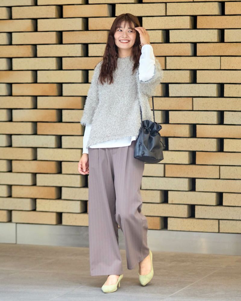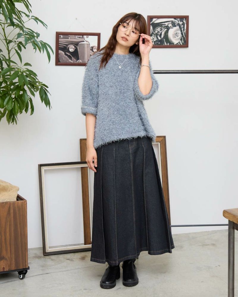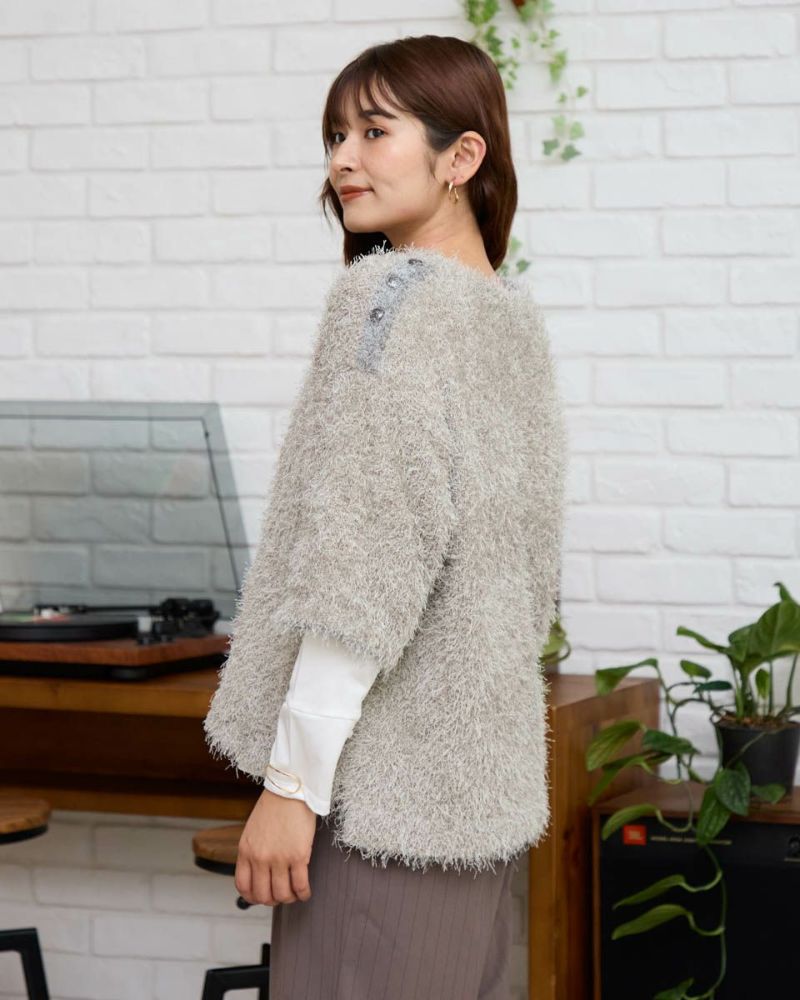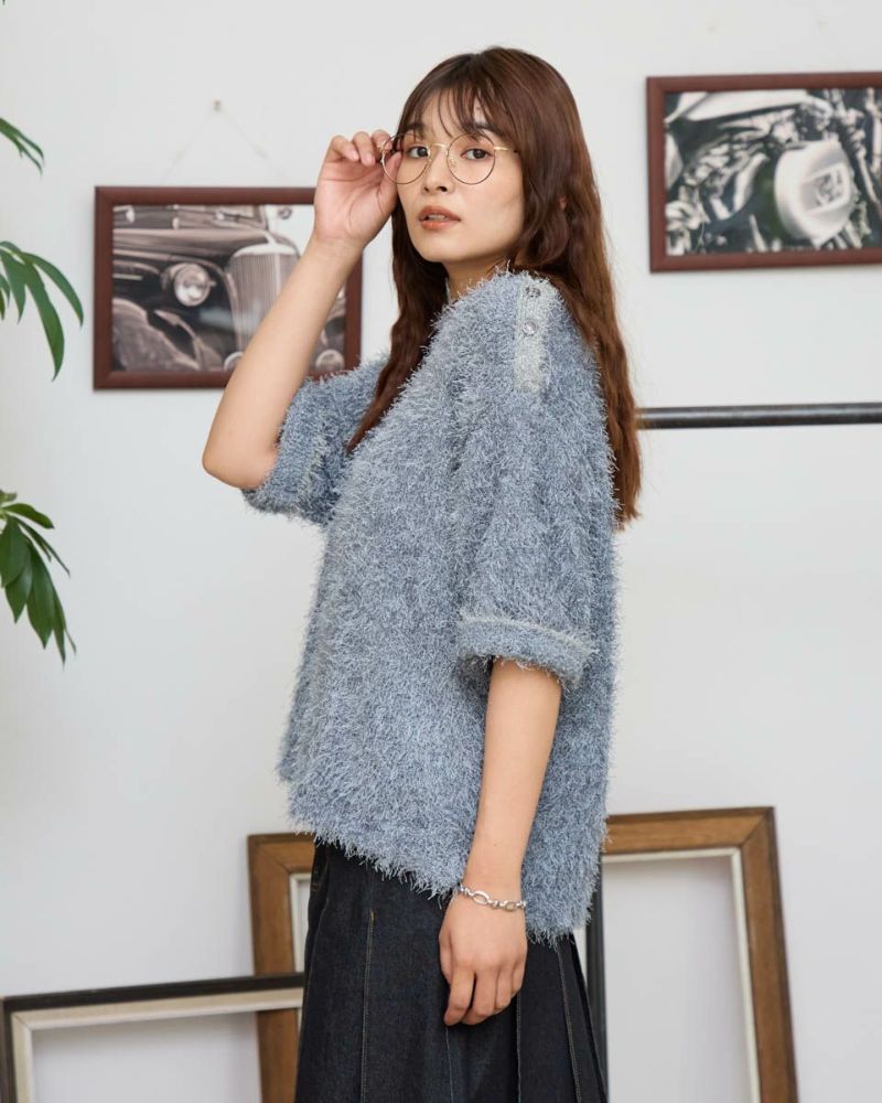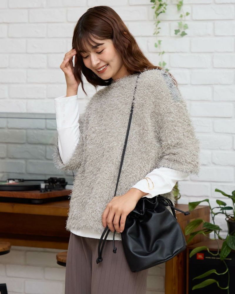 モジャモジャした長い毛羽が印象的なシャギーのニットプルオーバー。全身に1.5㎝ほど吹く糸には光沢があり暑苦しさが軽減されゴージャスな見た目が魅力です。肘にかかる袖丈で1枚着はもちろん、気温に応じてインナーにシャツやロンTを合わせる着方もおすすめ。ボクシー型で身体にフィットしすぎず、どんなボトムスとも好相性です。暑さの残るスイッチシーズンでの着用もお洒落ですが、年末年始の華やいだシーンでの着用も素敵です。モンスターのような雰囲気にチャーミングさがあるため経験をつんだ大人のお客様にこそ、お召しいただきたいアイテムです。 モデル身長: 168 cm 着用サイズ: M サイズ Golden Bear White Label (Ladies') ニット (Ladies') 【着用アイテム】468RC450 クルーネックプルオーバー 468RC750 ストライプパンツ 468RC751 デニムスカート