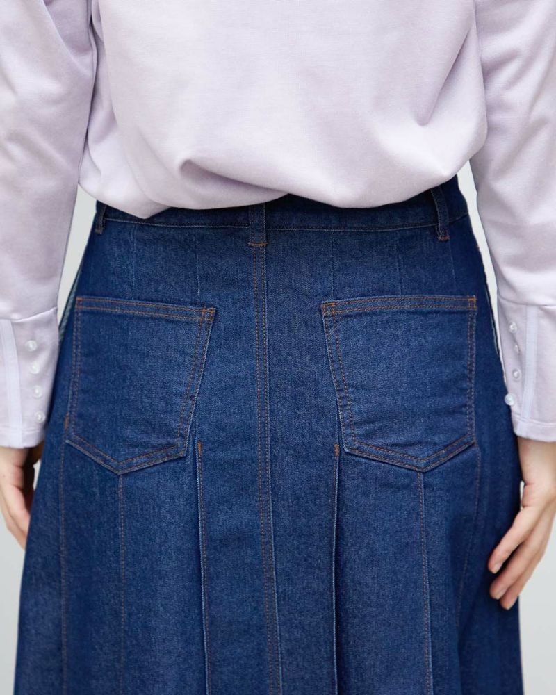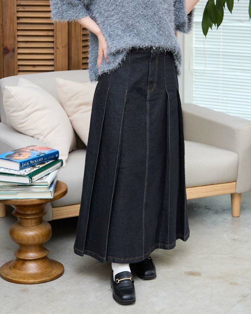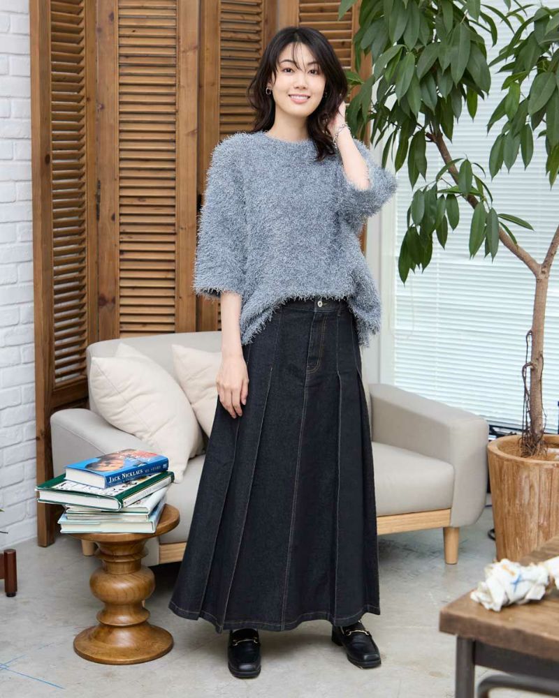 ヨコ糸に伸縮性のある糸を用いたデニムを使用。ほどよい厚みはシルエットが崩れにくく、下着のラインもひびきにくい事など女性にとっても嬉しい点が多い8.5オンスをセレクト。腹部から裾へ施された太い幅のプリーツがポイントです。ミモレ丈でプリーツがゆっくりと揺れる様子はスクール感が薄れ、カラーソックスやローファーを合わせたトラディショナルなスタイルも上品にまとまります。ブラックカラーはモード感があるため、ブーツで足元に重心を置いたスタイルも素敵です。トレンドの短丈アウターとも相性も抜群です。 モデル身長: 166 cm 着用サイズ: 64 サイズ Golden Bear White Label (Ladies') ボトムス (Ladies') 【着用アイテム】468RC450 クルーネックプルオーバー 468RC451 ラッフルパーカ 468RC460 タートルネック 468RC650 シャギーニットプルオーバー 468RC160 ショートジャケット 468RC751 デニムスカート