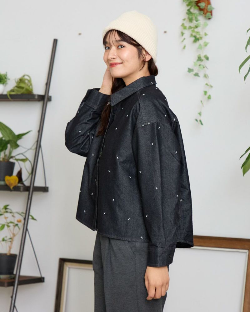 ドロップショルダーに、ゆとりのある身頃やトレンドの短丈が新しい8オンスのデニムシャツ。サンザシの実をイメージした刺しゅうの甘さを消すように、ビンテージ感を表現したブラストの加工もポイント。いつものコーディネートに鮮度がプラスされるため、秋冬物を新調される方にお試しいただきたい1着。羽織りはもちろん、ファーベストをレイヤードするスタイルもおすすめ。中国の山東省、洗濯機からの放水で絶えず湿った足元や、削った繊維が仕切りに舞う過酷な現場で1枚ずつ手作業でデニムに味付けをしています。少しずつ濃淡が異なるインディゴの表情をお楽しみください。 モデル身長: 168 cm 着用サイズ: M サイズ Golden Bear White Label (Ladies') ブラウス (Ladies') 【着用アイテム】467R8332 チェックシャツ 467R8710 ストレートチノパンツ 468RD751 ポンチストレートパンツ 467RC011 ファーバッグ