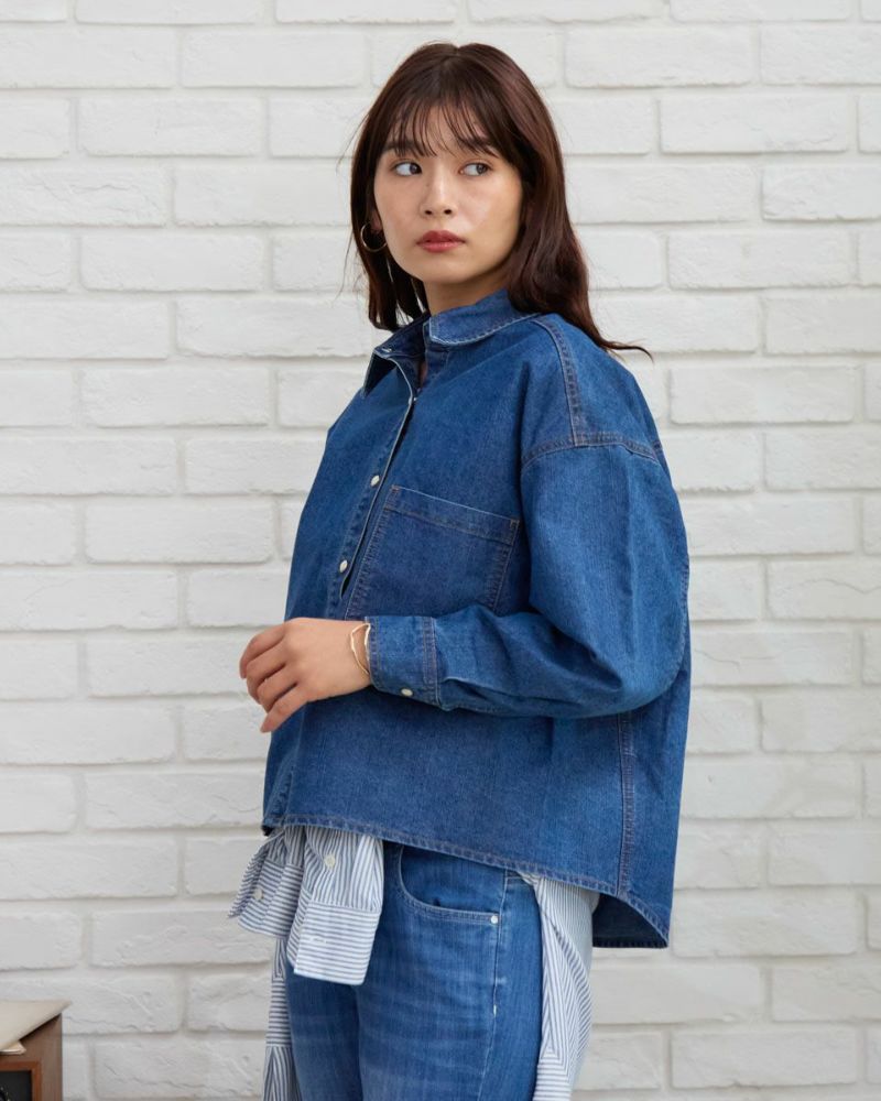 ドロップショルダーに、ゆとりのある身頃やトレンド感のある短丈のディティールで着こなしの鮮度が上がる8オンスのデニムシャツ。服の中で身体が泳ぐくらいのゆとりがあり、肩線を後ろへ3㎝ほどずらし襟を抜いてお召しになっても素敵です。程よいハリがダレ感を防ぎ構築的なシルエットを保つため若々しい印象のアイテム。合わせるアイテムを選ばずジャンスカやパーカに羽織っても可愛いです。デニムシャツの上からファーのベストをレイヤードするスタイルも今シーズンはおすすめ!武骨な生地感ですが、レディーライクに着るならリップやレザー小物でツヤを添えてみてください。