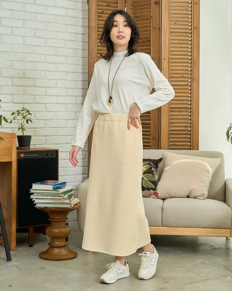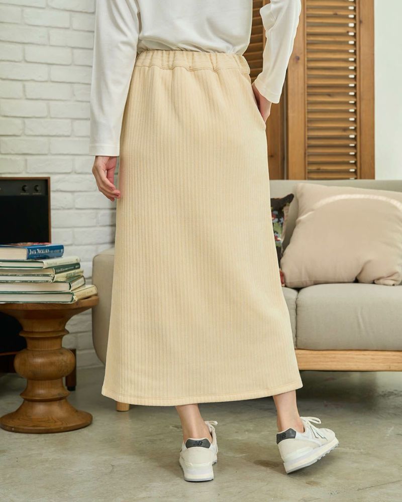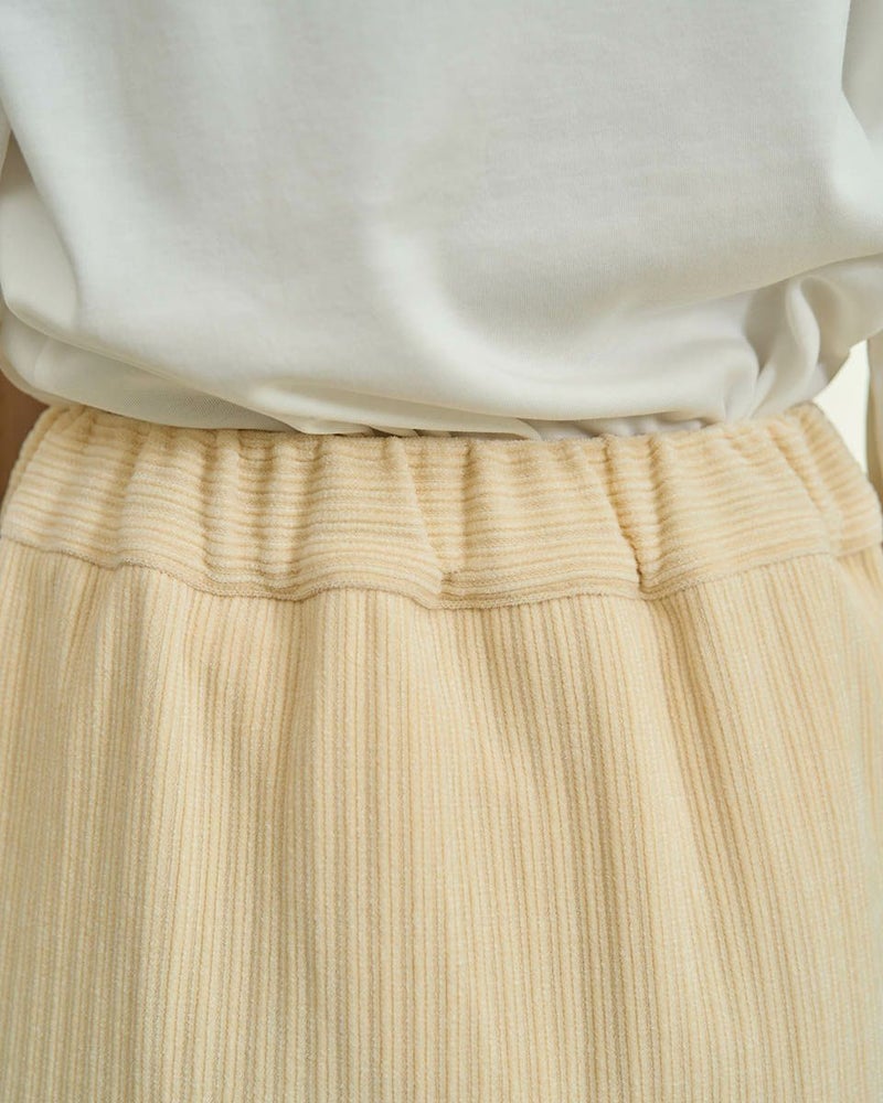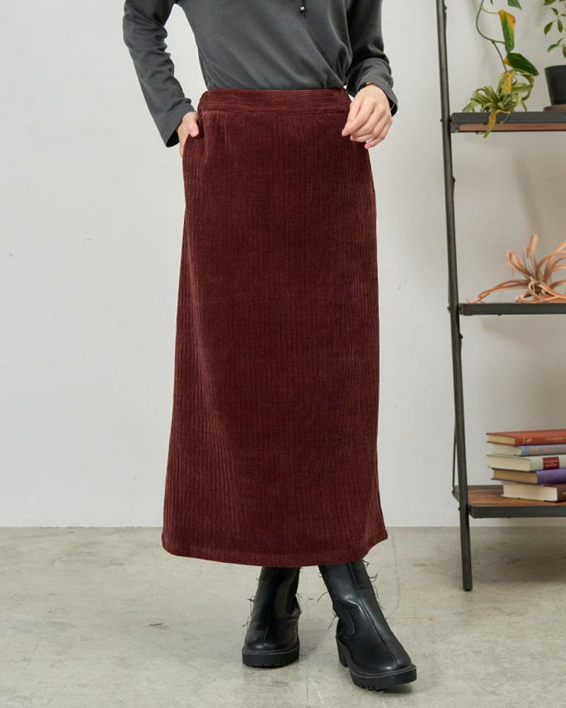 タテ方向のウネと細かい毛羽が特徴的なコーデュロイを使っています。手の平に吸い付くような触感が気持ちよく独特の光沢から生まれる陰影で、ほっこりした雰囲気が消え大人仕様のアイテムになっています。細みの台形型でコットン単体のものに比べヨコ方向にしっかり伸びるため立つ、しゃがむの動作も楽ちん。ゴム仕様のウエストは腹部が膨らまないようギャザー分量を少なく設定しています。サイドポケットや裏地も付いているためタイツとの摩擦を軽減しオフィスでの着用も◎シューズを選ばず足元のお洒落もお楽しみいただけるスカートになっています