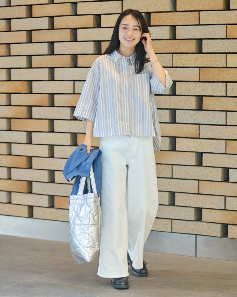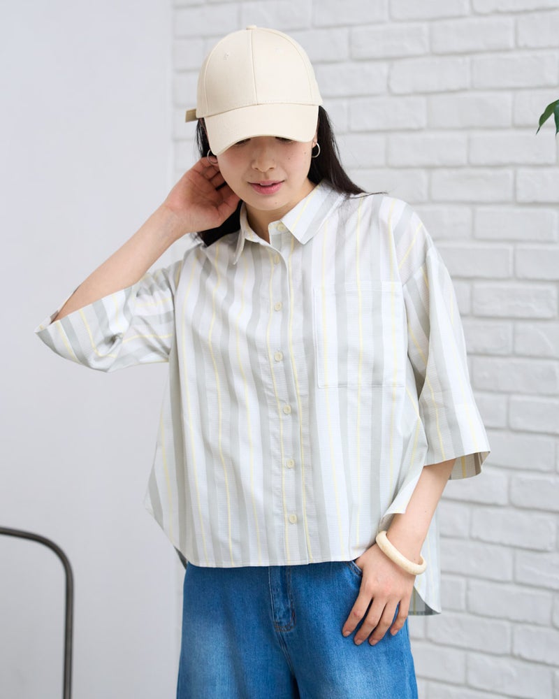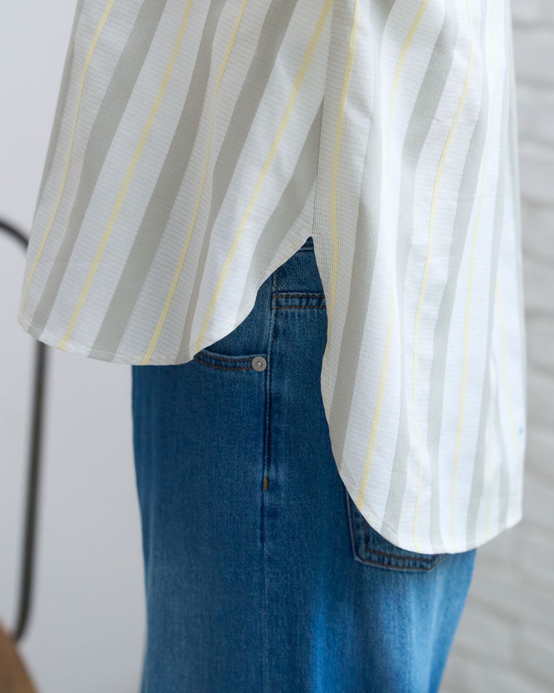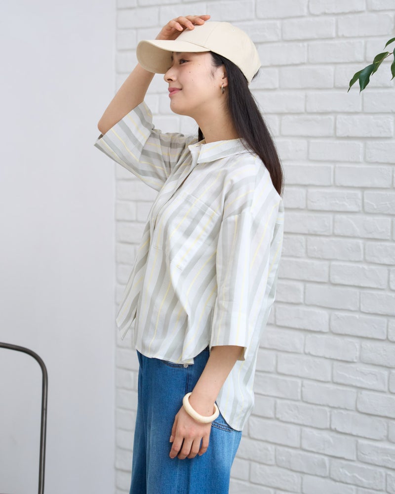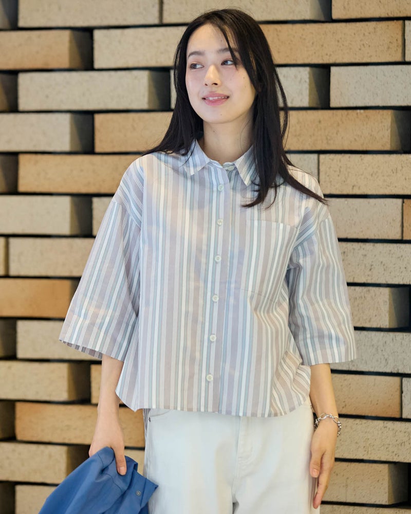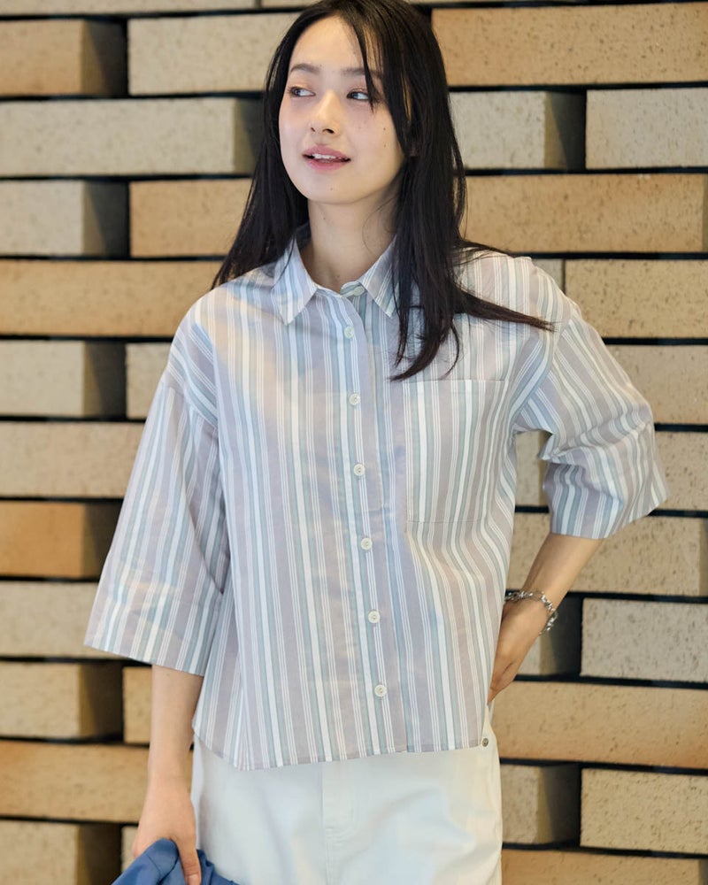 清涼感のあるドビーストライプが映える、正統派ながらも柔らかさを備えたシャツです。5分袖で肘や二の腕をカバーし、袖口を折り返してアクセントを付けることで、女性らしい華奢さとアクティブさを両立。ゆとりのあるボクシーシルエットは、ボタンを留めても羽織りとしてさらりと纏ってもサマになります。襟元を少し抜いて着こなせば、こなれ感のある大人カジュアルな印象に。通勤や通学といった日常使いから、週末の散策まで、どんなシーンでも好印象を与えてくれる頼もしい一着です。 モデル身長: 167 cm 着用サイズ: M サイズ Golden Bear White Label (WOMEN) ブラウス (WOMEN) 【着用アイテム】468U4350 はっ水シャツブルゾン 468U4461 フレンチスリーブTシャツ 468U4750 ワイドデニムパンツ 468U4751 ワイドデニムパンツ 468U4760 イージーパンツ 467RD011 キルトトートバッグ