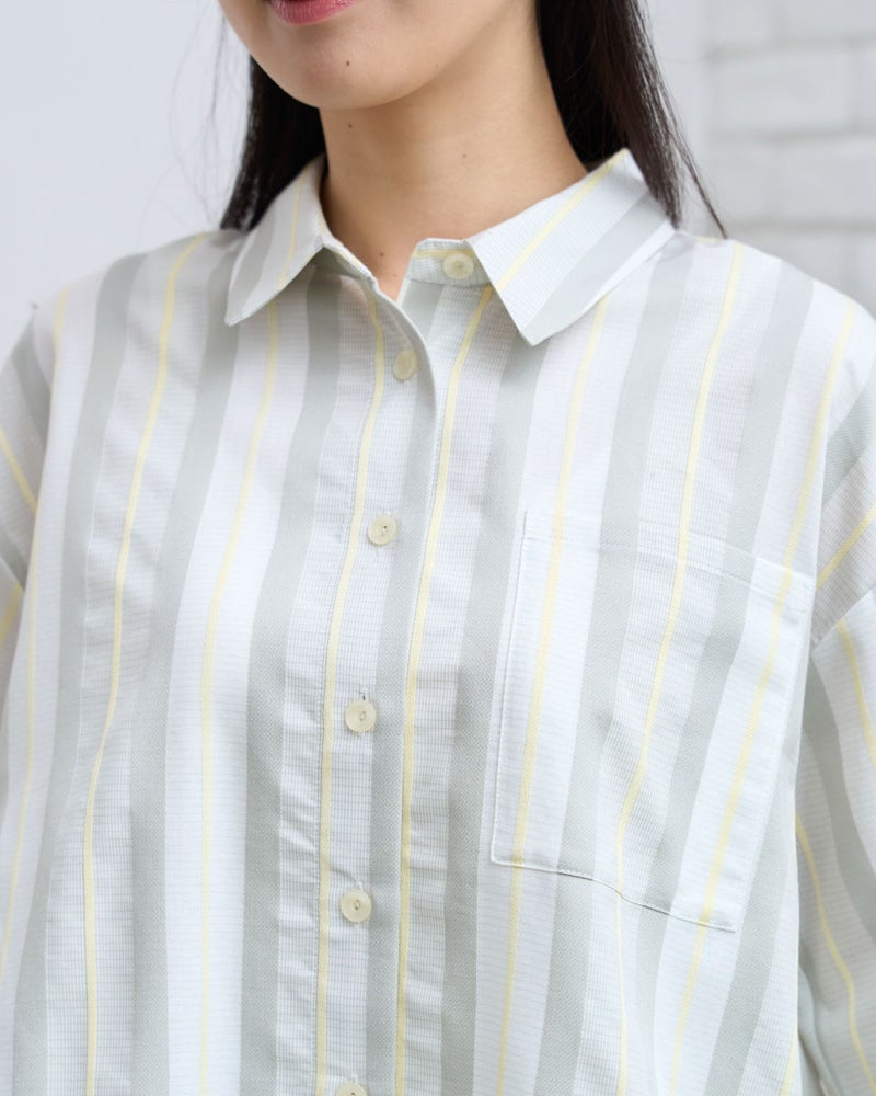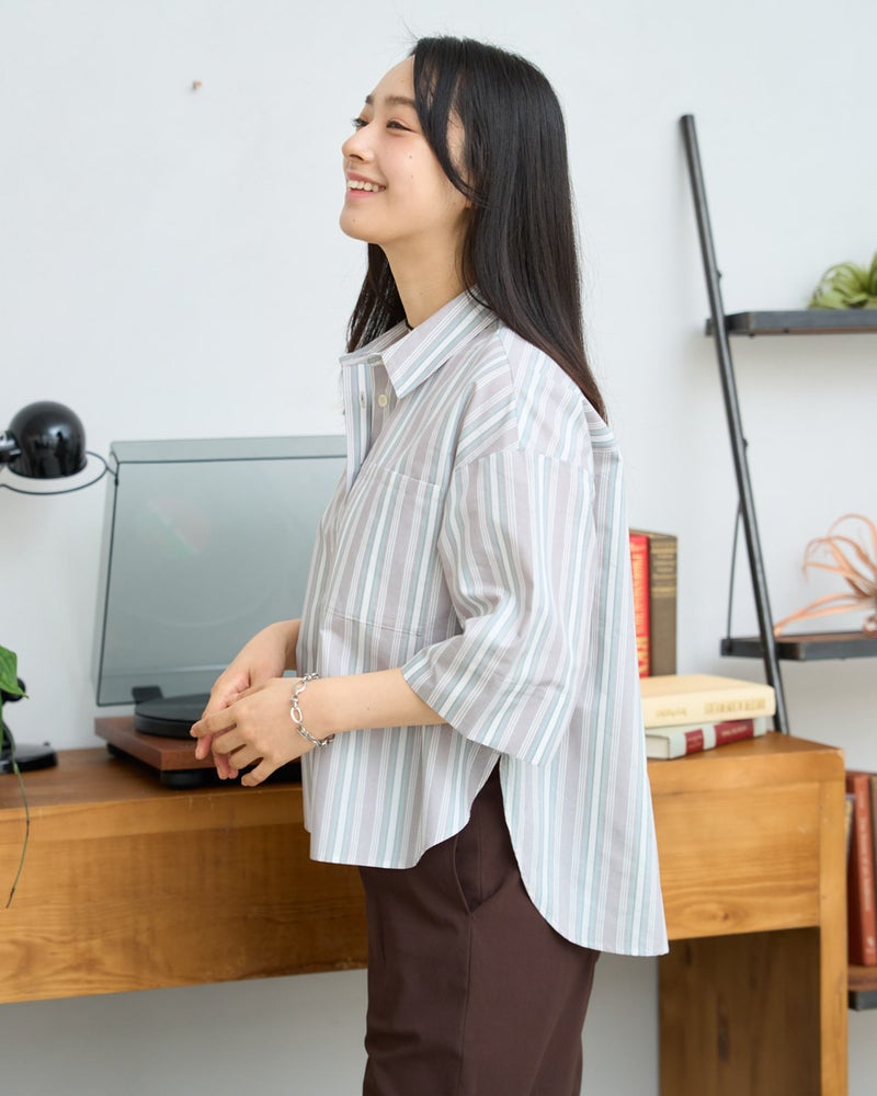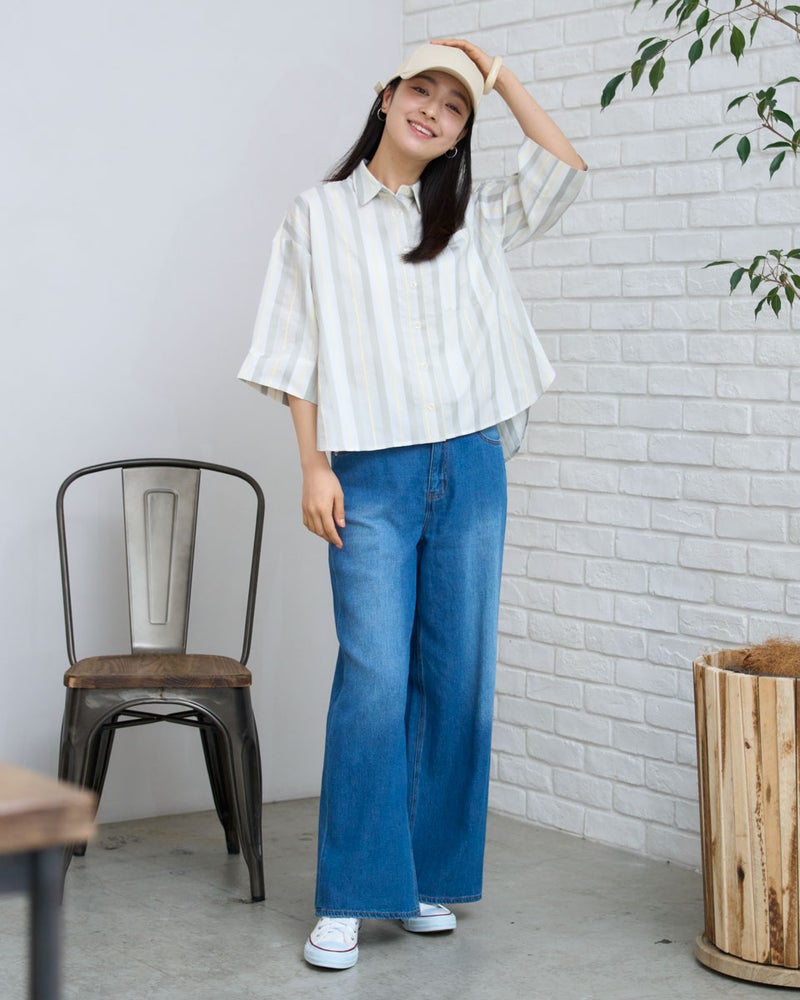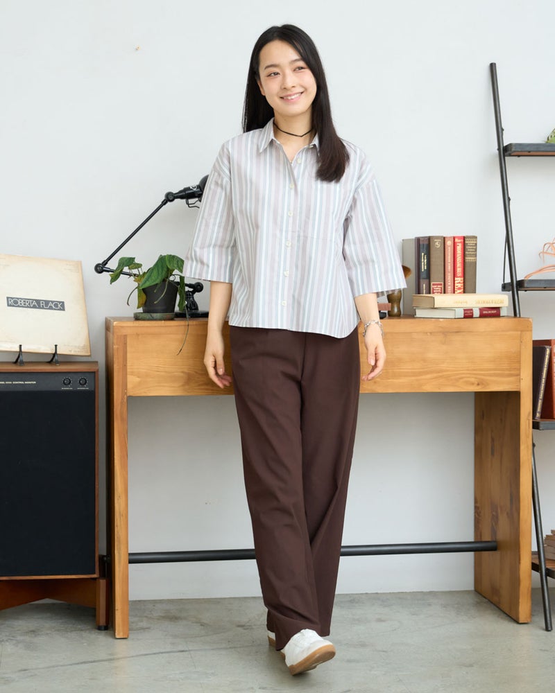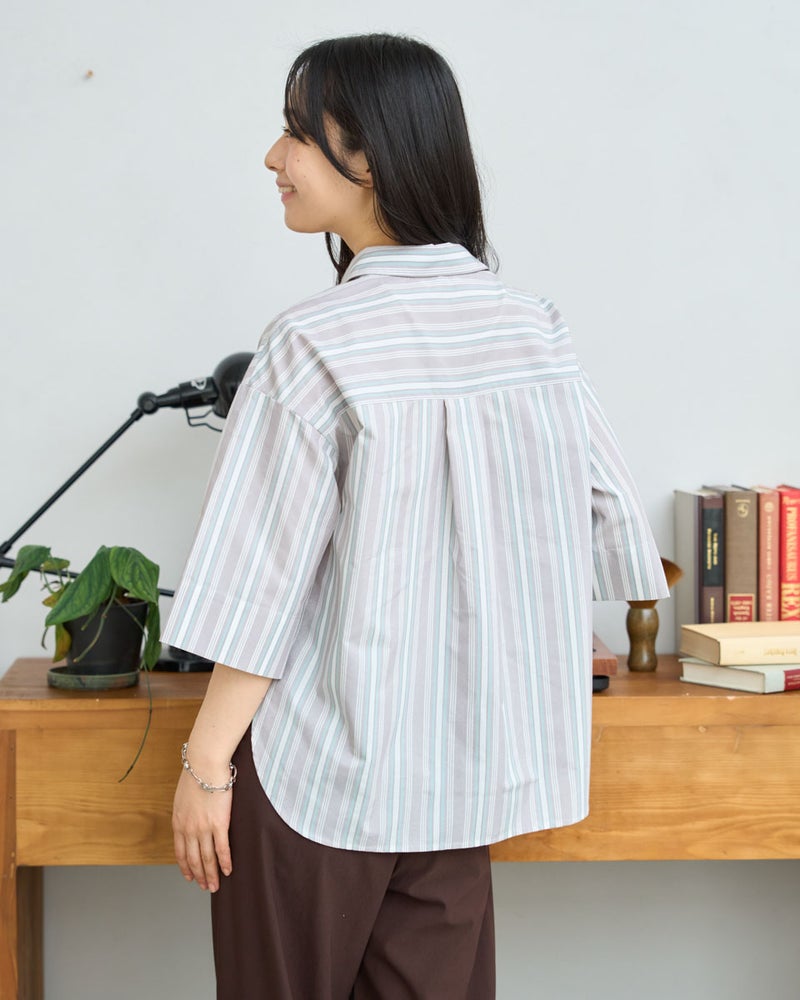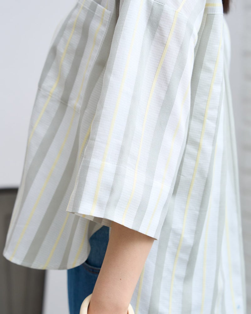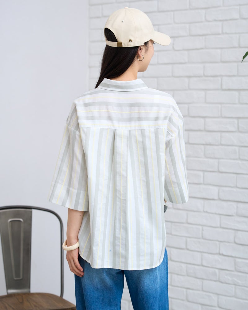 清涼感のあるドビーストライプが映える、正統派ながらも柔らかさを備えたシャツです。5分袖で肘や二の腕をカバーし、袖口を折り返してアクセントを付けることで、女性らしい華奢さとアクティブさを両立。ゆとりのあるボクシーシルエットは、ボタンを留めても羽織りとしてさらりと纏ってもサマになります。襟元を少し抜いて着こなせば、こなれ感のある大人カジュアルな印象に。通勤や通学といった日常使いから、週末の散策まで、どんなシーンでも好印象を与えてくれる頼もしい一着です。 モデル身長: 167 cm 着用サイズ: M サイズ Golden Bear White Label (WOMEN) ブラウス (WOMEN) 【着用アイテム】468U4350 はっ水シャツブルゾン 468U4461 フレンチスリーブTシャツ 468U4750 ワイドデニムパンツ 468U4751 ワイドデニムパンツ 468U4760 イージーパンツ 467RD011 キルトトートバッグ