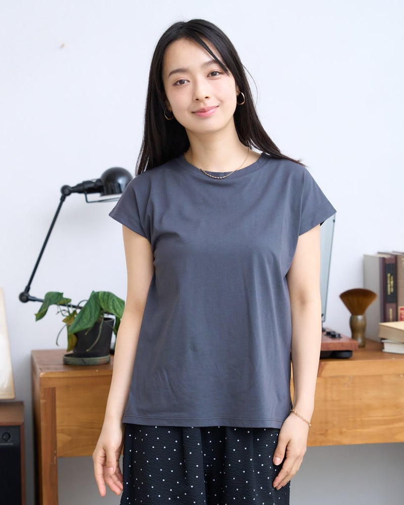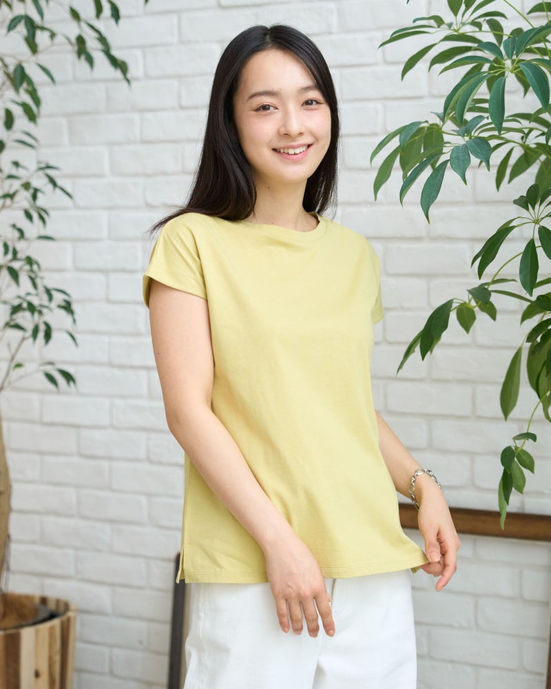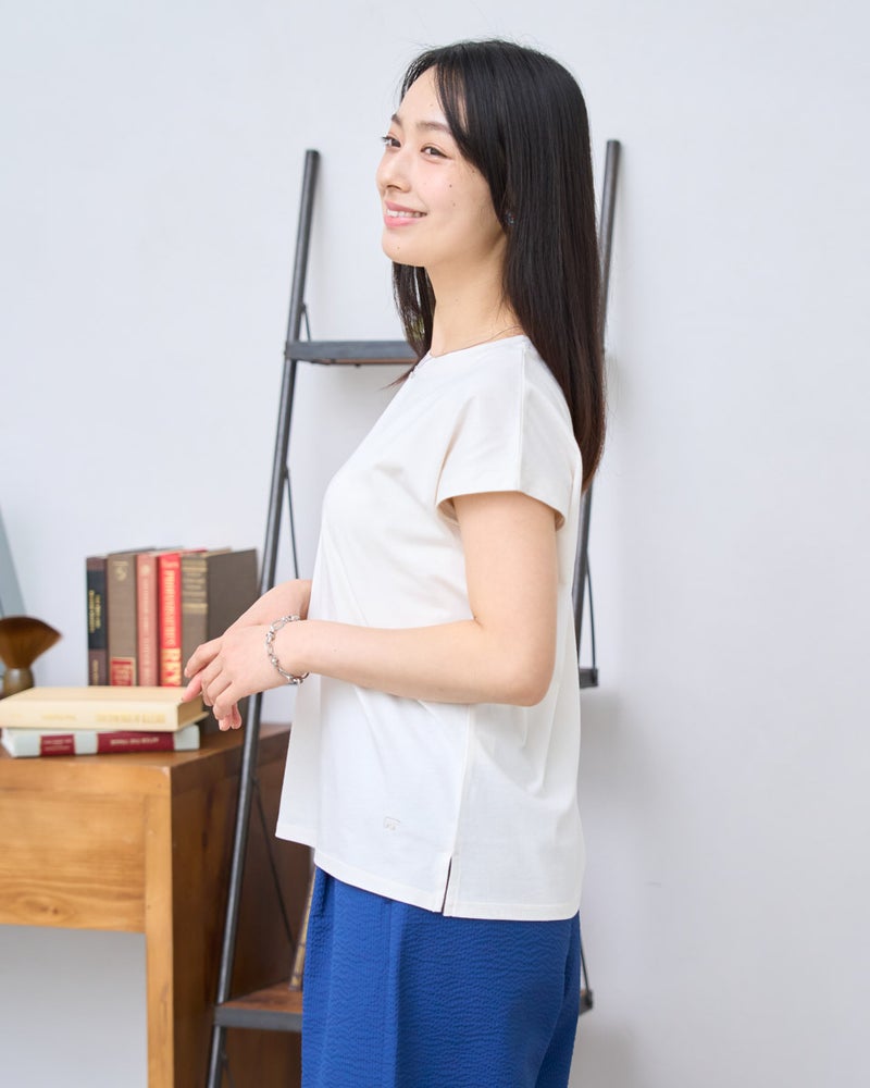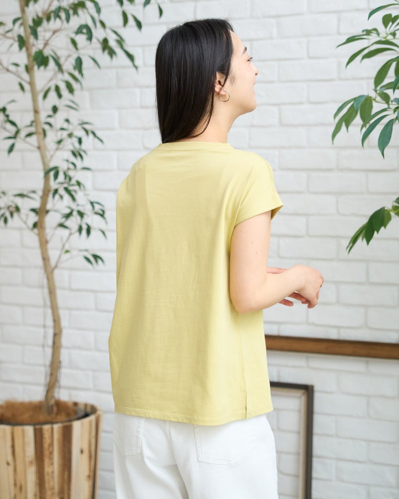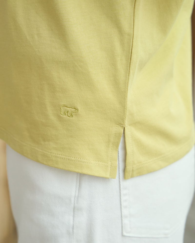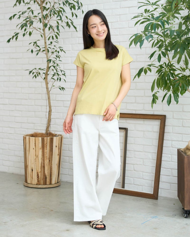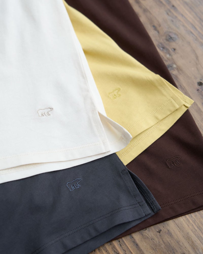 オーガニックコットンを100%使用したフレンチスリーブTシャツ。今年は裾にクマの刺繍を施し、特別な印象が得られるよう仕上げました。オーガニックコットンの柔らかな素材は1枚着として贅沢な一品。程よい開き感の襟ぐりにはアクセサリーも選びません。落ち着いたカラーリングはお洋服との相性も良く、毎日ローテーションで着回ししたくなるはずです。1枚着にして品の良さを味わえるアイテムです。 モデル身長: 167 cm 着用サイズ: M サイズ Golden Bear White Label (WOMEN) カットソー (WOMEN) 【着用アイテム】468U4750 ワイドデニムパンツ 468U4751 ワイドデニムパンツ 468U4760 イージーパンツ 468U4051 レーストートバック