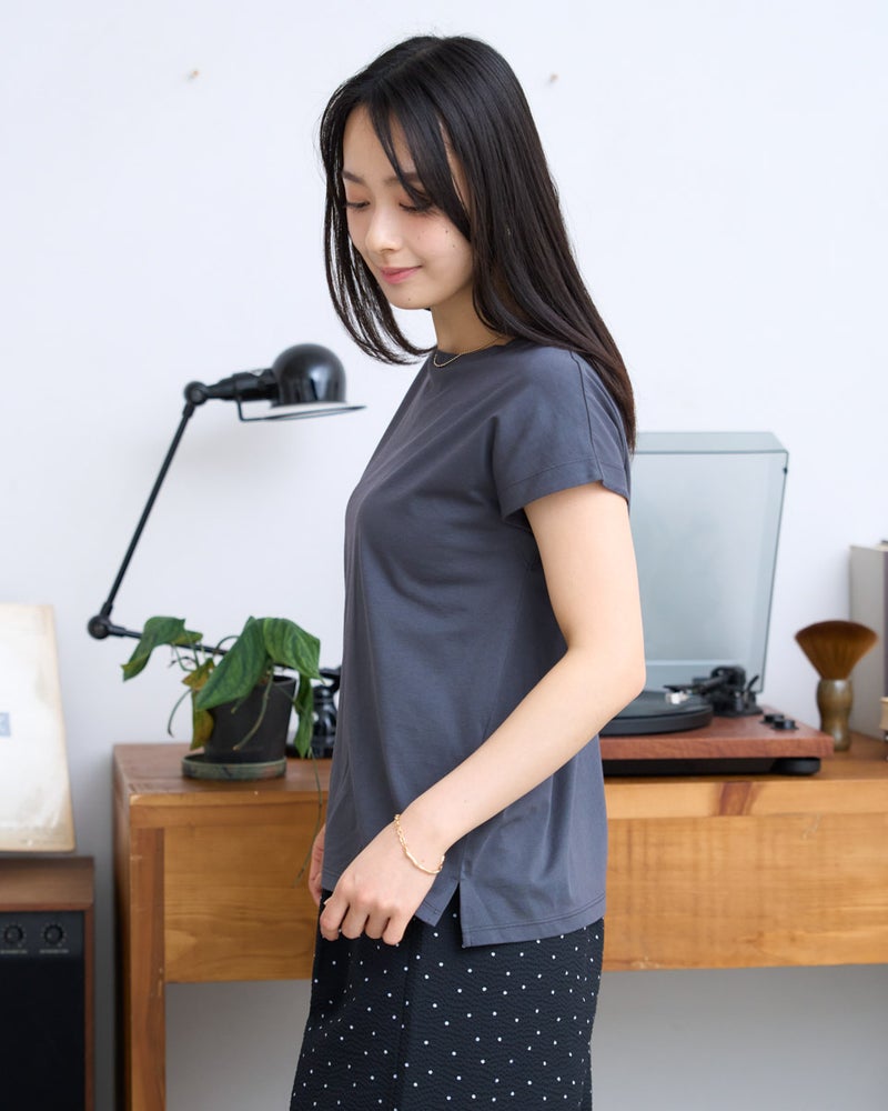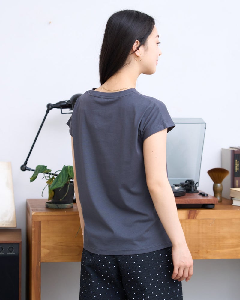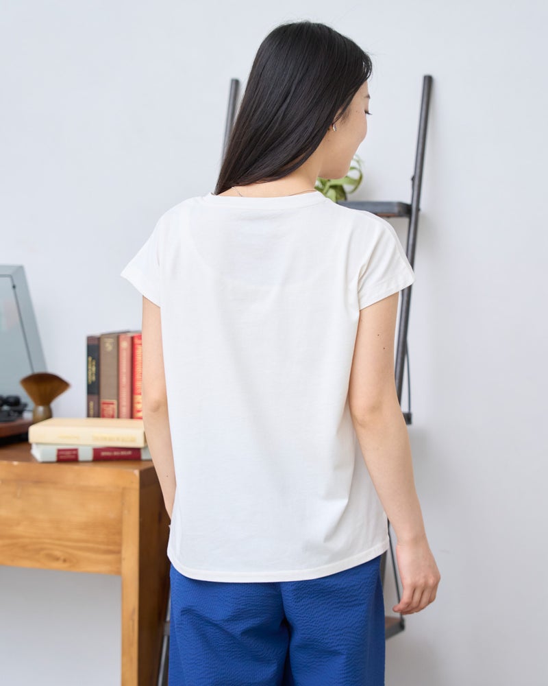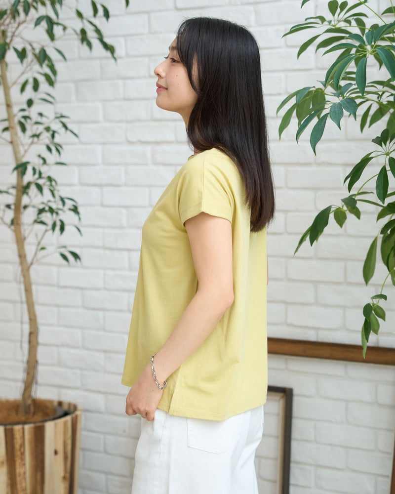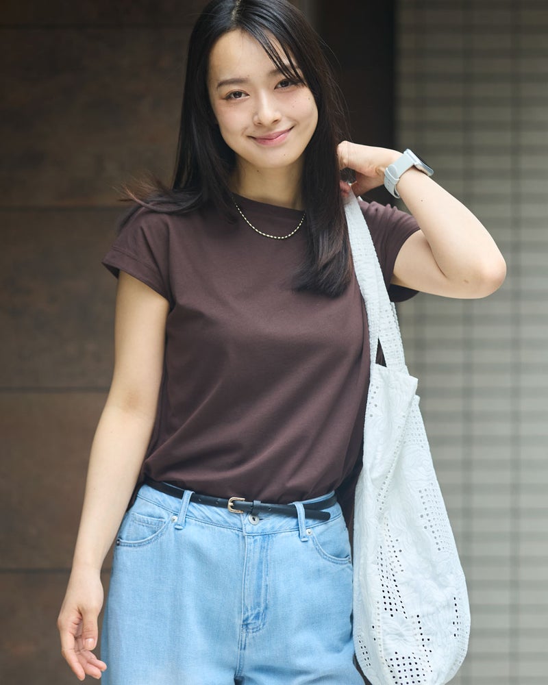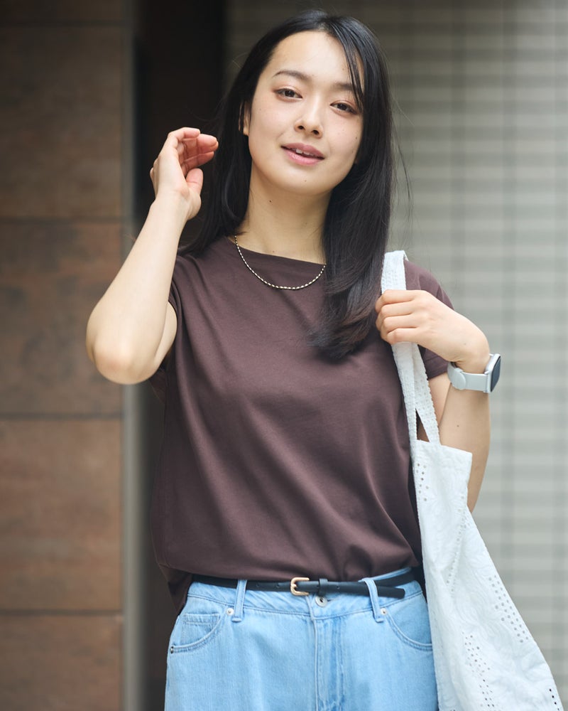 オーガニックコットンを100%使用したフレンチスリーブTシャツ。今年は裾にクマの刺繍を施し、特別な印象が得られるよう仕上げました。オーガニックコットンの柔らかな素材は1枚着として贅沢な一品。程よい開き感の襟ぐりにはアクセサリーも選びません。落ち着いたカラーリングはお洋服との相性も良く、毎日ローテーションで着回ししたくなるはずです。1枚着にして品の良さを味わえるアイテムです。 モデル身長: 167 cm 着用サイズ: M サイズ Golden Bear White Label (WOMEN) カットソー (WOMEN) 【着用アイテム】468U4750 ワイドデニムパンツ 468U4751 ワイドデニムパンツ 468U4760 イージーパンツ 468U4051 レーストートバック
