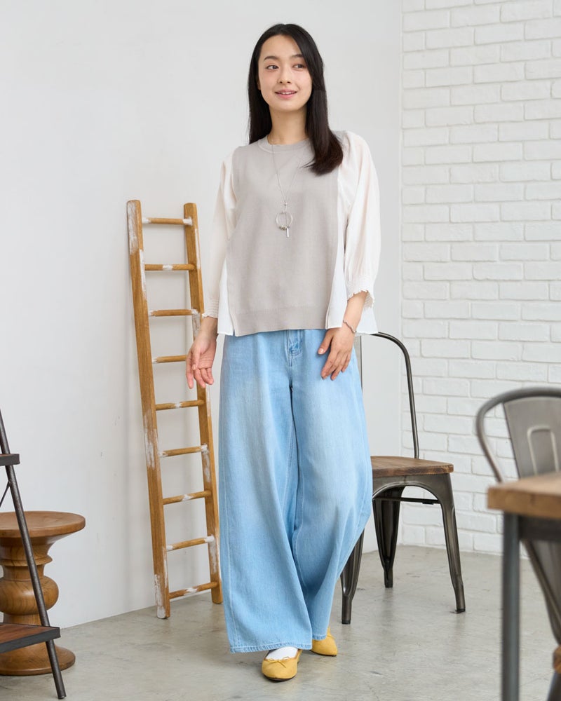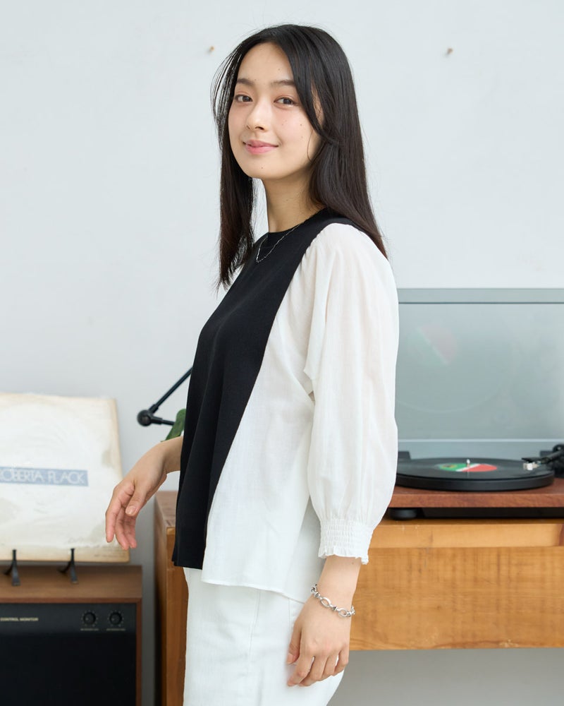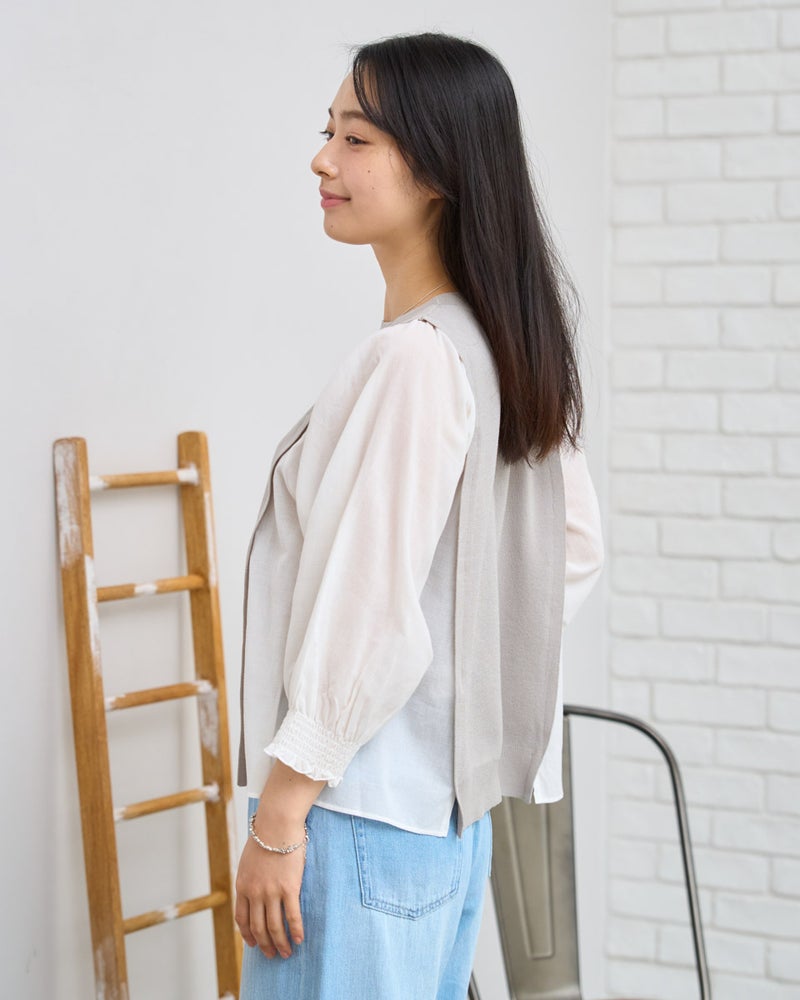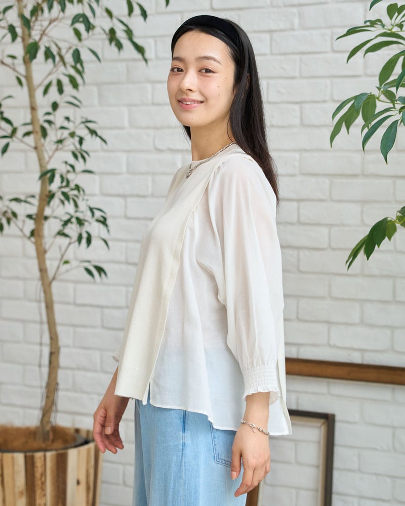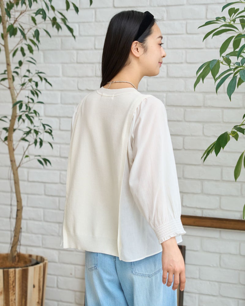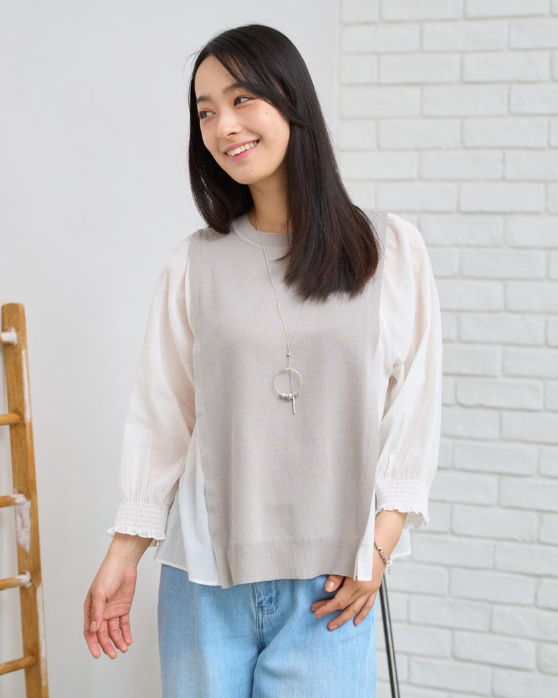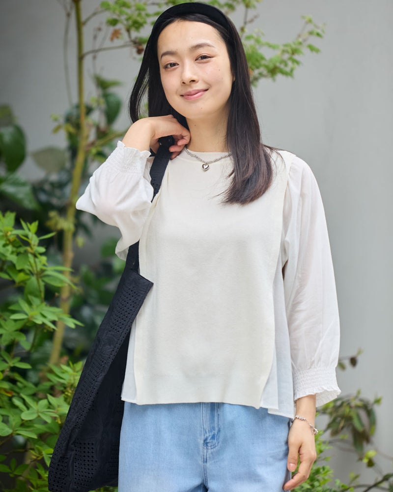 ニットの優しさと異素材の軽やかさを掛け合わせた、1枚でサマになるドッキングプルオーバーです。身頃の前後にはハリ感のあるドライタッチな糸を使用し、程よい弾力とヨコ方向のテンションに優れた総針編みで快適な着用感に仕上げました。袖と脇には細かく揺らぐ柔らかな別地を配し、動きに合わせてふんわりとした表情を生み出します。アンティークのスモックを思わせる袖口のシャーリングや、ふんわりと膨らむ袖が女性らしいアクセント。袖のさりげないシアー感が甘さを程よく抑え、大人の装いにも取り入れやすいバランスに仕上げています。デニムと合わせて友人とのランチに、スラックスを合わせればオフィスや学校行事にも。忙しい朝でもこれ一着で洗練された装いが整い、オン・オフ問わず幅広いシーンで自信を持って着こなせます。