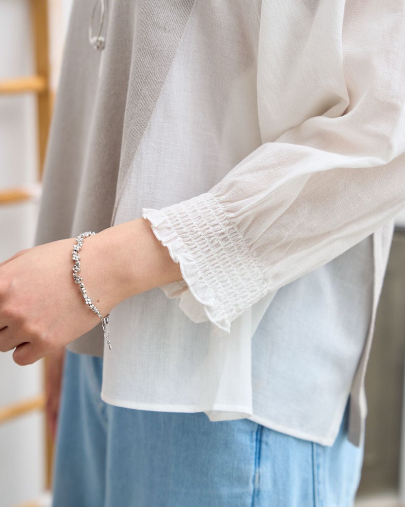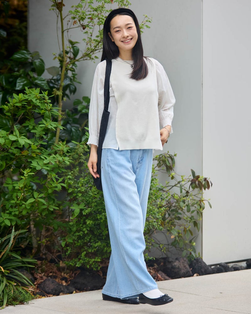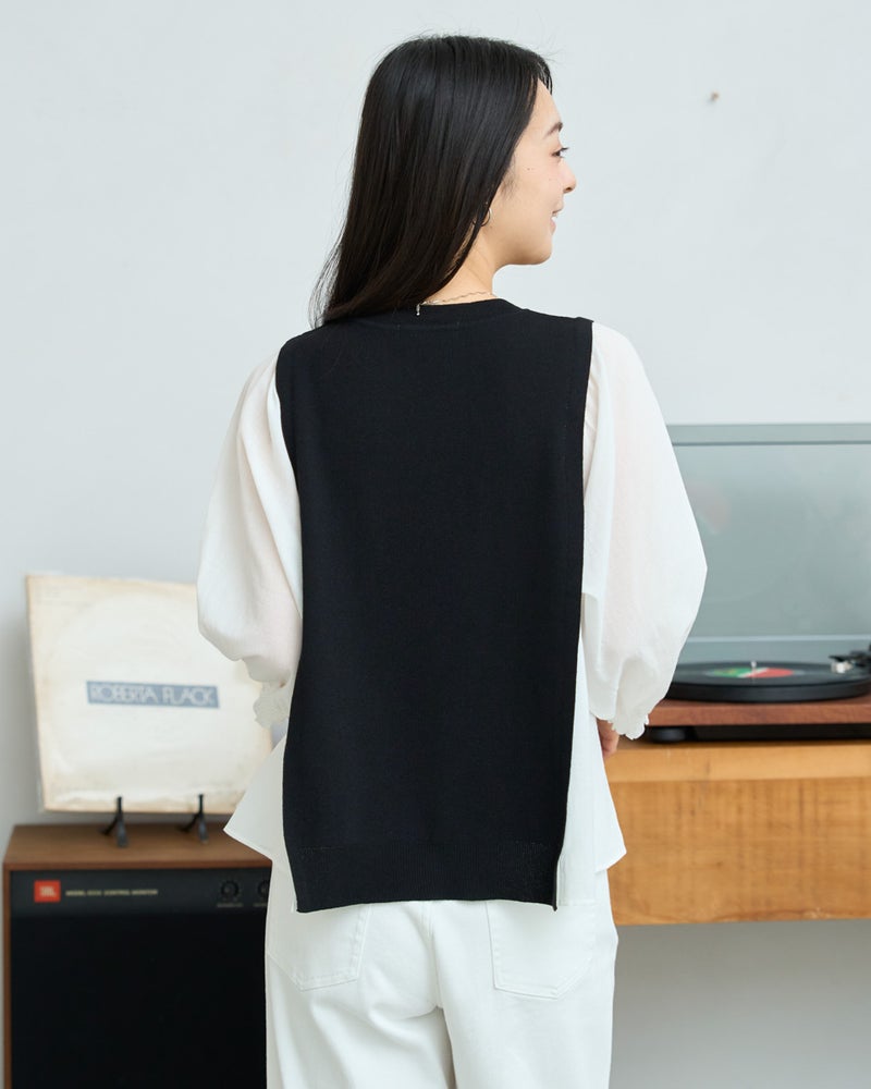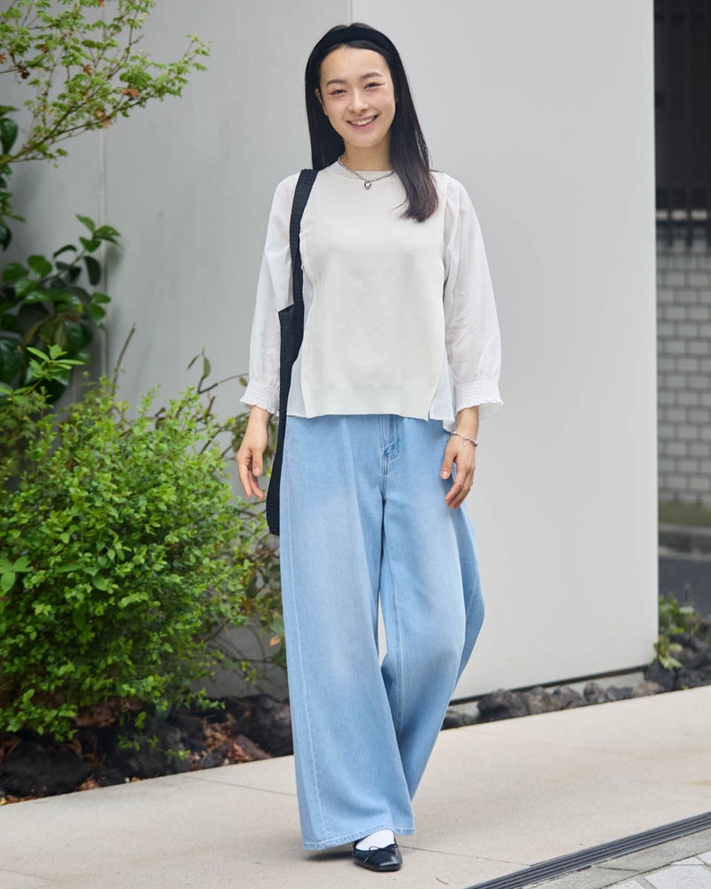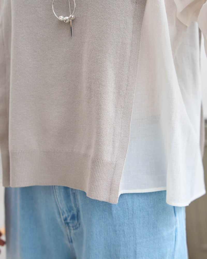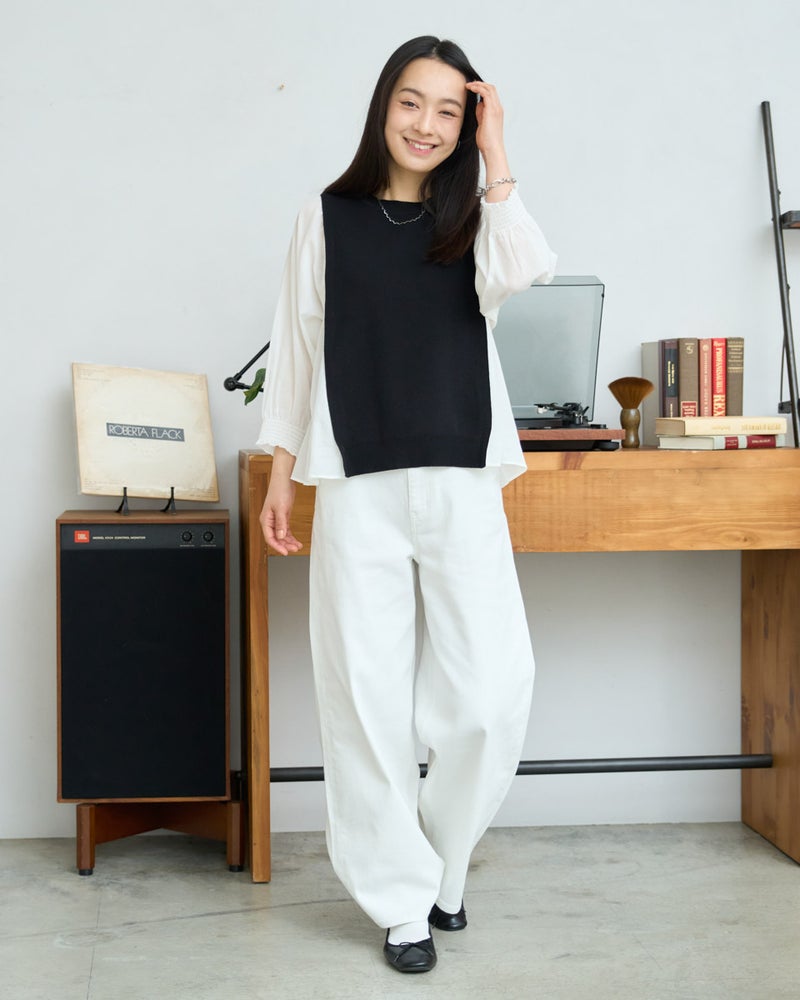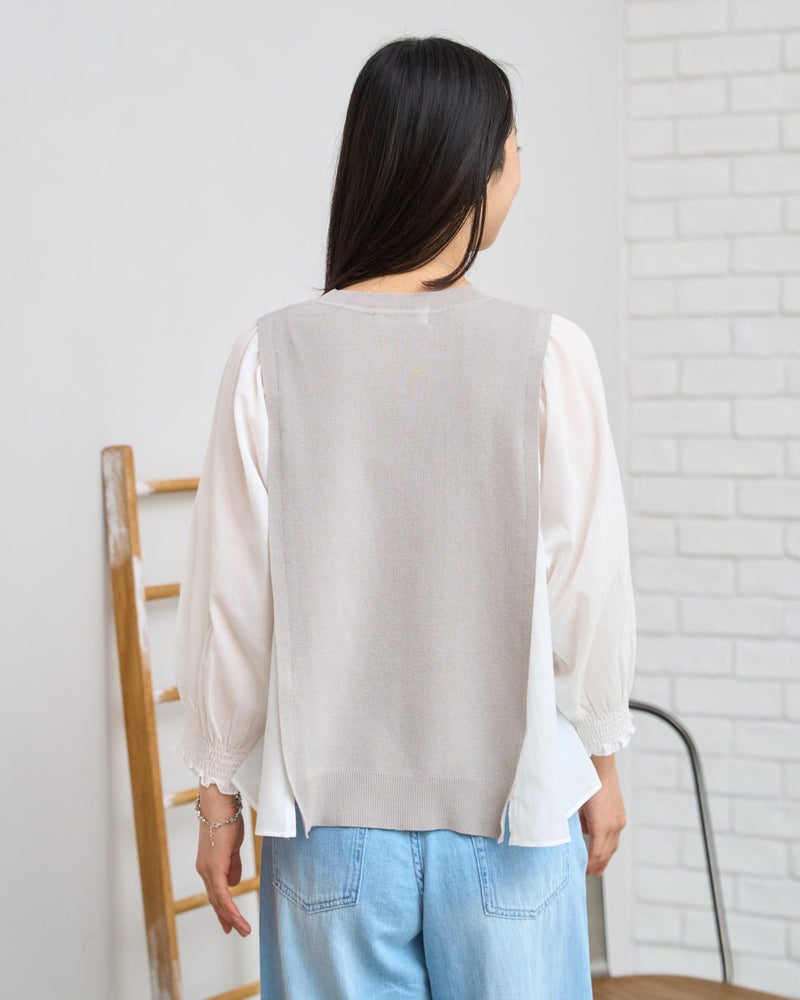 ニットの優しさと異素材の軽やかさを掛け合わせた、1枚でサマになるドッキングプルオーバーです。身頃の前後にはハリ感のあるドライタッチな糸を使用し、程よい弾力とヨコ方向のテンションに優れた総針編みで快適な着用感に仕上げました。袖と脇には細かく揺らぐ柔らかな別地を配し、動きに合わせてふんわりとした表情を生み出します。アンティークのスモックを思わせる袖口のシャーリングや、ふんわりと膨らむ袖が女性らしいアクセント。袖のさりげないシアー感が甘さを程よく抑え、大人の装いにも取り入れやすいバランスに仕上げています。デニムと合わせて友人とのランチに、スラックスを合わせればオフィスや学校行事にも。忙しい朝でもこれ一着で洗練された装いが整い、オン・オフ問わず幅広いシーンで自信を持って着こなせます。