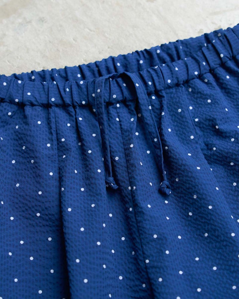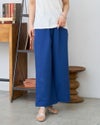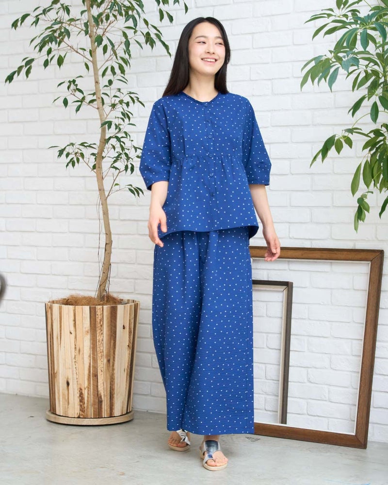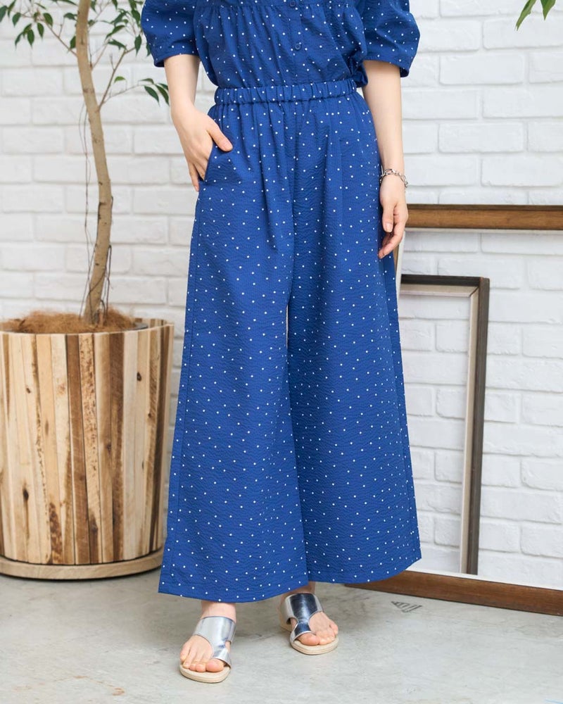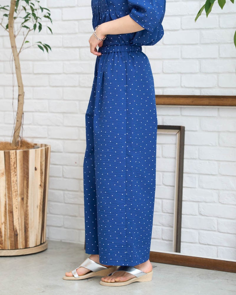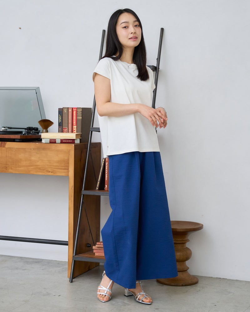 細やかな畝が広がるサッカー生地を採用した、軽やかな履き心地のイージーパンツです。約3mmほどの凹凸が肌に触れる面積を減らし、熱や湿気を逃がしやすいため、暑い季節も涼しく快適に着用いただけます。ウエストはオールゴム仕様で着脱もスムーズ。内側の紐でサイズ調整ができるため、ずり下がりを防ぎながら安心して着用できます。ほどよく広がる裾が動きに合わせて揺れ、リラックス感の中にも上品な印象を演出します。同素材のブラウス468U4360と合わせたセットアップスタイルはもちろん、トップスをシンプルにまとめるだけでもバランスよく決まる一本。ジレでクールに、短丈アウターで軽やかに仕上げる着こなしもおすすめです。ご自宅で簡単に洗え、旅行や出張のお供としても最適な一着です。