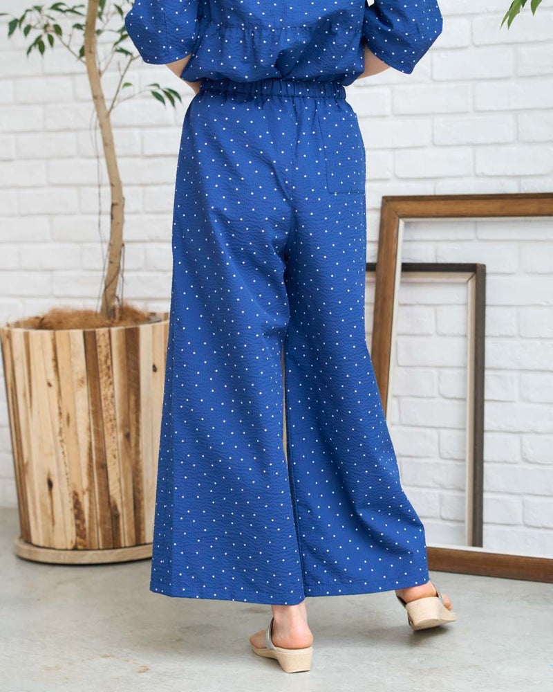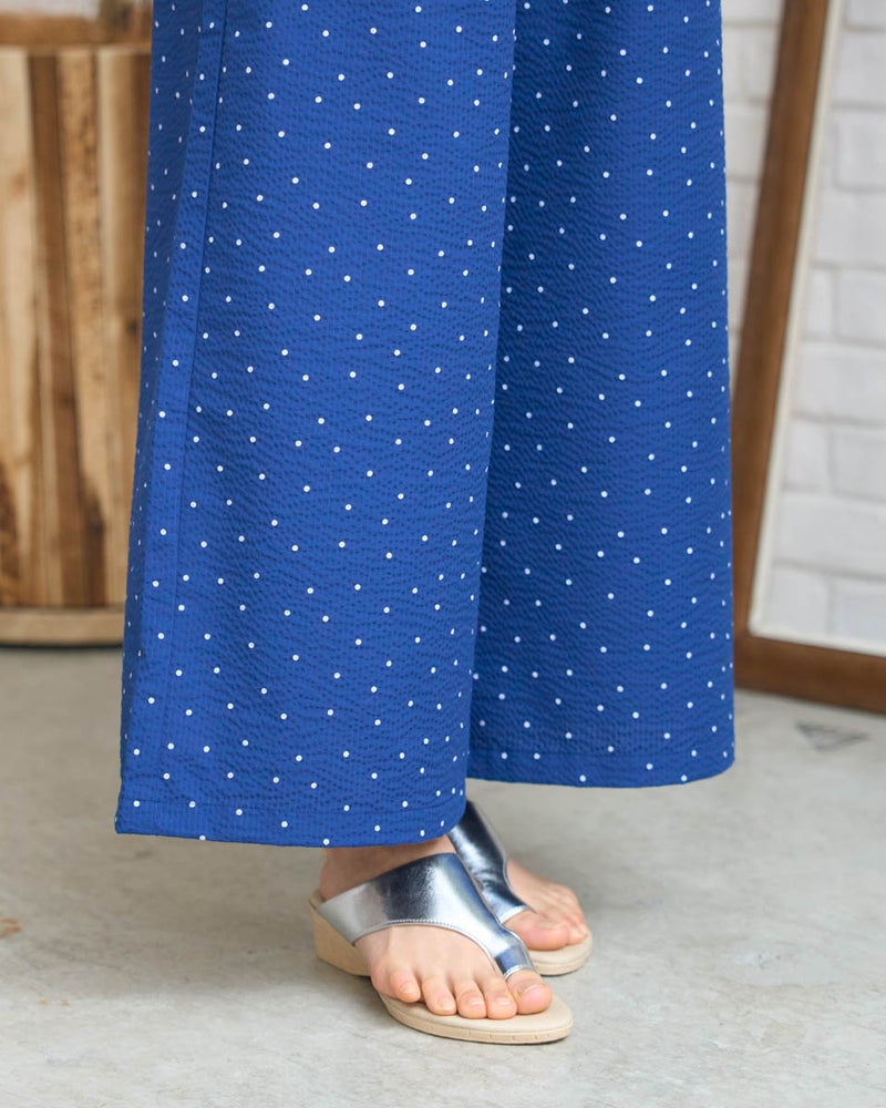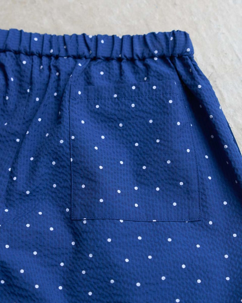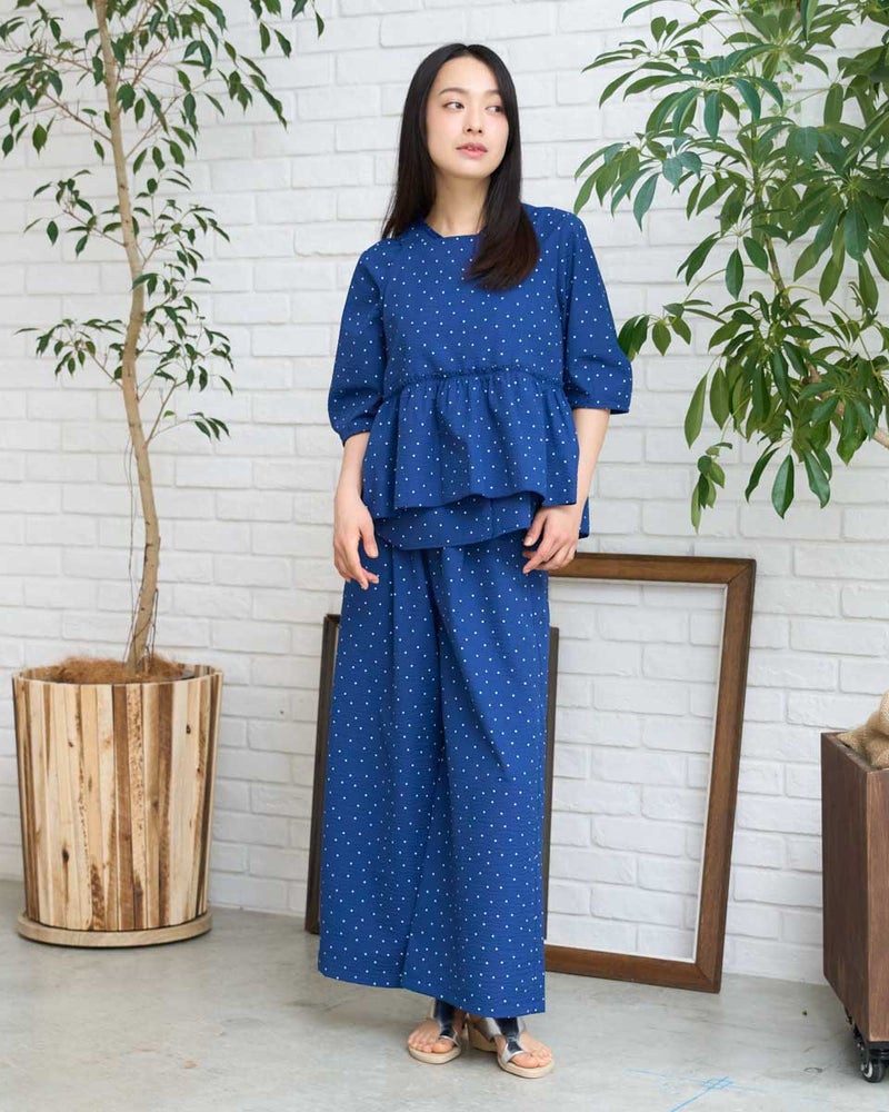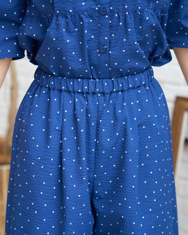 細やかな畝が広がるサッカー生地を採用した、軽やかな履き心地のイージーパンツです。約3mmほどの凹凸が肌に触れる面積を減らし、熱や湿気を逃がしやすいため、暑い季節も涼しく快適に着用いただけます。ウエストはオールゴム仕様で着脱もスムーズ。内側の紐でサイズ調整ができるため、ずり下がりを防ぎながら安心して着用できます。ほどよく広がる裾が動きに合わせて揺れ、リラックス感の中にも上品な印象を演出します。同素材のブラウス468U4360と合わせたセットアップスタイルはもちろん、トップスをシンプルにまとめるだけでもバランスよく決まる一本。ジレでクールに、短丈アウターで軽やかに仕上げる着こなしもおすすめです。ご自宅で簡単に洗え、旅行や出張のお供としても最適な一着です。
