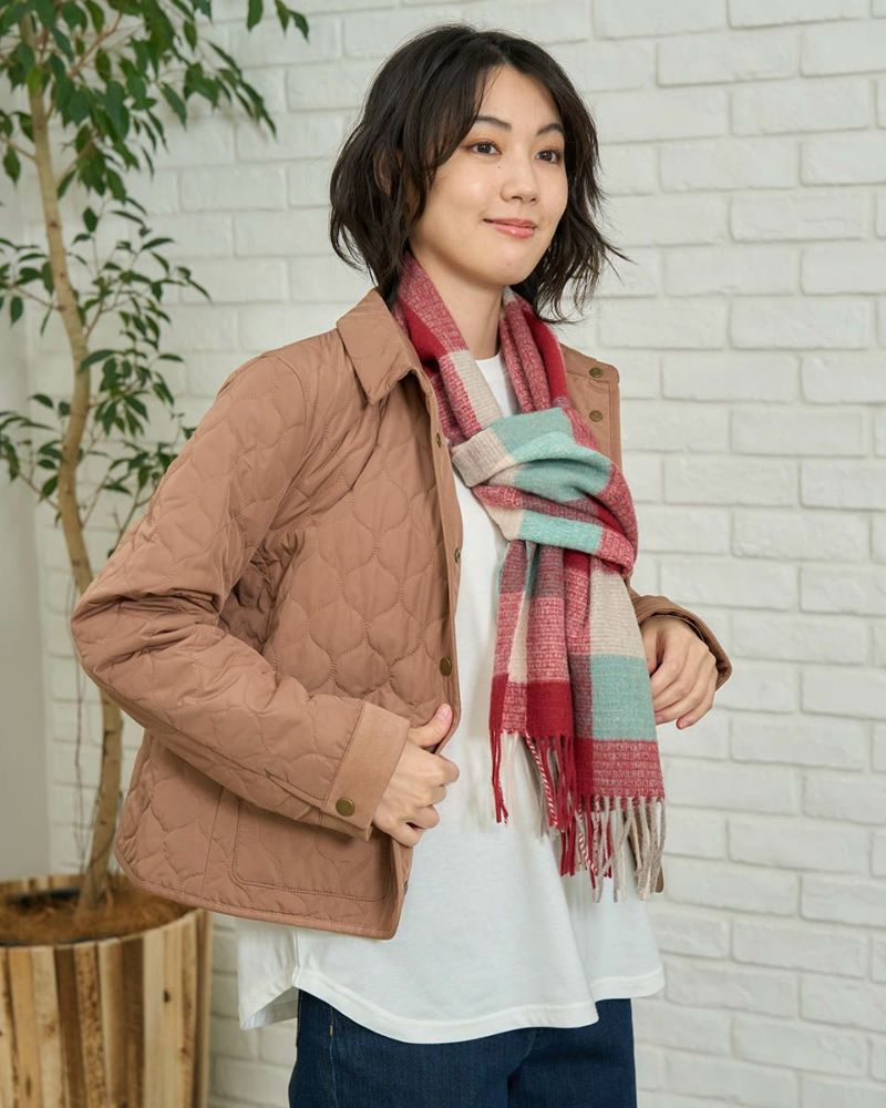 ウール100%の暖かなチェックストールです。カジュアルスタイルを華やかにしてくれます。 Golden Bear WOMEN アクセサリ (WOMEN) 【着用アイテム】467RC414 天竺無地・ボーダー長袖Tシャツ 468RD453 ワンポイント刺しゅうパーカ 467RD101 キルトショートジャケット 468RC751 デニムスカート