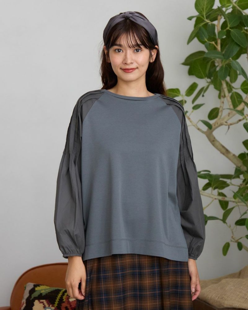 表裏ともに整った編地のスムースを身頃に使ったデザインカットソーです。優しい肌触りと適度な厚みで夏物とは違った落ち着き感と保温性があり、気温の下がってくる時期におすすめのアイテム。袖にはほのかな光沢のあるローンをセレクト。ダレ感がないため袖山に施したピンタックの凹凸感も消えることがなく華やかさが魅力の1着。身頃、袖共にゆとりがあるのでシアーインナーを合わせたりファーベストをレイヤードするのもおすすめ。黒とチャコールのモード感溢れるカラー展開は洒落感も抜群。地金のジュエリーとも相性が良くオフィス使いも◎リップとデニムを添え女子会でお召しになっても素敵です。