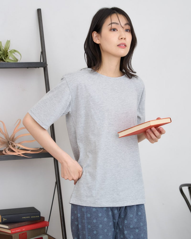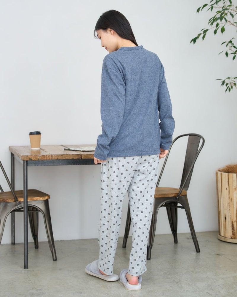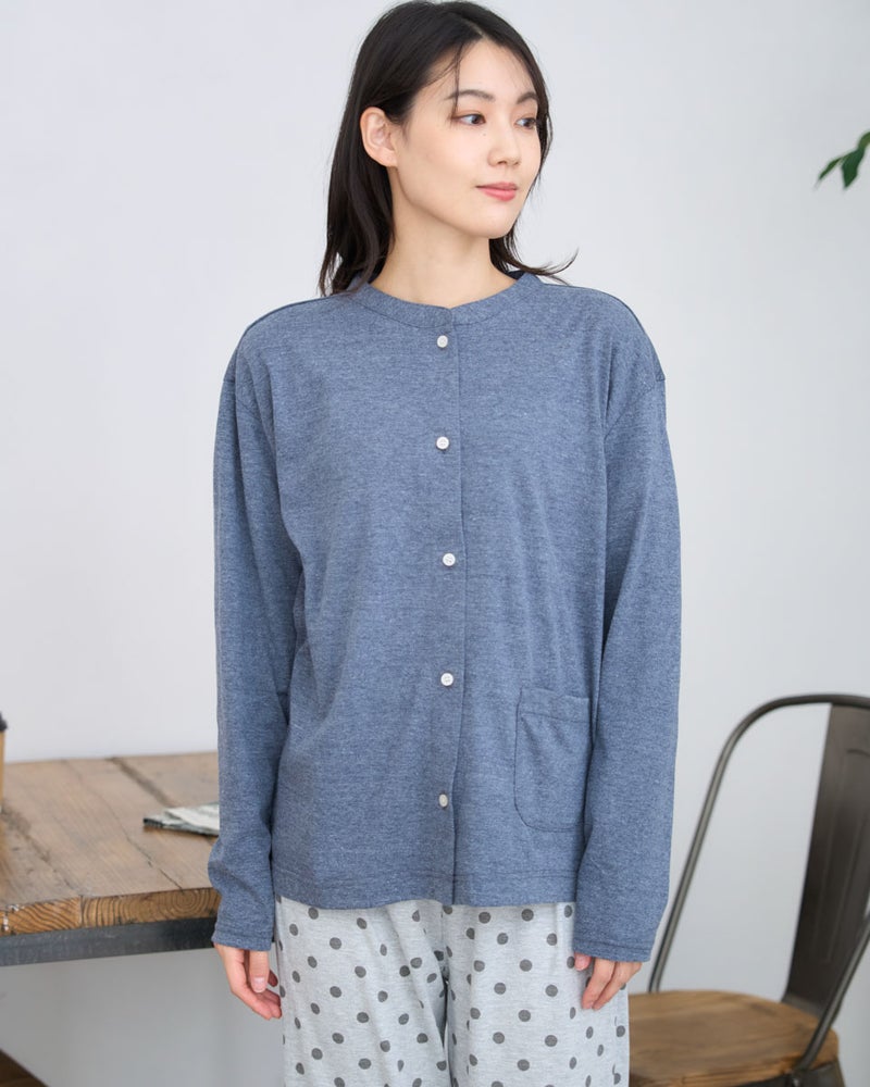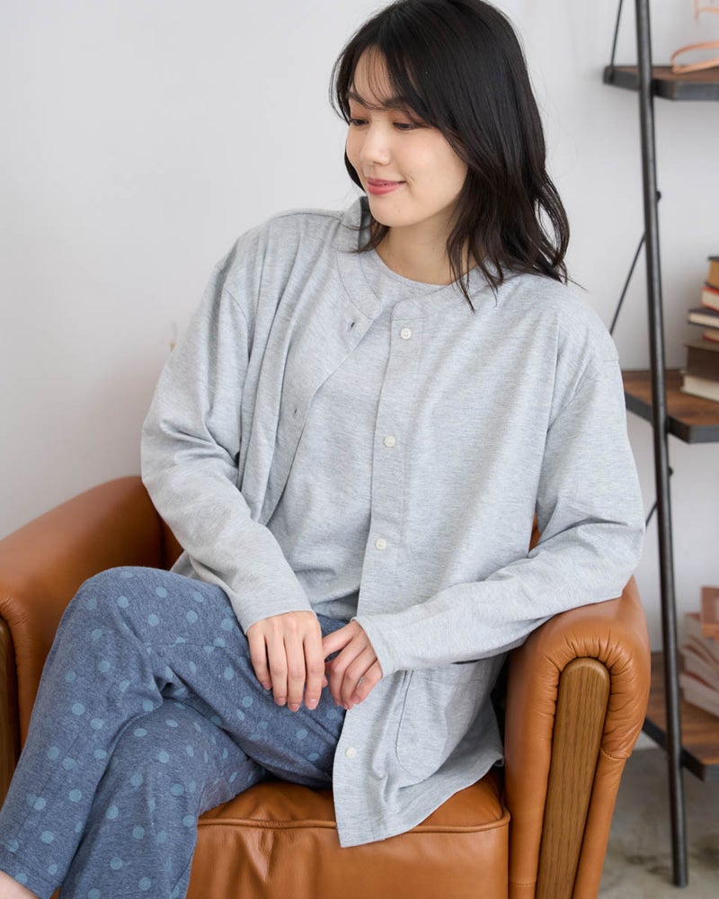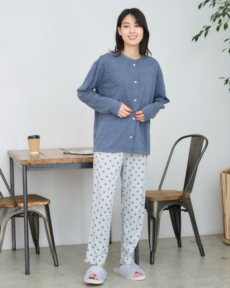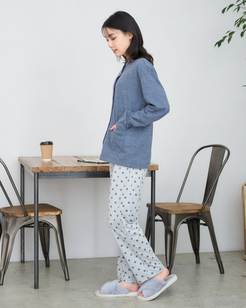 ドット柄パンツに、着まわしのきくアンサンブルをあわせたカットソーパジャマです。半袖のインナーTシャツと肌寒い季節に気軽に羽織れるカーディガンを組み合わせた便利な三点セットです。