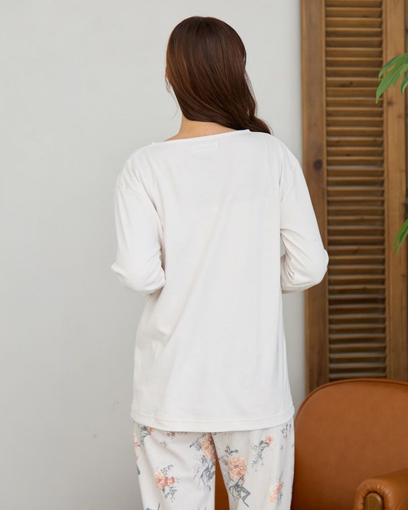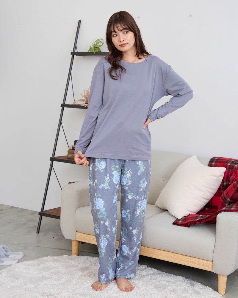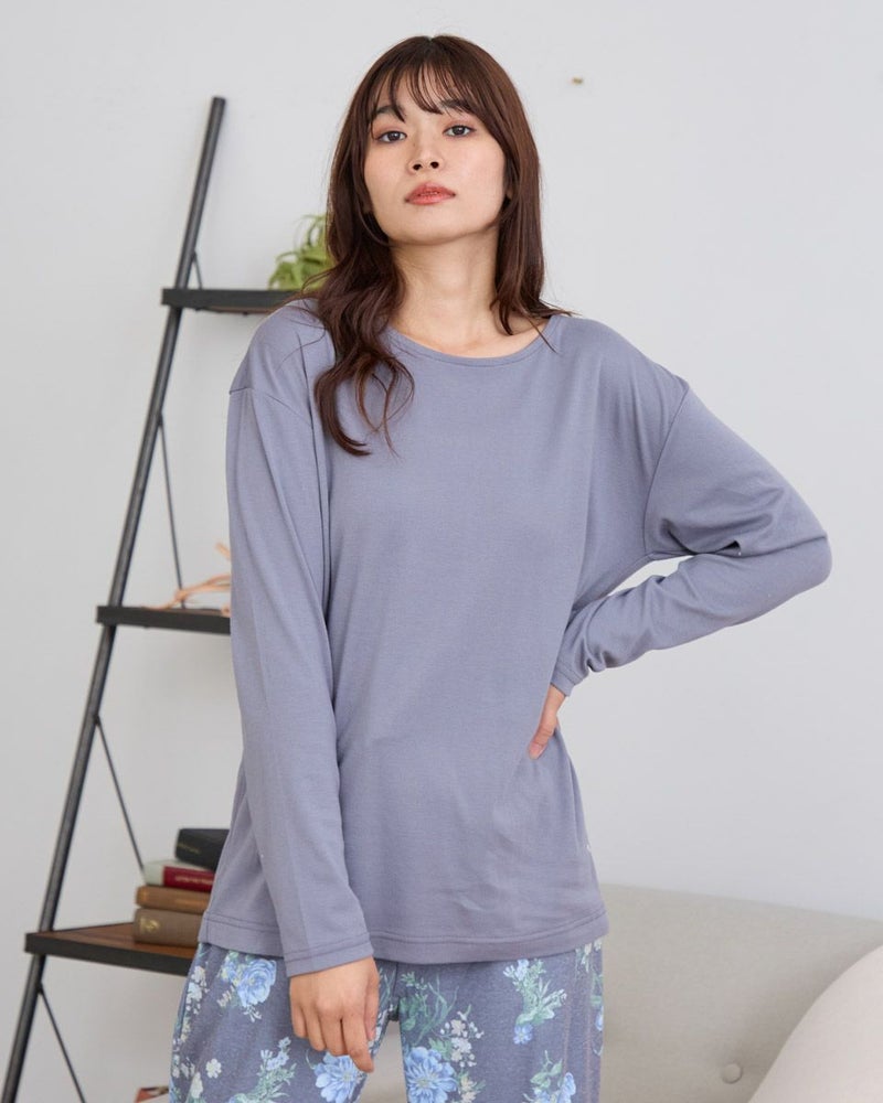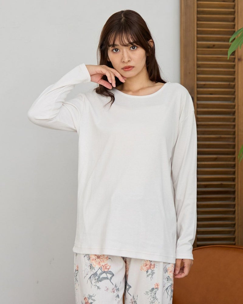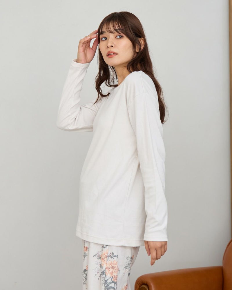 やや肌寒い季節にぴったりの、長袖・長ズボンのカットソーパジャマと着回しやすいインナーTシャツのセットです。パジャマは裏側に起毛加工を施し、肌あたり柔らかく暖かな風合いに仕上げました。着丈を長めに設計しているので、腰回りの冷えを防いでくれます。インナーのTシャツは単品でも活躍するデザインで、季節に応じて様々な着こなしが楽しめる汎用性の高いアンサンブルセットです。おうち時間はもちろん、着回しの幅広さで長いシーズン快適にお使いいただけます。カラーは温かな印象のベージュと落ち着いた印象のネイビーの2色です。