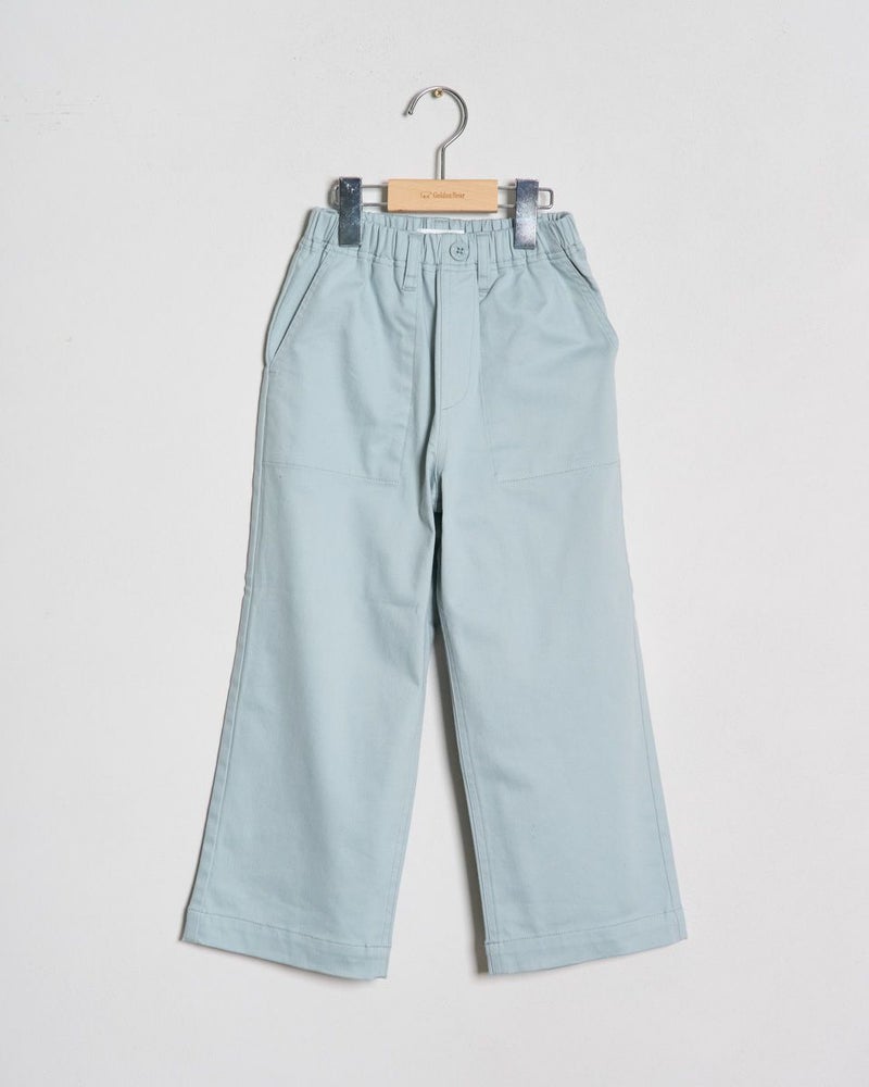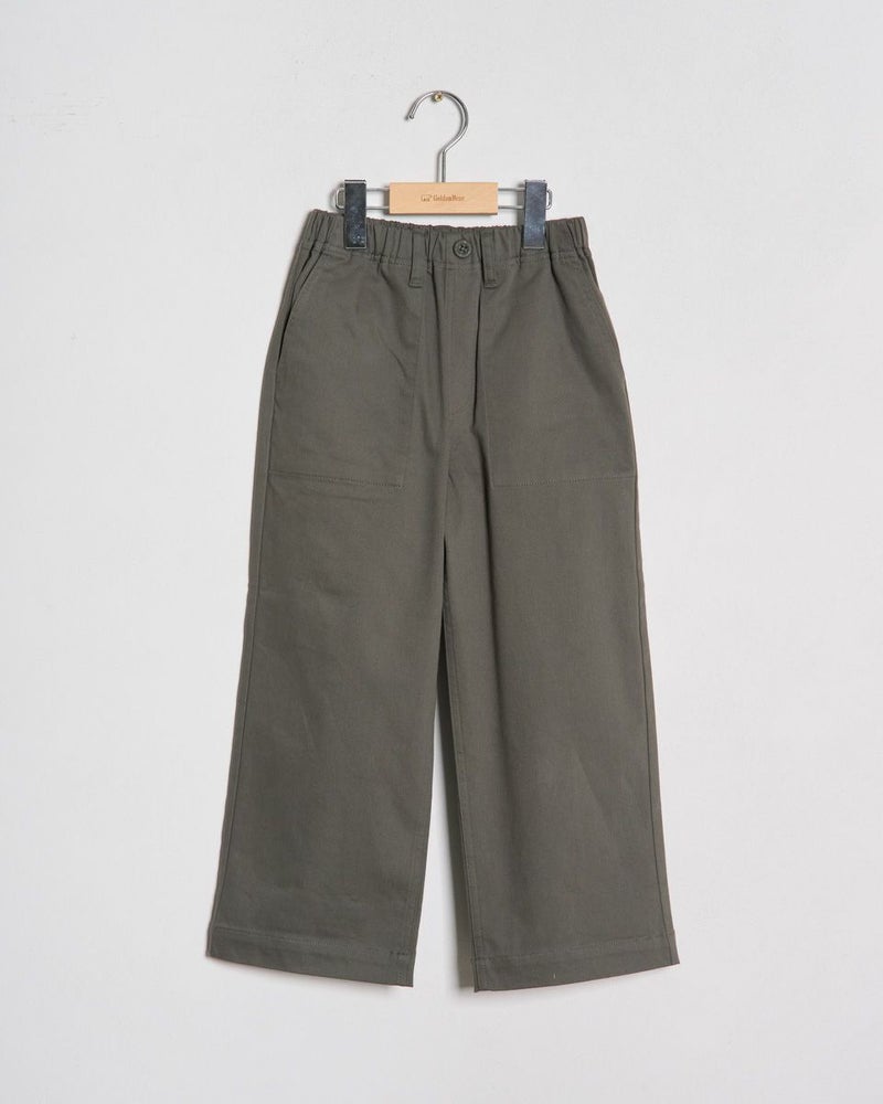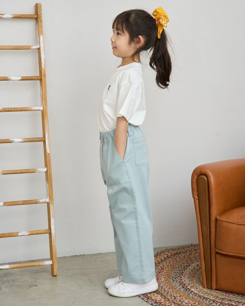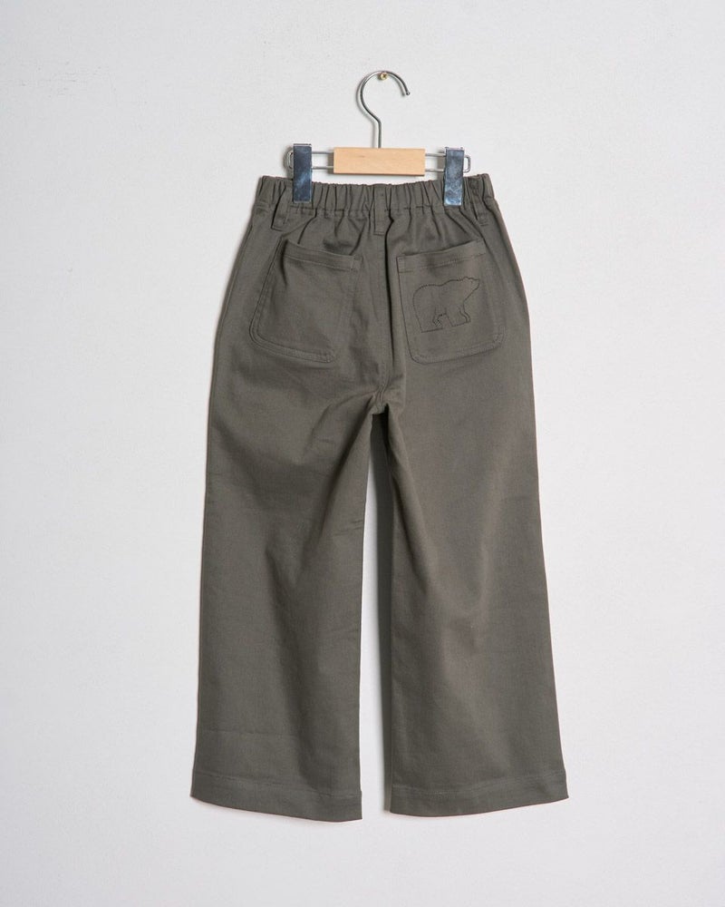 綿混でストレッチ性の良い素材を使用したストレートシルエットのチノパンツです。ウエストははきやすいオールゴム仕様。前後にポケットが有り後ろの右側のポケットに枠くまの刺繍を入れています。