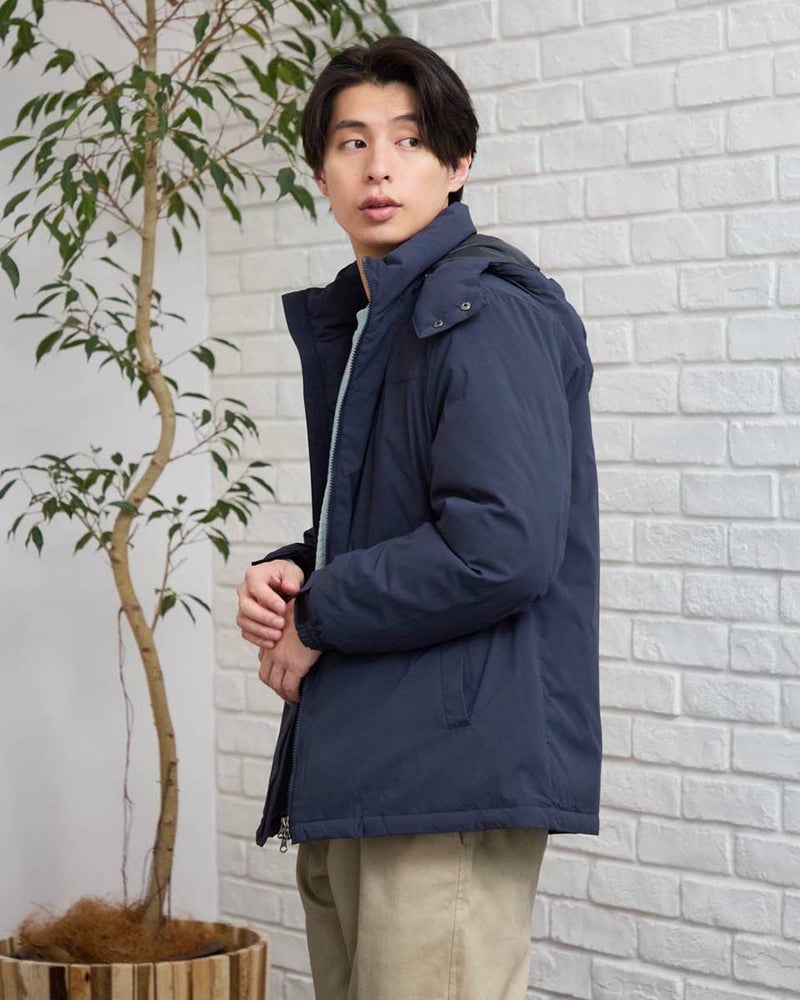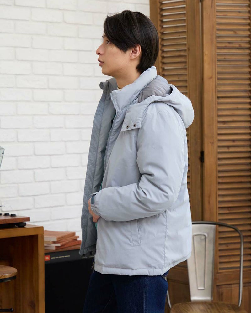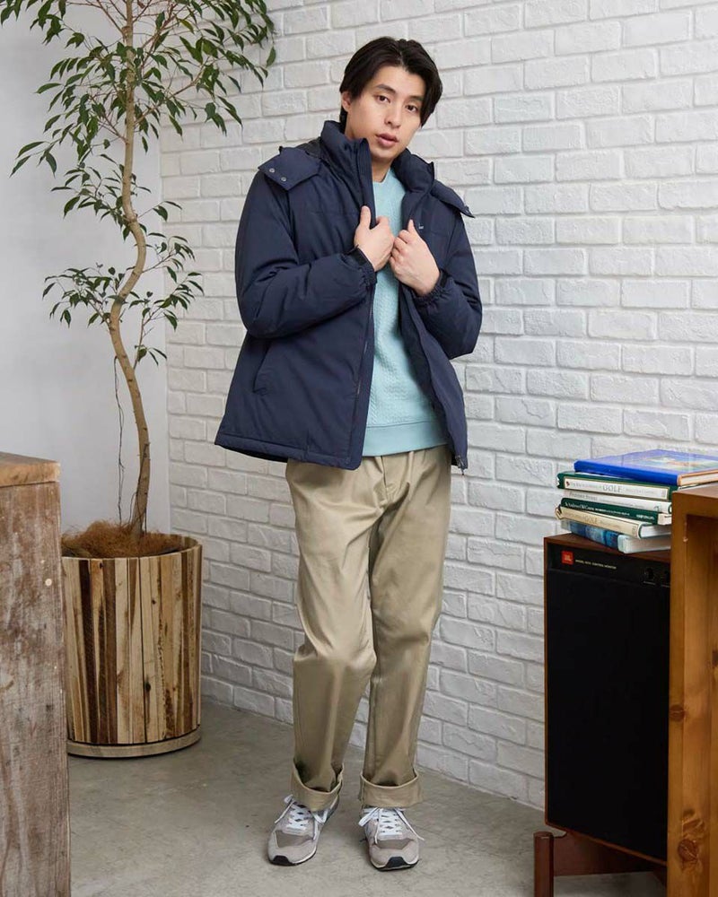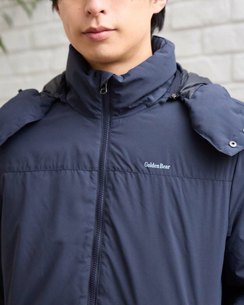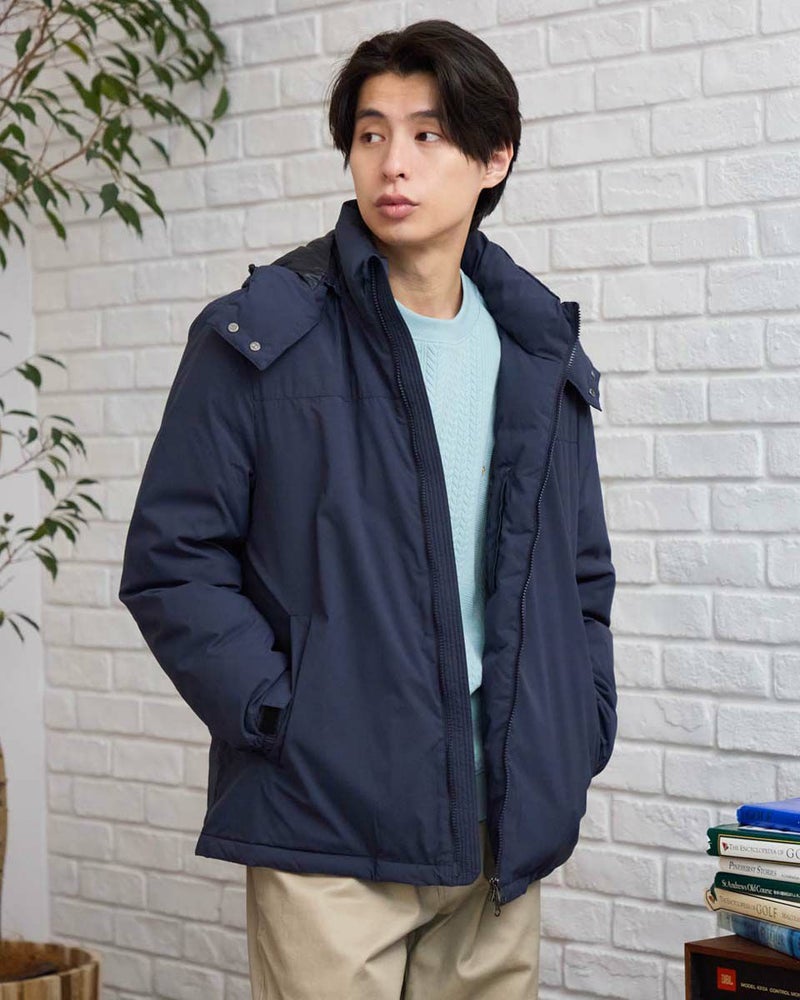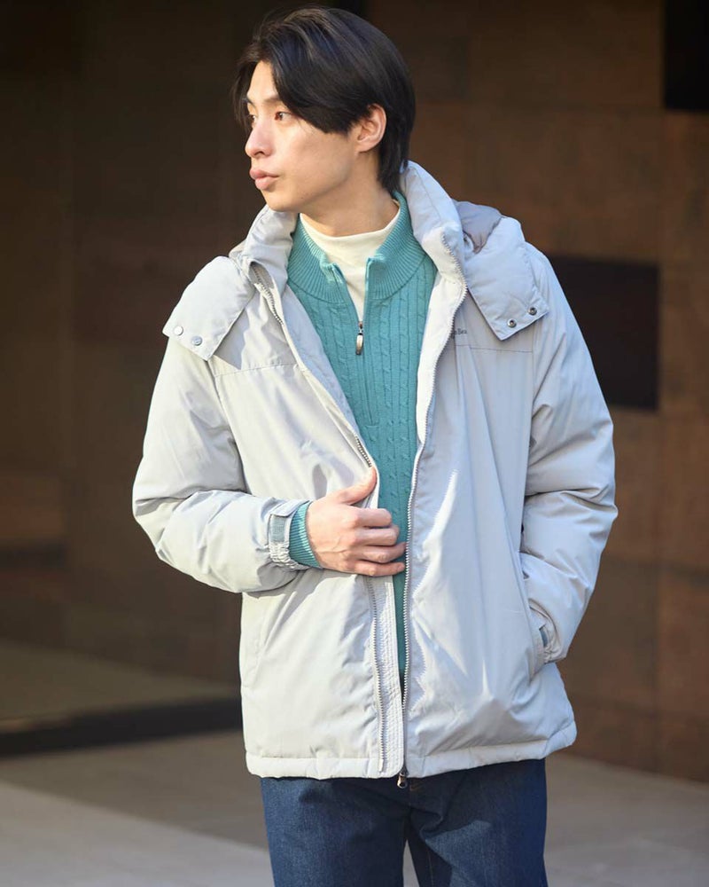 環境にも優しい、着回し力抜群の優秀ダウン。取り外し可能なフードで、その日のスタイルに合わせて着こなしが変えられるダウンブルゾンです。光沢感を抑えた上品な素材感とはっ水機能で、カジュアルになりすぎず大人の装いを演出。さらに、裏地には静電気防止加工が施されているので、冬の不快なパチパチも軽減。ダウンは、回収しきれいに洗浄した羽毛をリサイクルし限りある資源の有効活用を目指すグリーンダウンを使用し、おしゃれを楽しみながら地球にも優しい一着です。このダウンで、暖かさと快適さ、そしてファッションを楽しんでください。 モデル身長: 180 cm 着用サイズ: L サイズ Golden Bear MEN アウター (MEN) 【着用アイテム】314RD433 吸湿発熱ハイネック長袖Tシャツ 314RF411 クルーネックスウェット 314RF631 ハーフZIPケーブルニット 314R8702 デニム