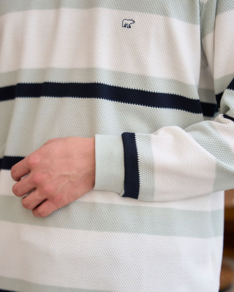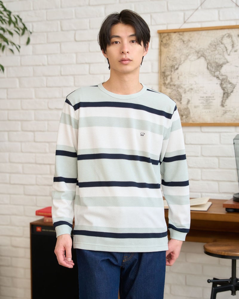 独特の表面感が特徴のパイナップル編みで表現された、マルチボーダー柄の長袖Tシャツです。素材感と相まって、まるでニットのような豊かな表情。大胆なピッチのマルチボーダー柄が、あなたの着こなしの主役になります。程よい厚みの素材なので、インナーとしてだけでなく、一枚着としても大活躍。デニムやチノパンと合わせて、旬のカジュアルスタイルを楽しんでください。 モデル身長: 180 cm 着用サイズ: L サイズ Golden Bear MEN カットソー (MEN) 同デザイン大きい(3Lサイズ)はこちら 【着用アイテム】314U4730 超ストレッチパンツ 314U1702 ストレッチデニム