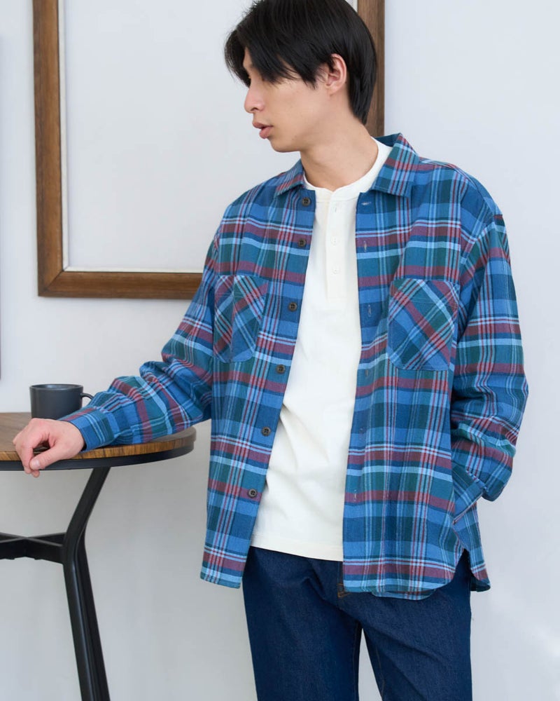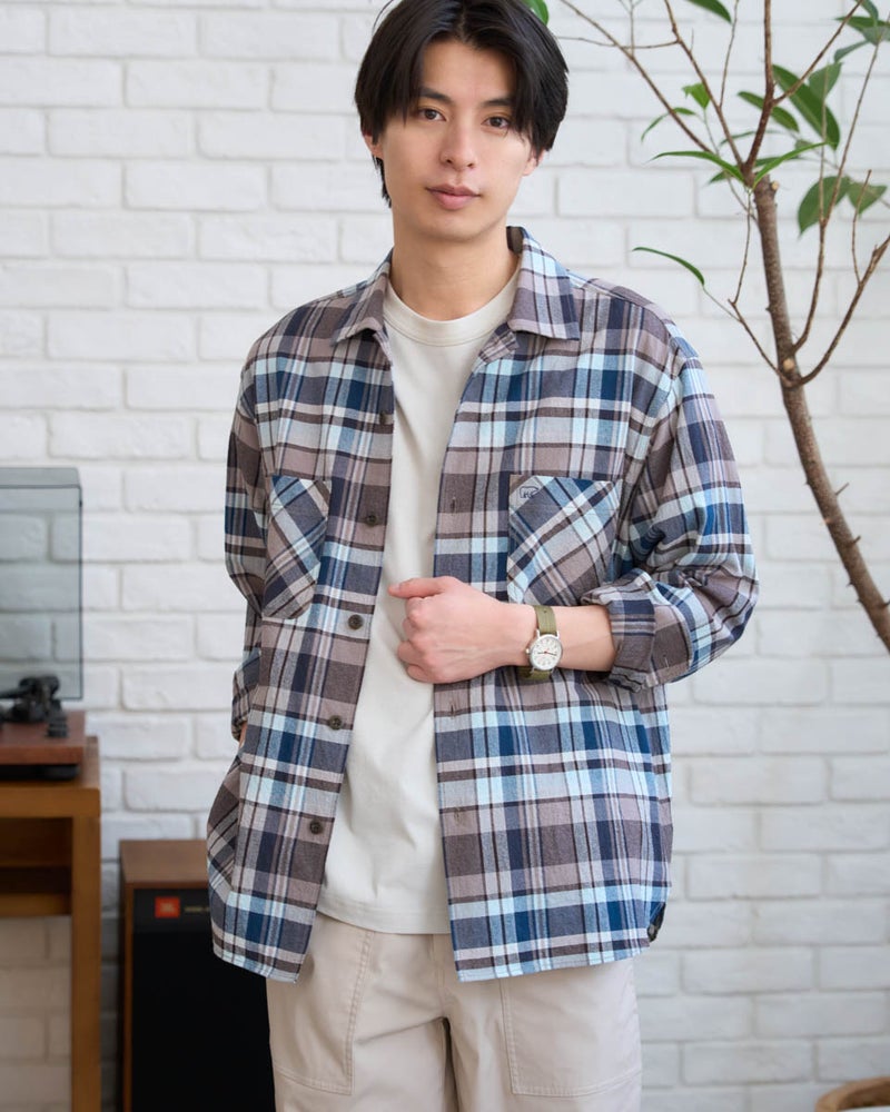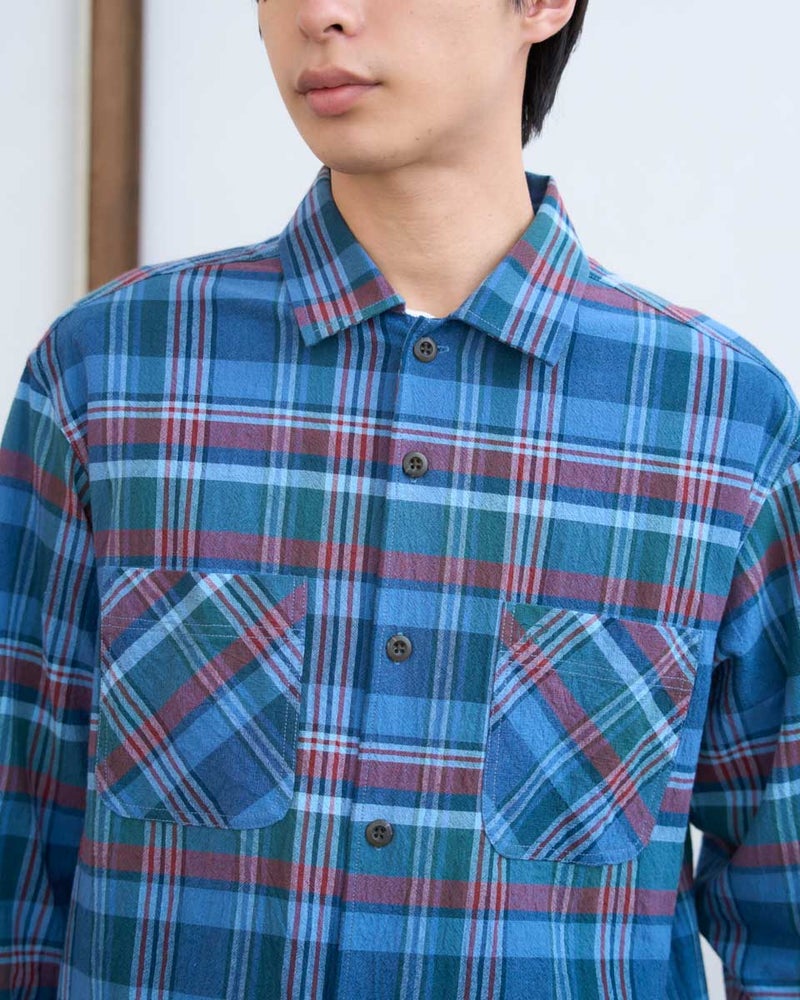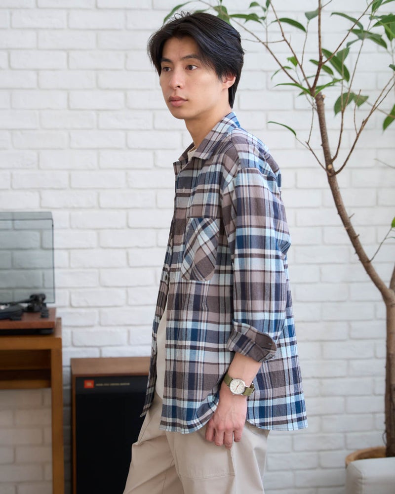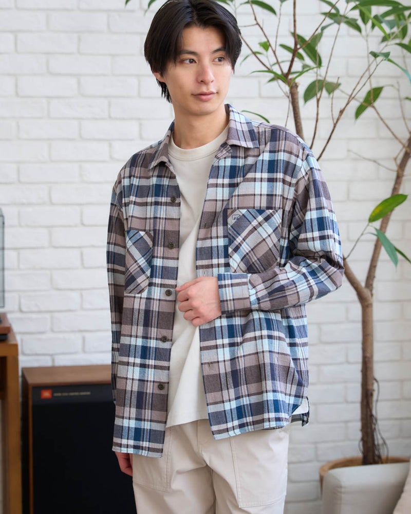 先染めチェックのシャツアウターです。強撚糸を使用しており、ドライタッチでさらっとした肌ざわりが特徴です。春の軽羽織りから、夏の紫外線対策まで長い期間で着用いただけます。カーゴパンツやデニムとの相性よく、カジュアルスタイルがおすすめです。
