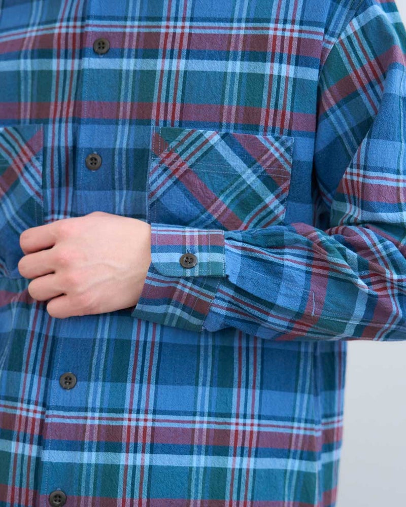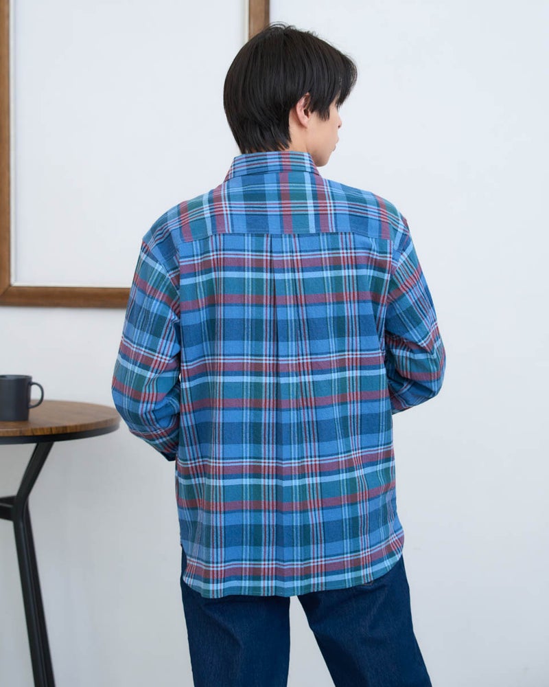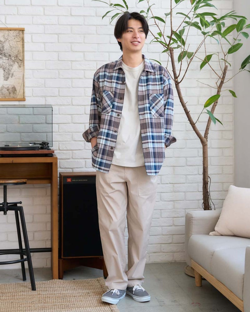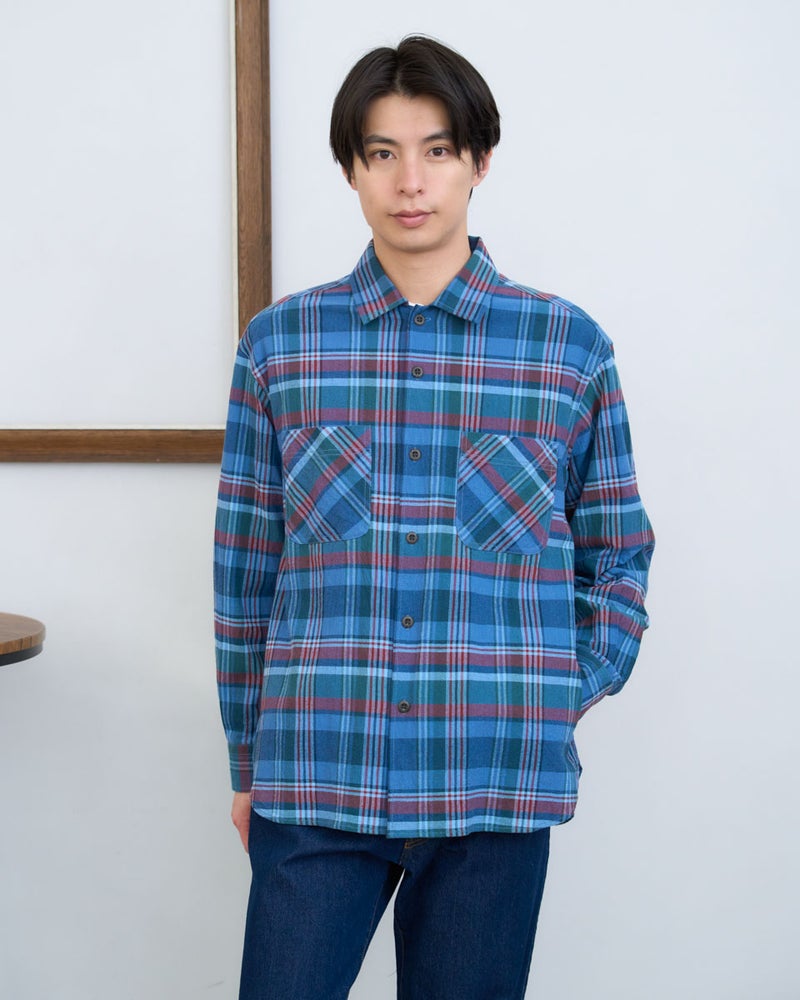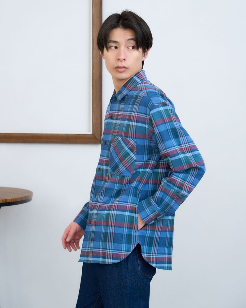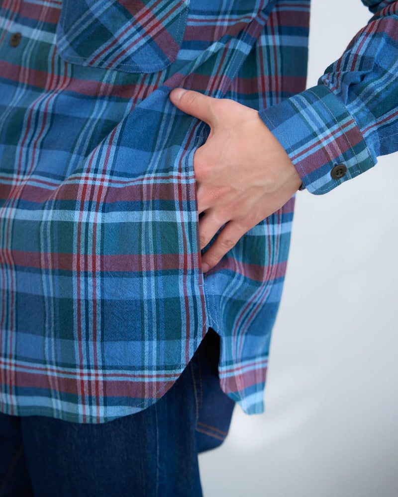 先染めチェックのシャツアウターです。強撚糸を使用しており、ドライタッチでさらっとした肌ざわりが特徴です。春の軽羽織りから、夏の紫外線対策まで長い期間で着用いただけます。カーゴパンツやデニムとの相性よく、カジュアルスタイルがおすすめです。