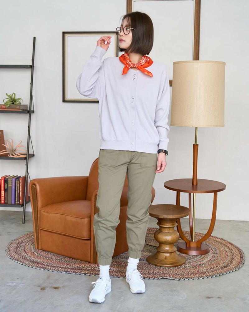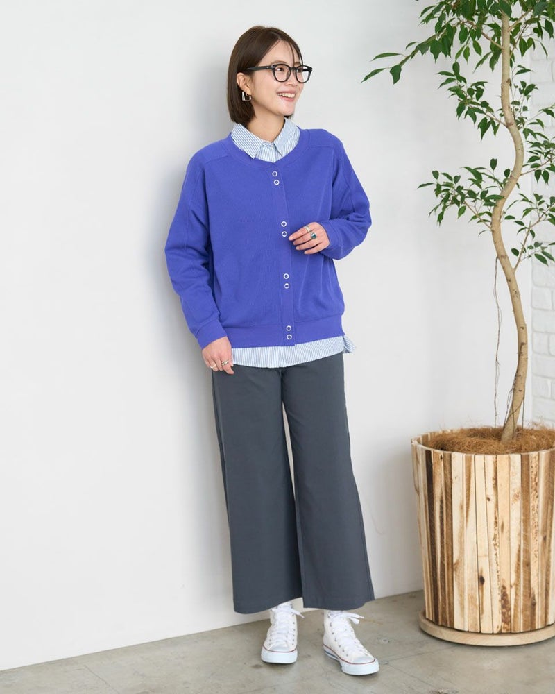 張り抜きテレコを使用したカーディガンです。前身のスナップボタンの配置がポイントです。しっかりとした素材で長いシーズン着用できるアイテムです。 モデル身長: 167 cm 着用サイズ: M サイズ Golden Bear WOMEN カットソー (WOMEN) 【着用アイテム】468R3351 ストライプシャツ 467R3710 ジョガーパンツ 467R3711 ガウチョパンツ