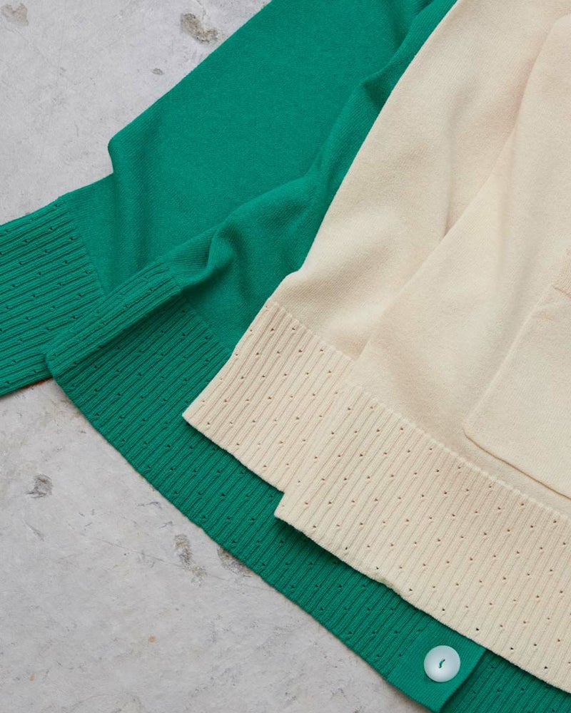 サッと羽織りやすいゆとりのあるシルエットのカーディガンです。 Vネックなのですっきり着用できます。裾リブのアイレットがデザインポイントです。Tシャツ合わせやタンクトップ合わせなどさまざまな用途で活躍します。 モデル身長: 167 cm 着用サイズ: M サイズ Golden Bear WOMEN ニット (WOMEN) 【着用アイテム】467R2332 ダンガリーシャツ 467R2402 プリントTシャツ 467R3403 ボーダーTシャツ 467R2702 カーゴスカート 467R2001 スカーフ